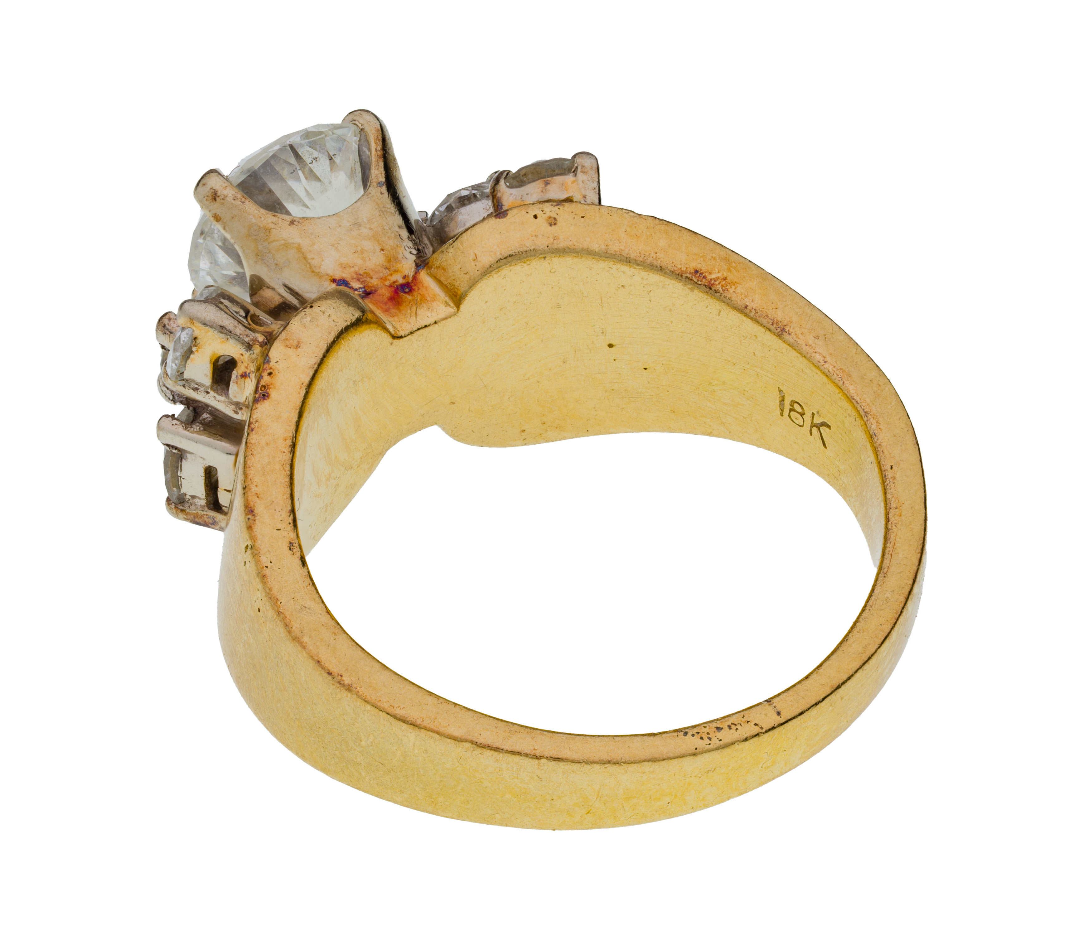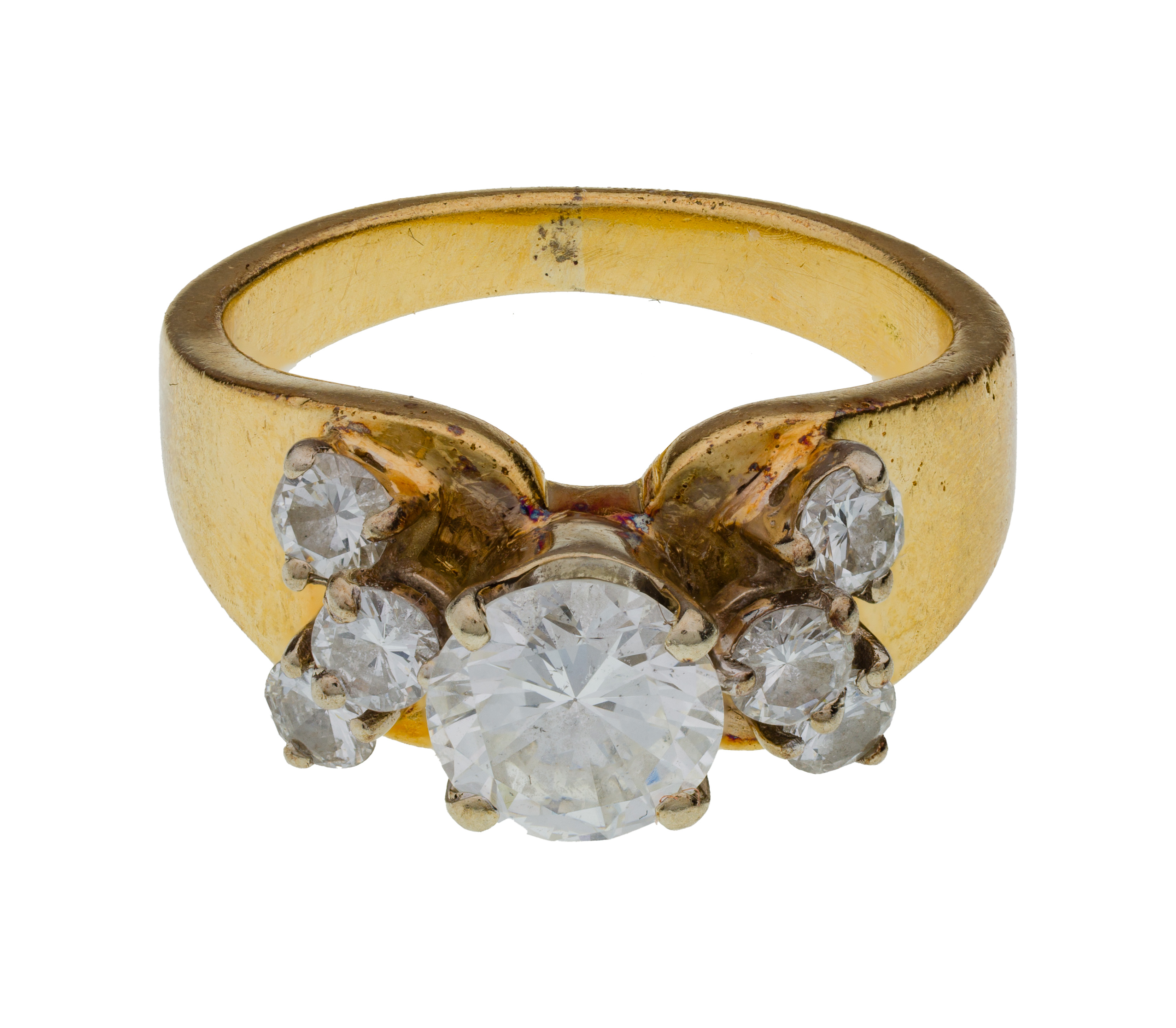 A center round cut diamond, approximately 1.05 carats (6.56 x 4.02mm), G/H color, SI clarity, flanked on each side by a total of six round cut diamonds, approximately 0.12 carat each (marked ’18k’)