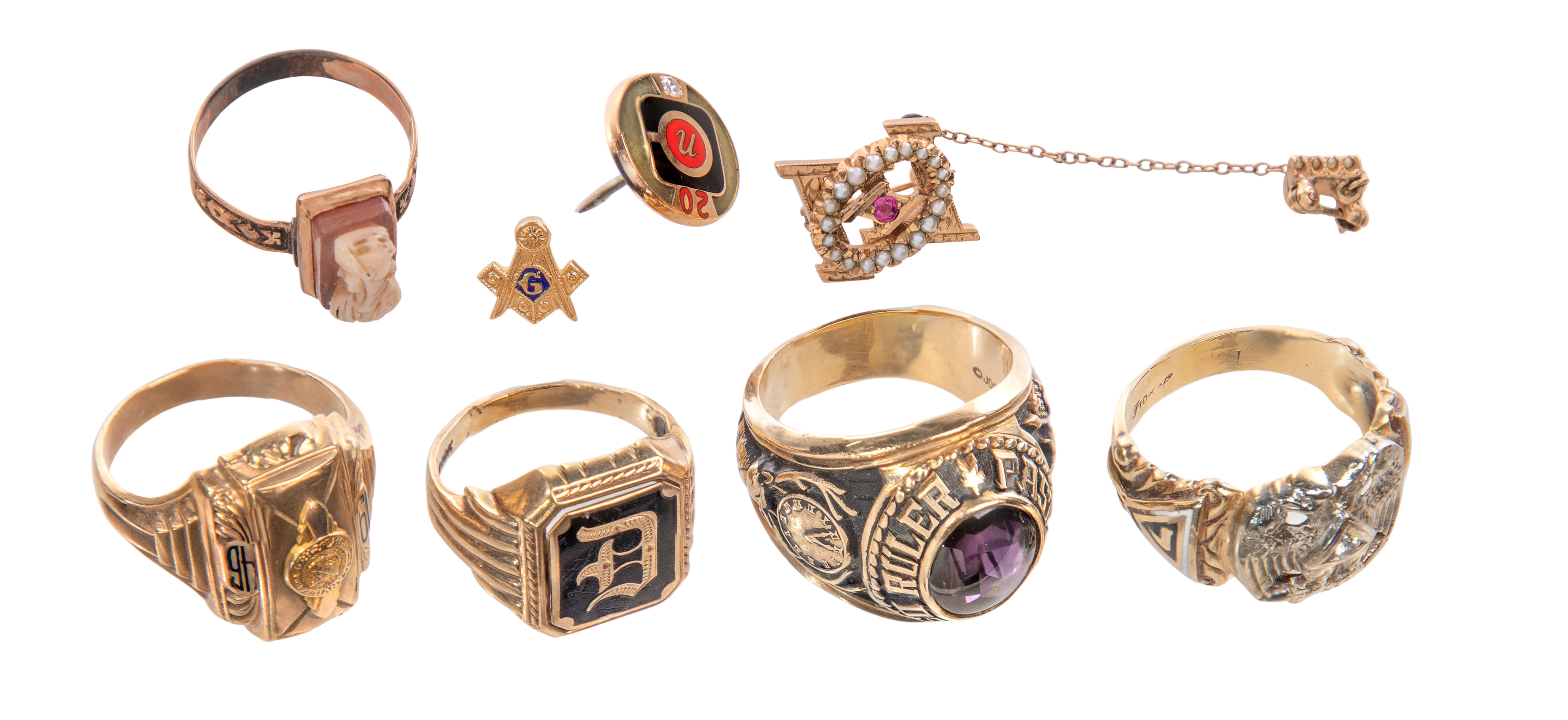 (8) items including (5) rings, a service pin and (2) fraternal pins (most marked ’10k’)