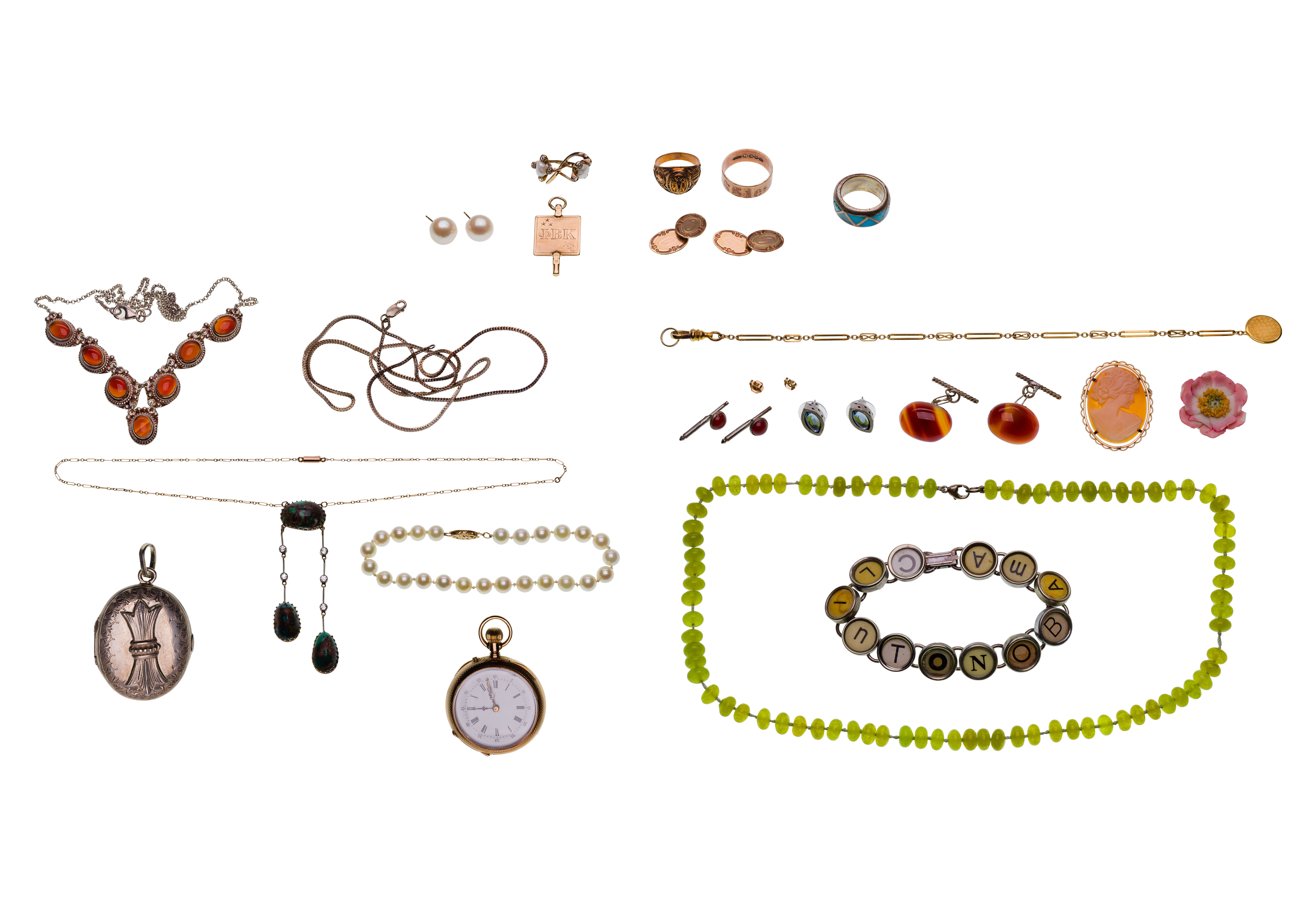 Including a pearl bracelet, a pocket watch and a pair pearl stud earrings (most marked ’14k’), a band ring, a school ring, a pair of cufflinks, a pair of pearl pierced earrings and a fraternal charm (most marked ’14k’), a necklace (marked ‘9c’), (2) necklaces and a turquoise ring (most marked ‘925’ / ‘sterling’) and a locket (unmarked 830 silver) as well as an assortment of costume jewelry including a peridot bead necklace