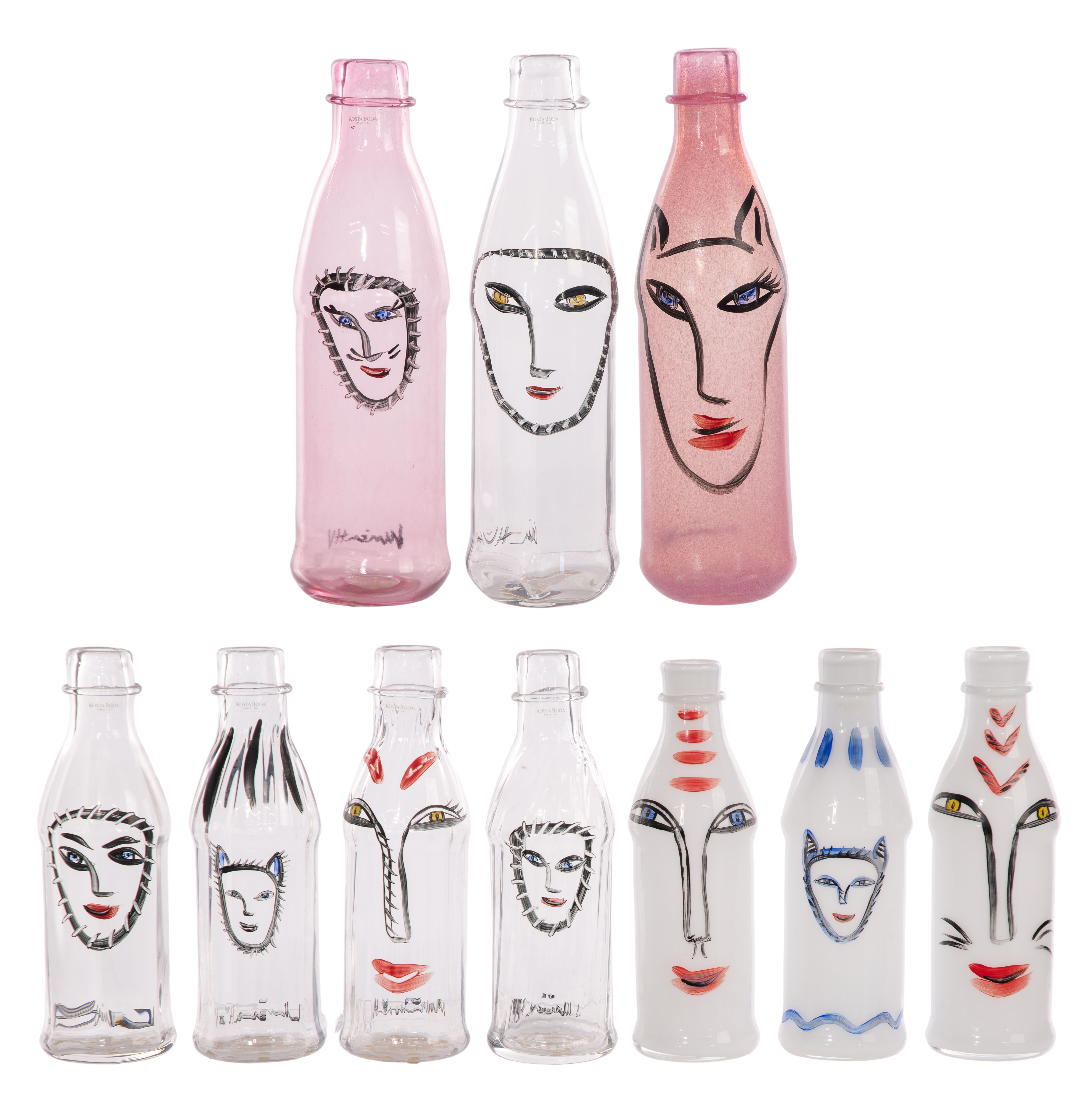 (10) limited edition hand blown glass bottles in various shapes, colors and designs, having enameled faces, all signed