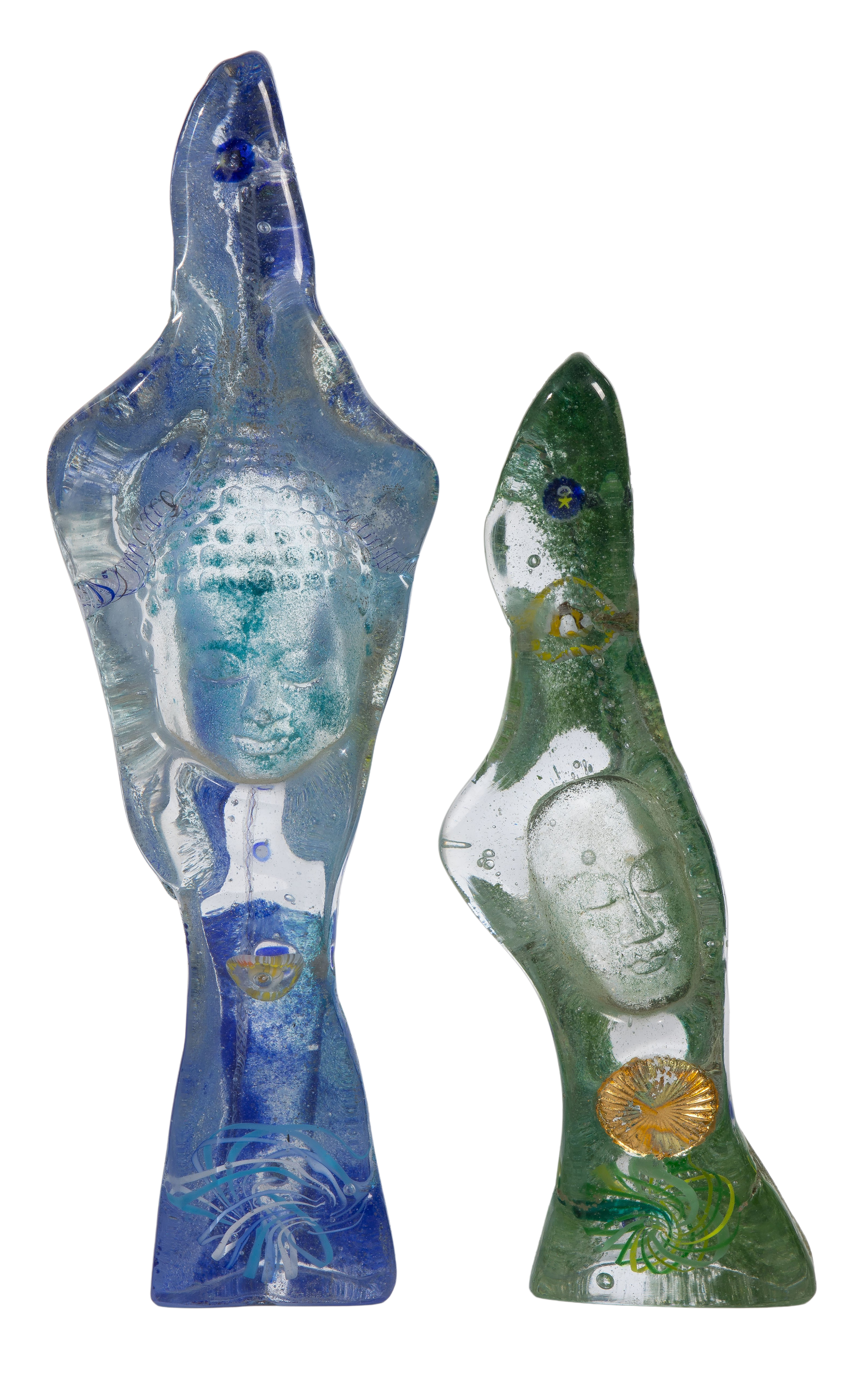(2) sculptures having iridescent quality, Buddha faces and polymer clay strands throughout as well as some caning