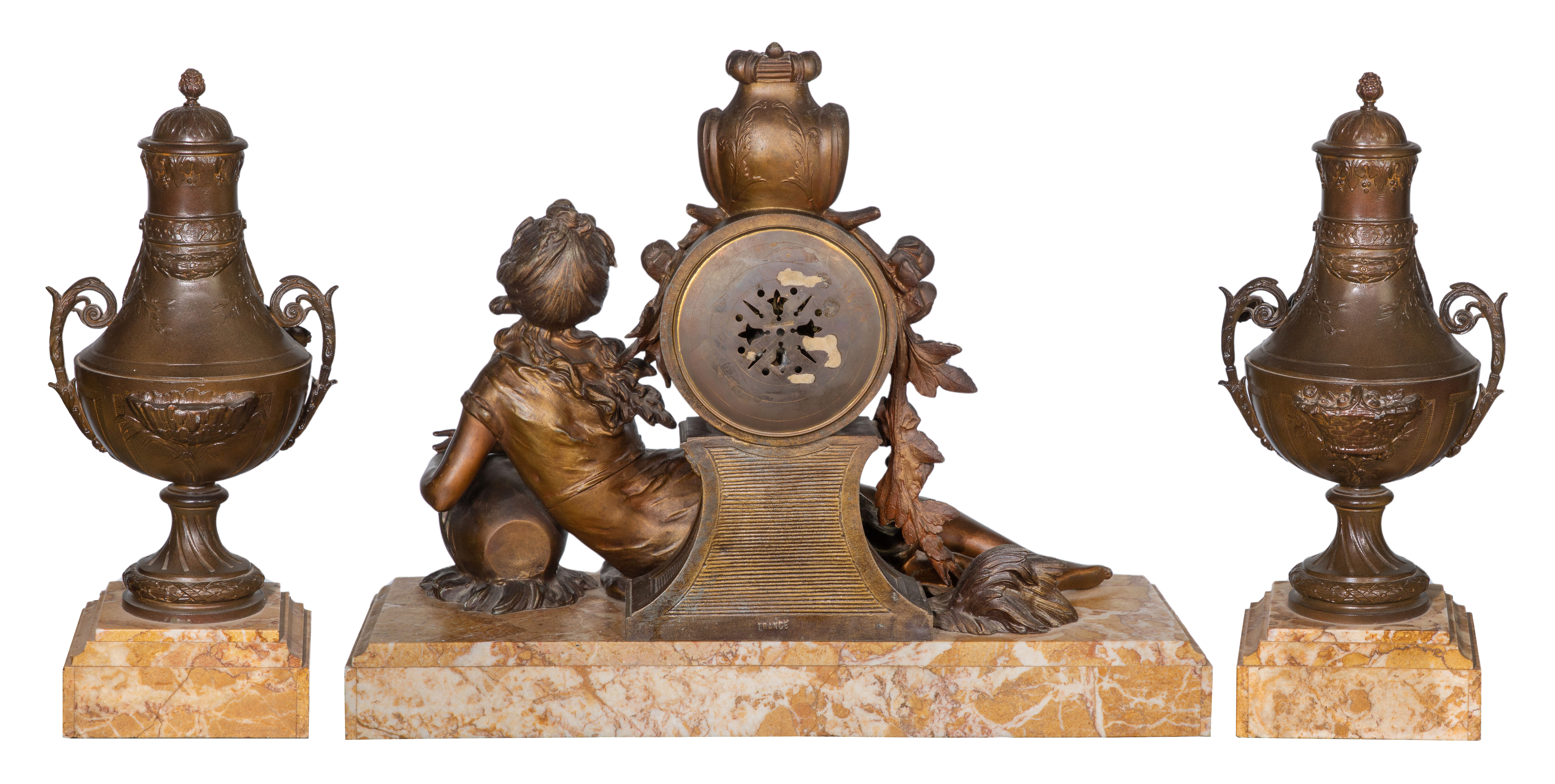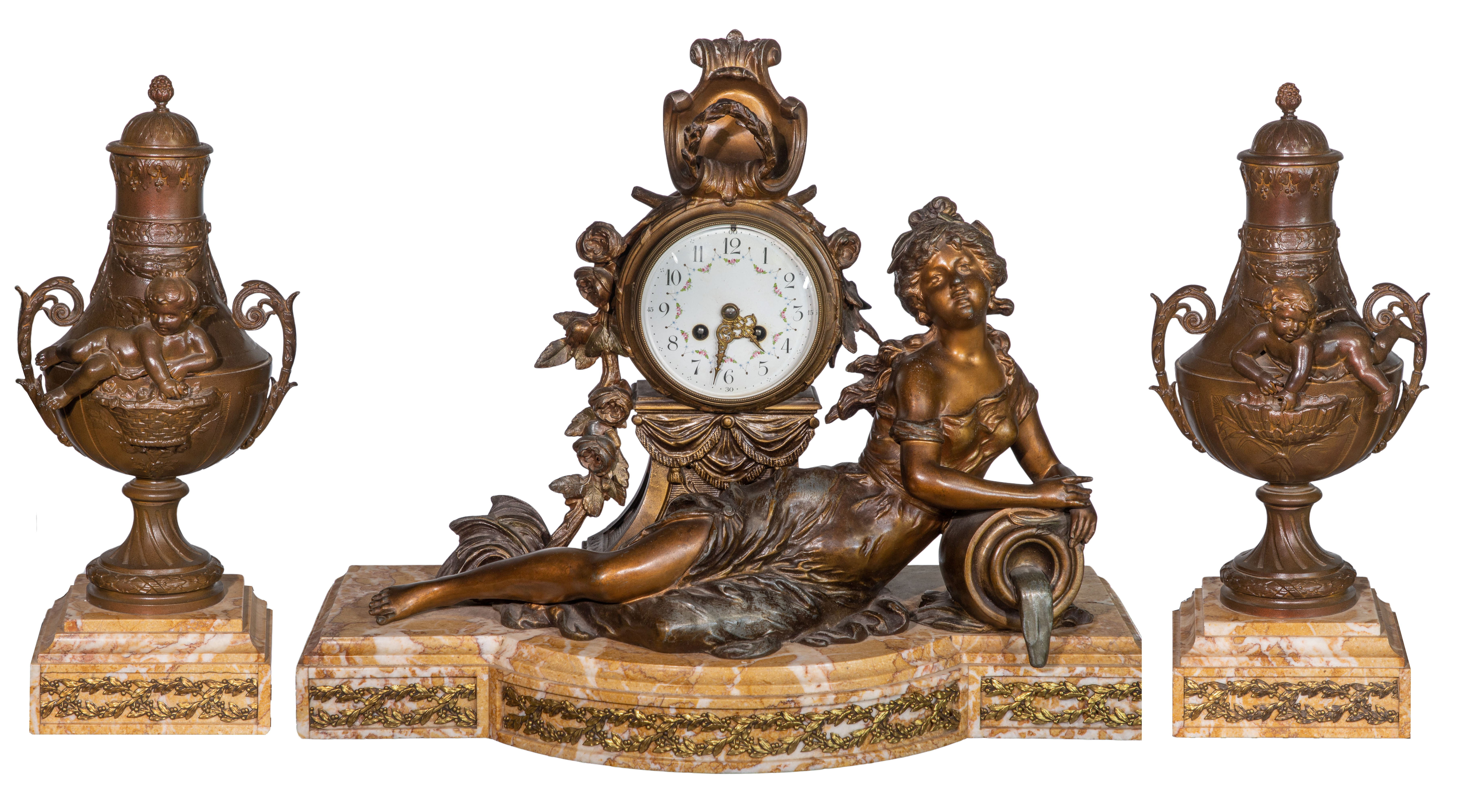 3-piece set including a figural clock signed L & F Moreau having a reclining woman leaning on a jug spewing water, white enamel face set on a marble plinth having floral accents, no key and matching cherub accented urn garnitures set on marble plinths