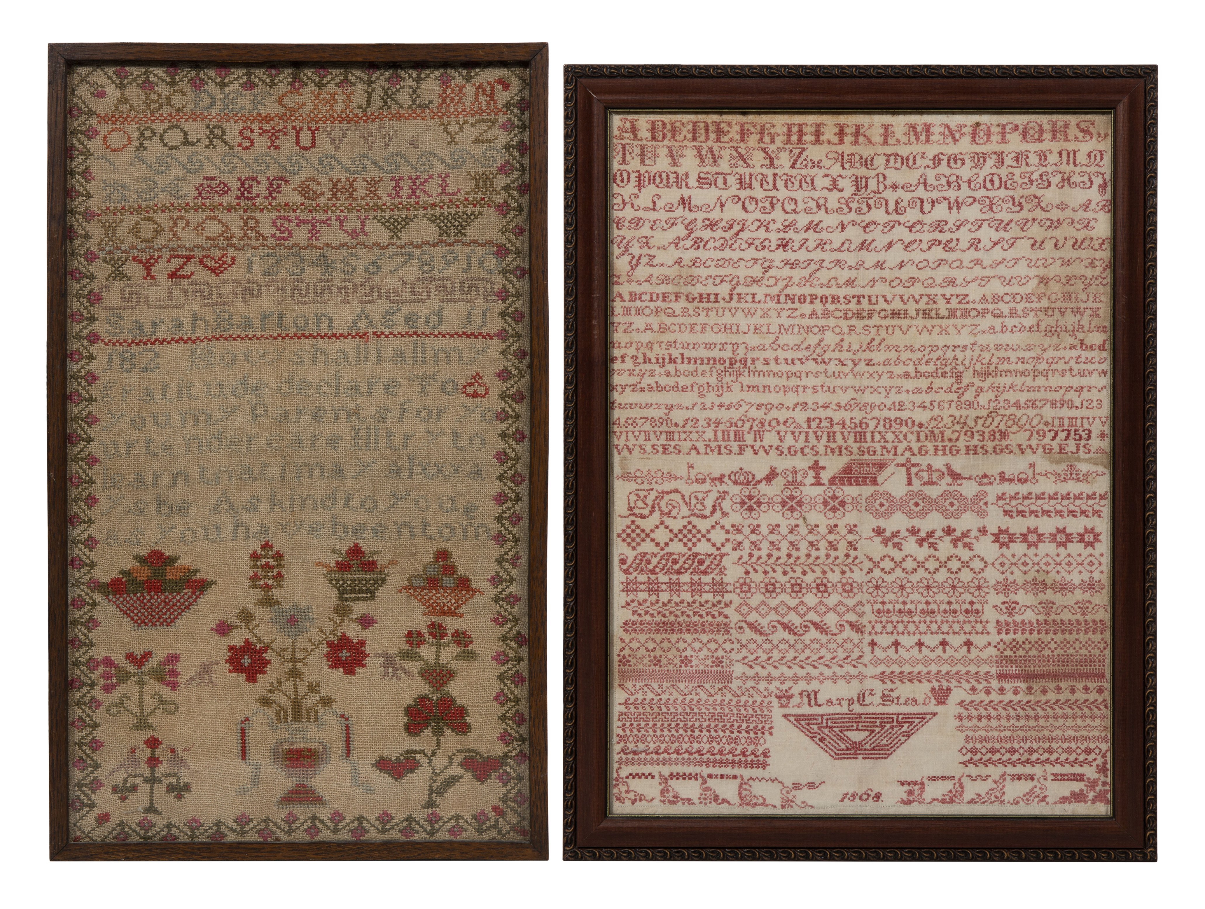 (2) items including the taller by Sarah Barton, aged 11, 1820s as well as a finely stitched by Mary C. Stead dated 1868, both behind glass in wood frames