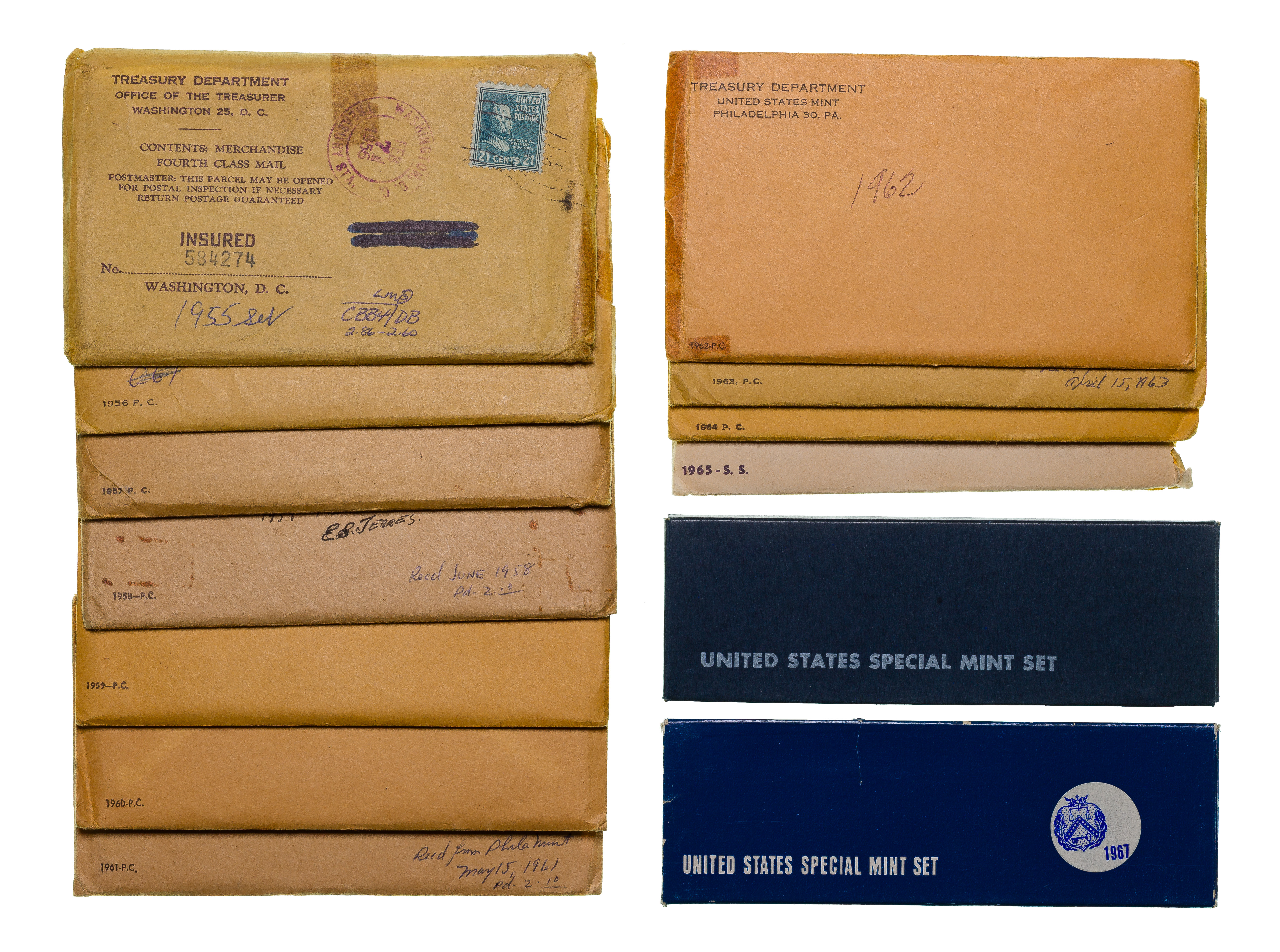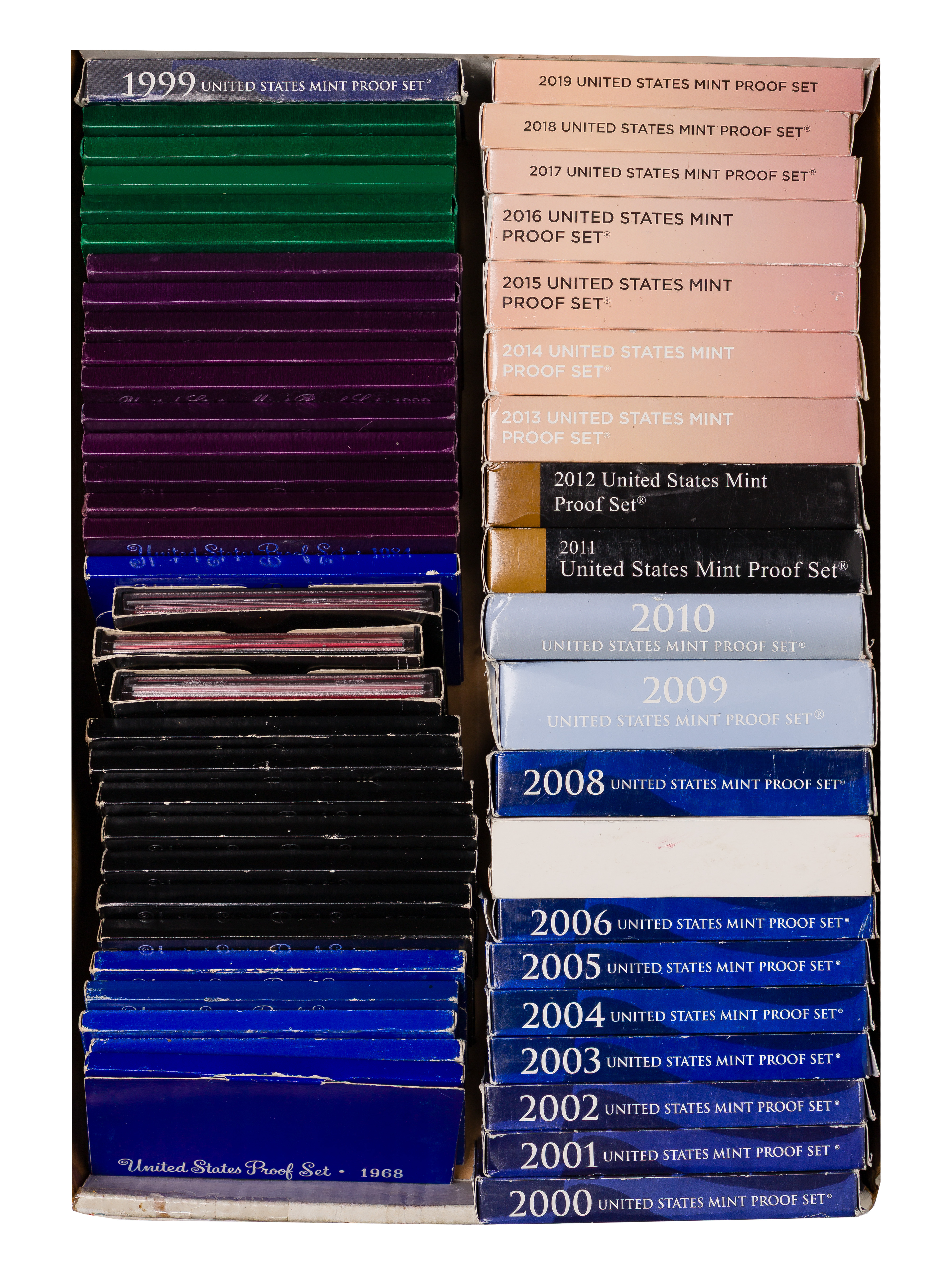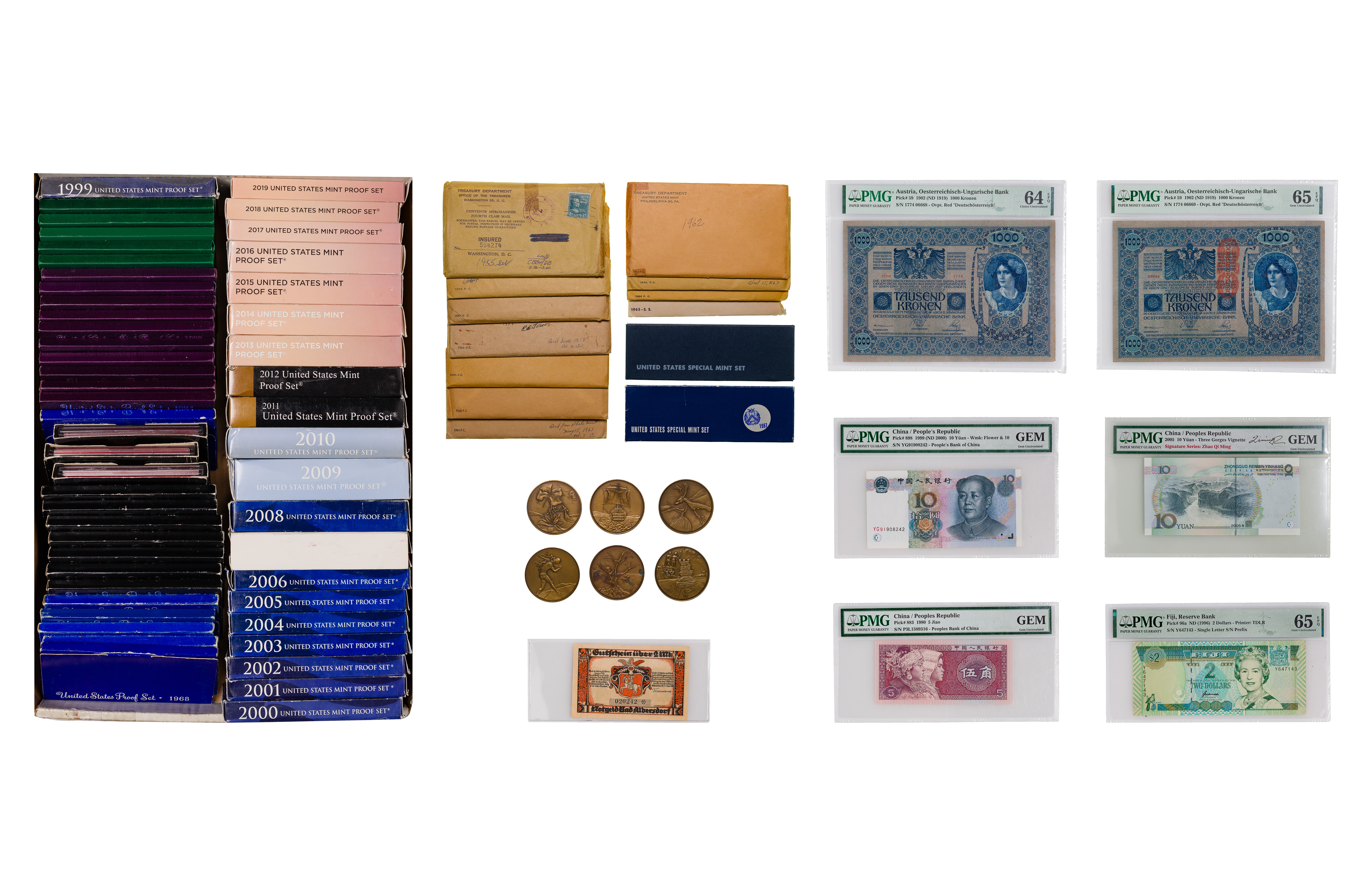 Including proof sets from 1955 through 1964 in original envelopes and boxed sets from 1965 through 2019; together with PMG graded foreign currency and (6) bronze tokens
