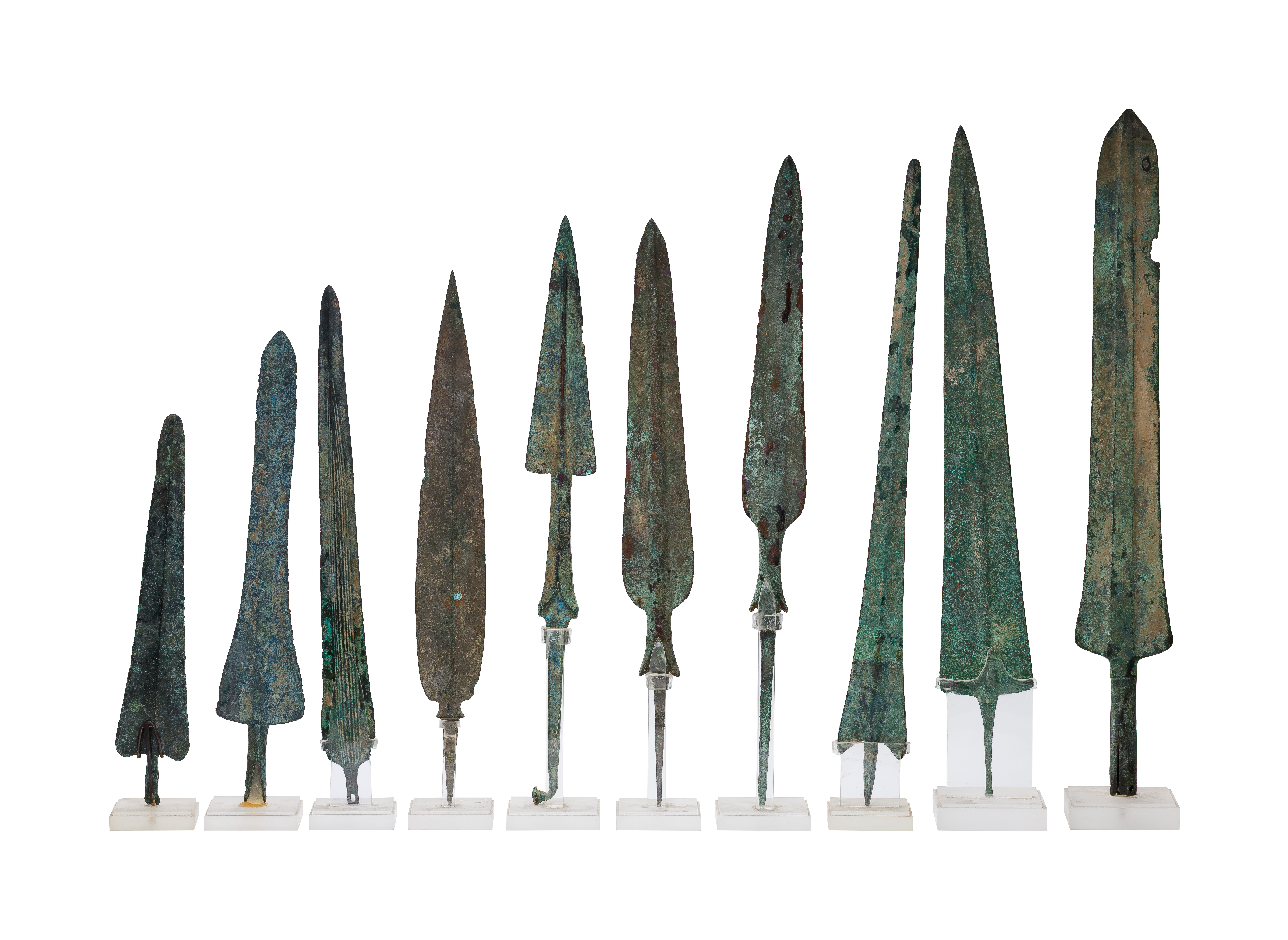 (10) items from the Phoenician Marlik culture, bronze spear projectile heads having bi-facial blade in various shapes and sizes, all having individual stands, invoices from The Merrin Gallery, New York