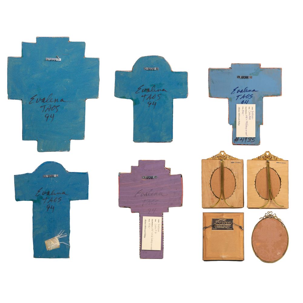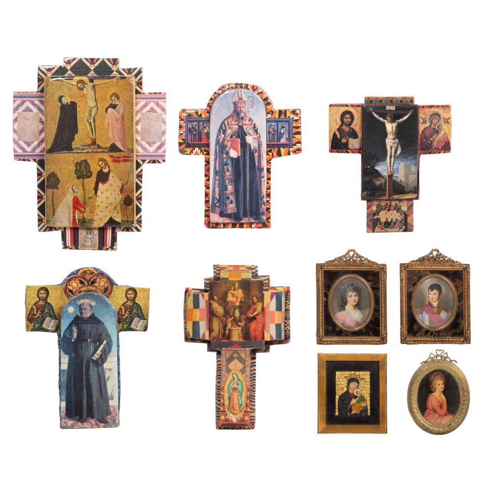(9) total items including (5) 1994, signed, decoupaged crosses in the Orthodox style; together with a micro-mosaic Madonna and Child and (3) framed portrait miniatures