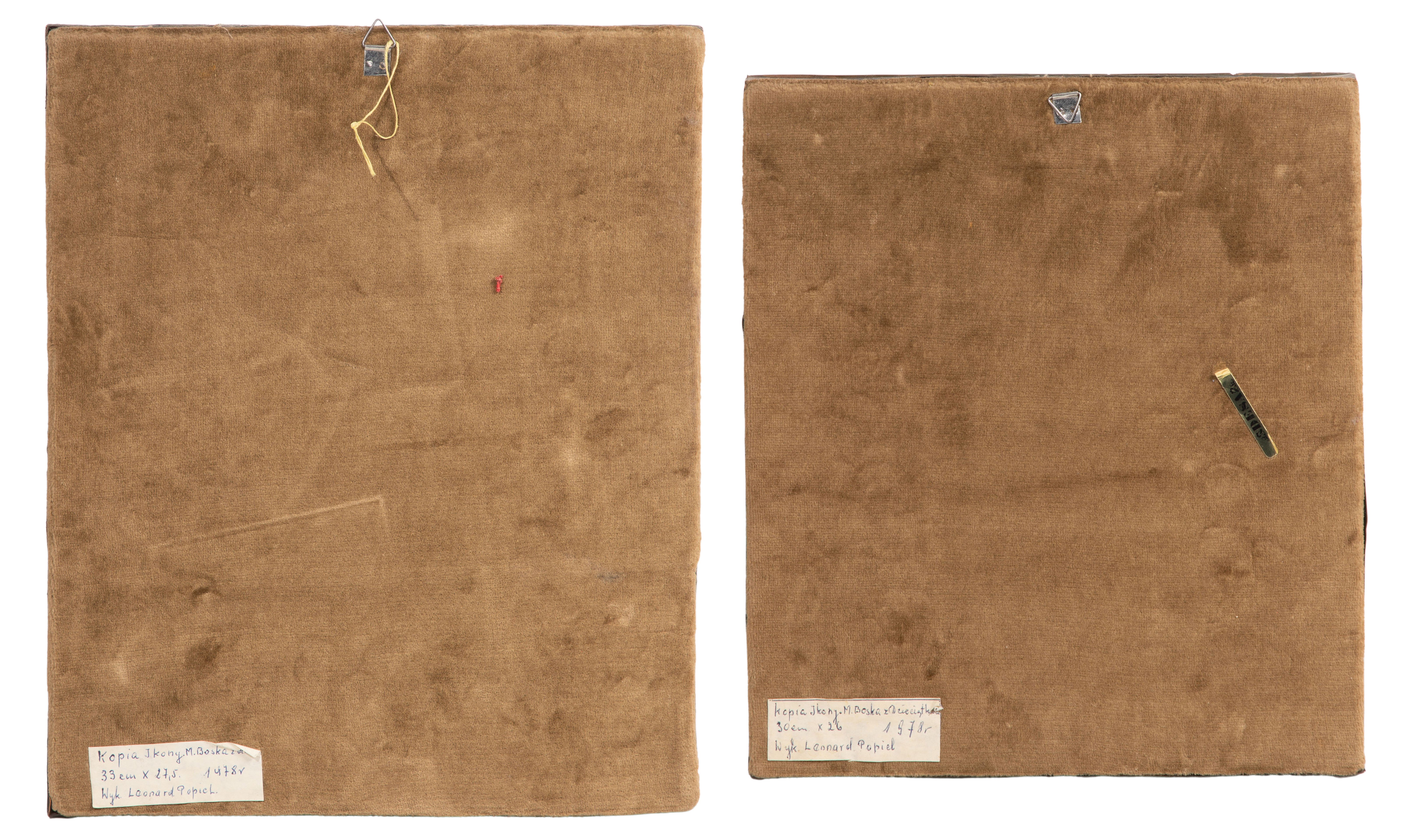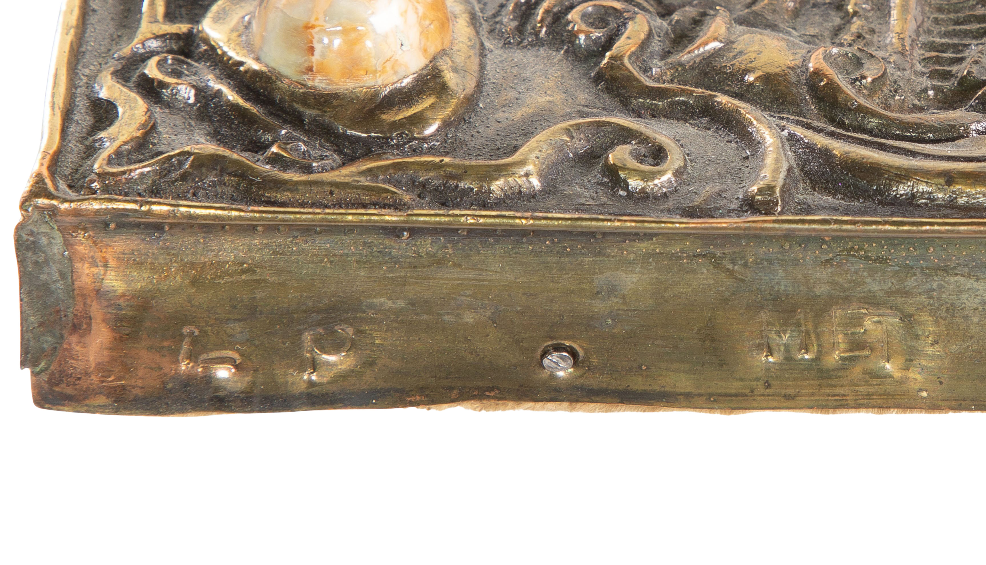 (2) items including a hand painted icon in a gilt metal and stone oklad, both depicting the Madonna and Child (smaller marked ‘MET’)