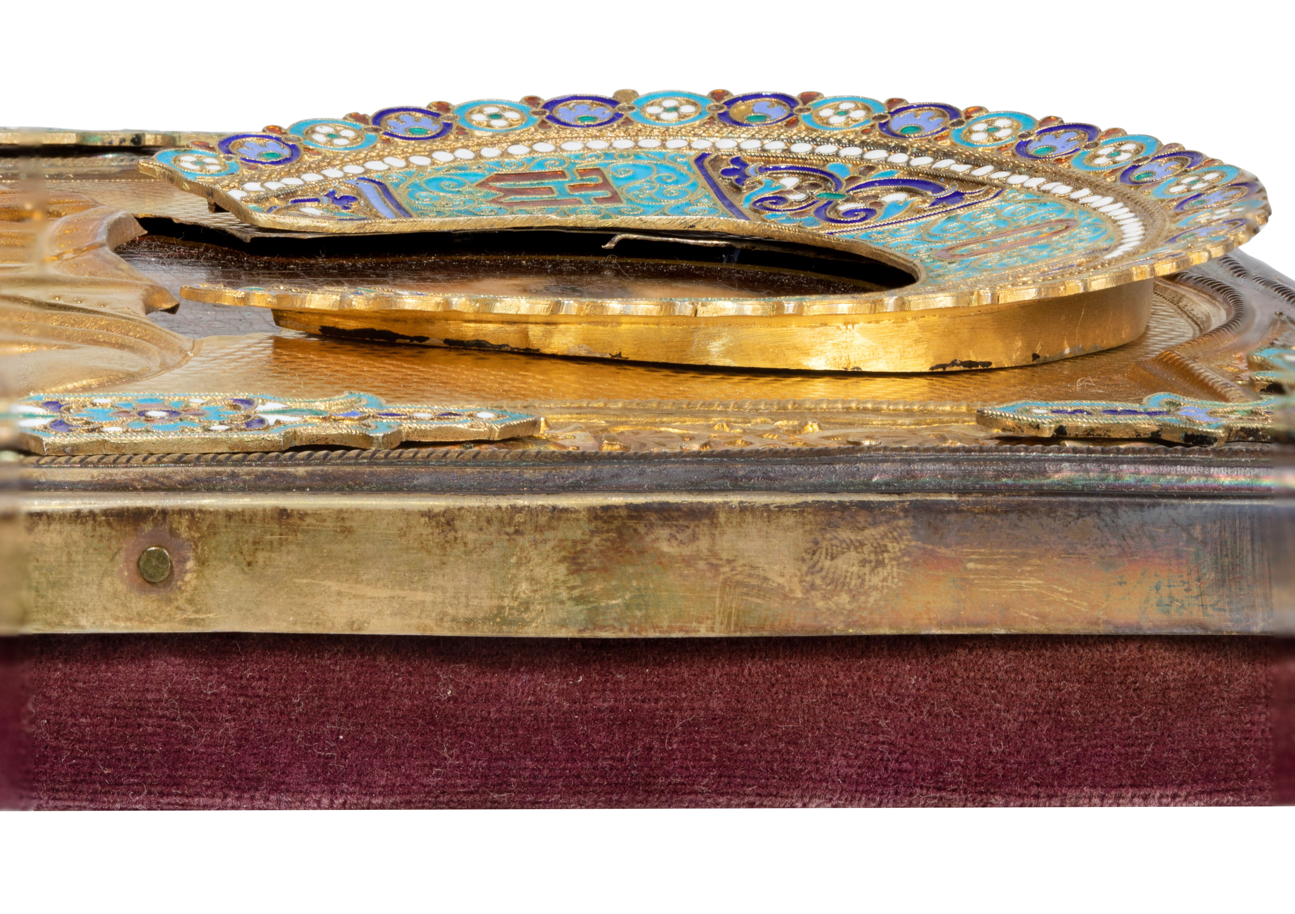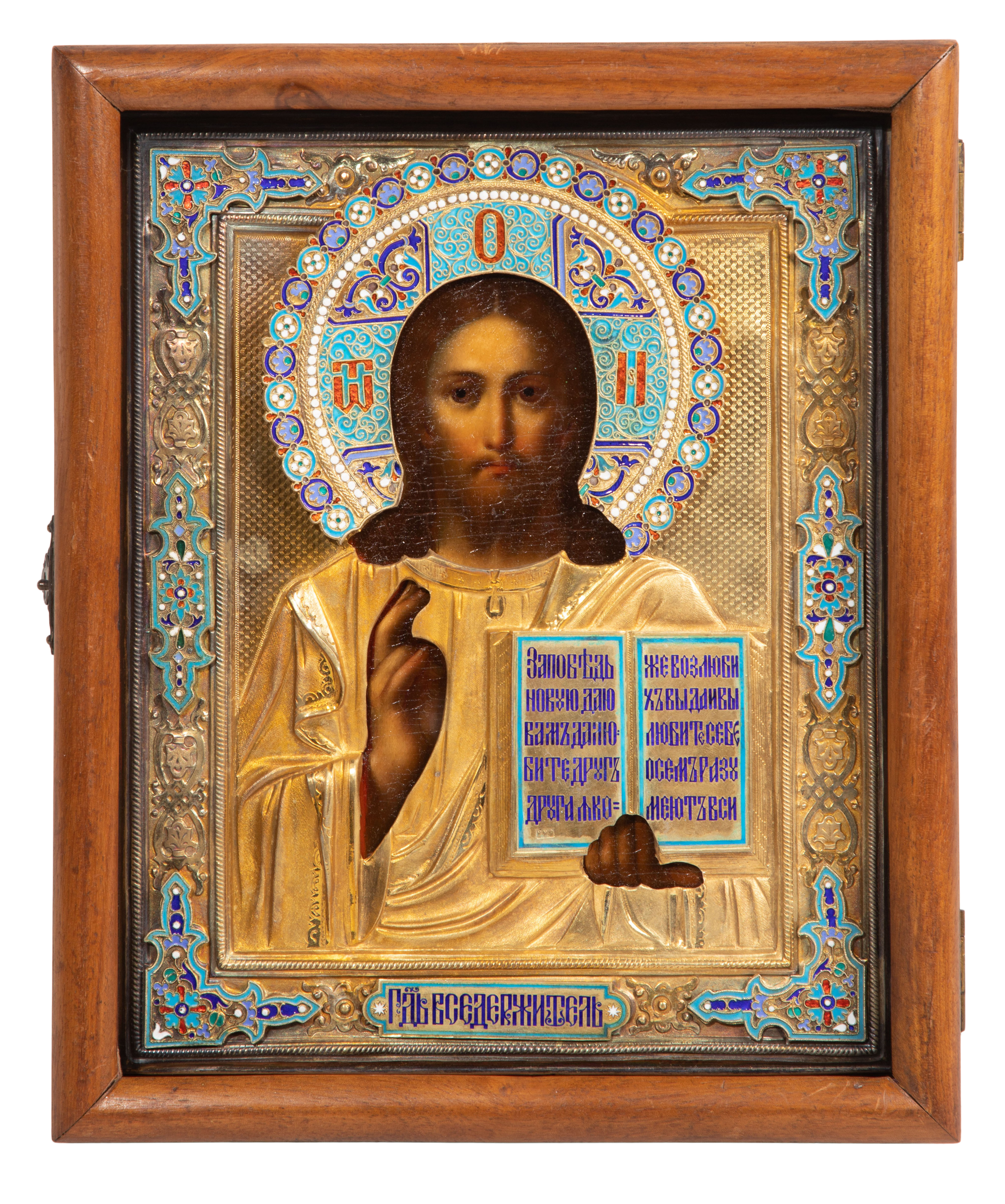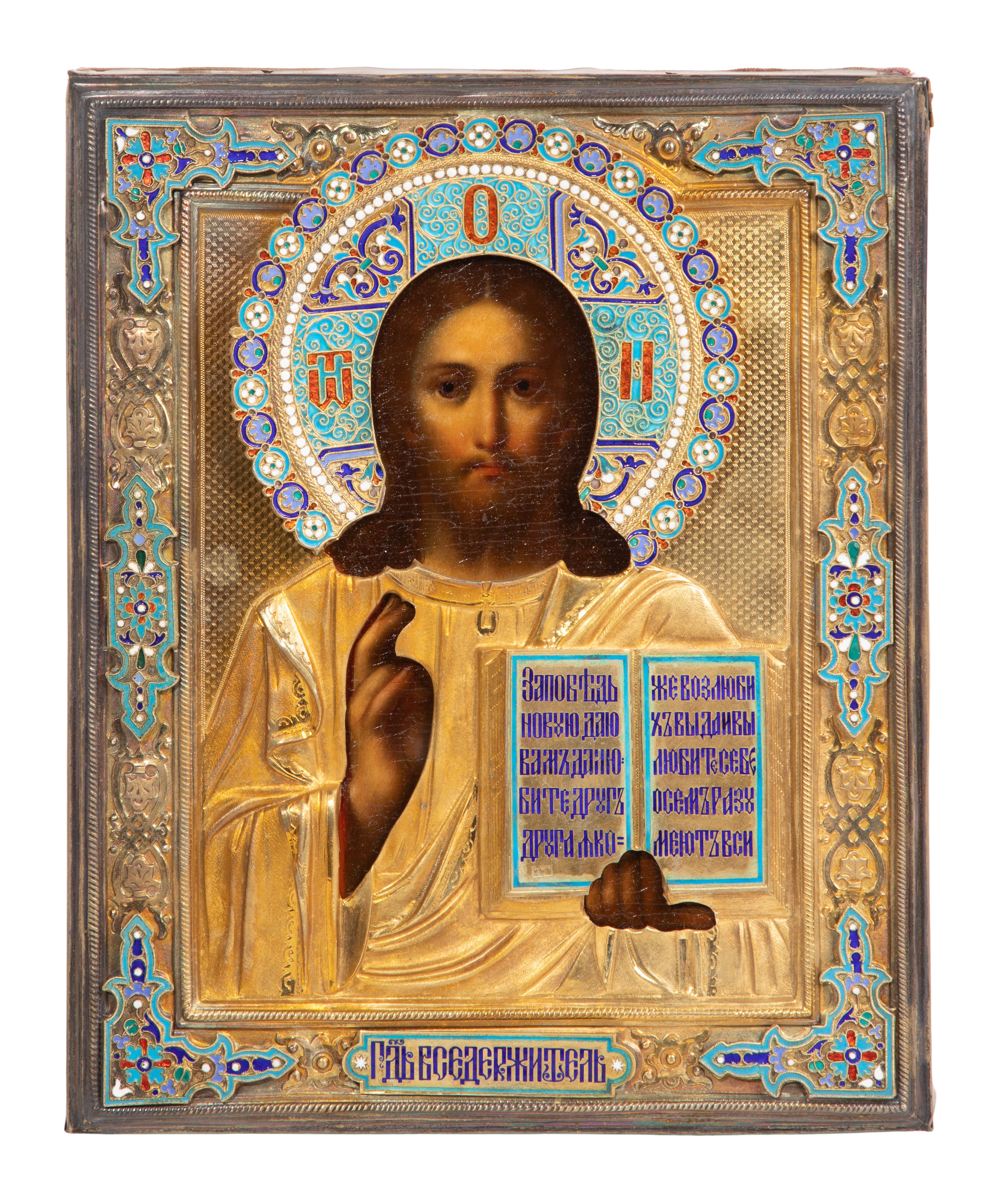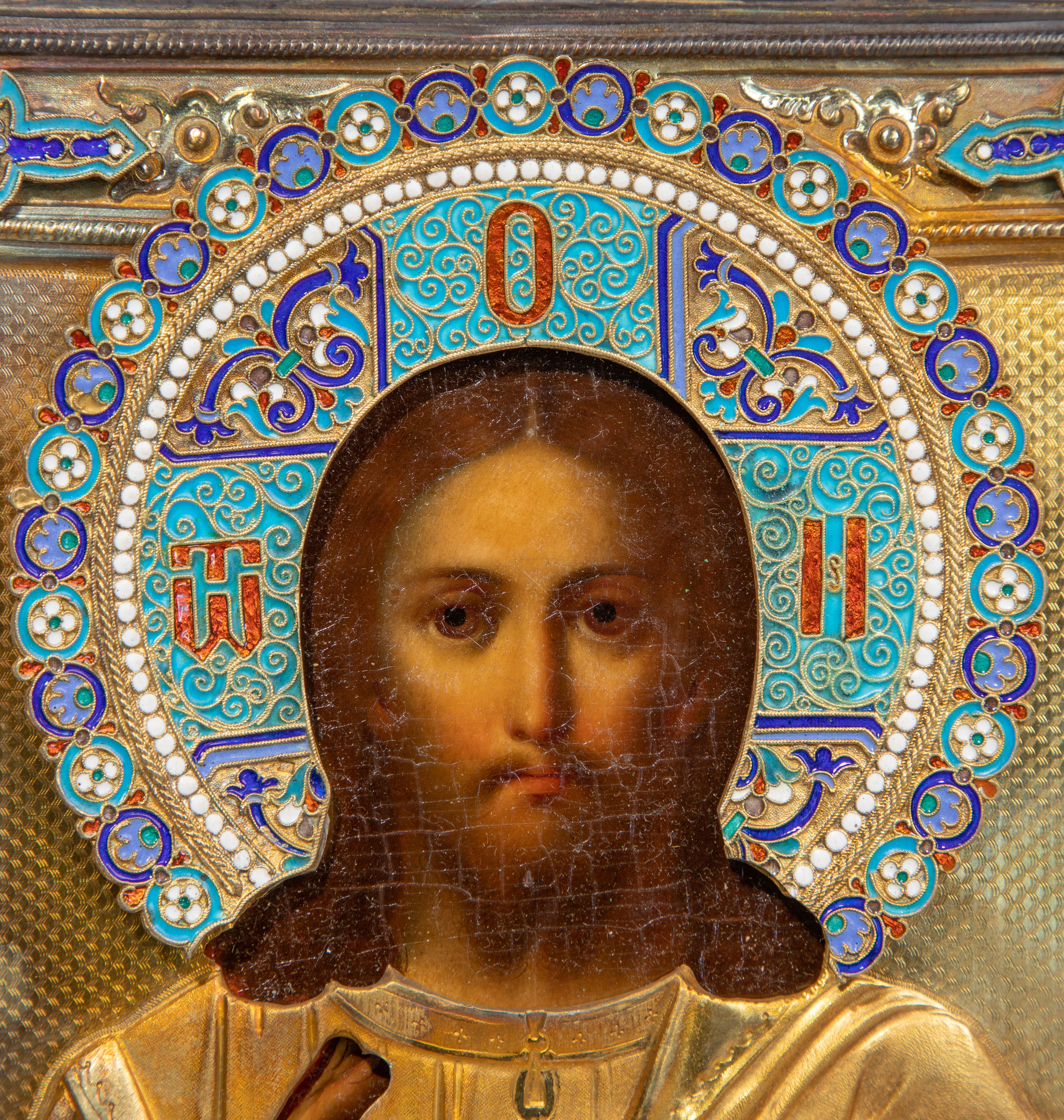 A hand painted icon of Christ the Pantocrator having cloisonne and champleve enamel and gilt silver, Lev Fridrikhovitch Oleks assay mark and unidentified maker in a fitted wood presentation box