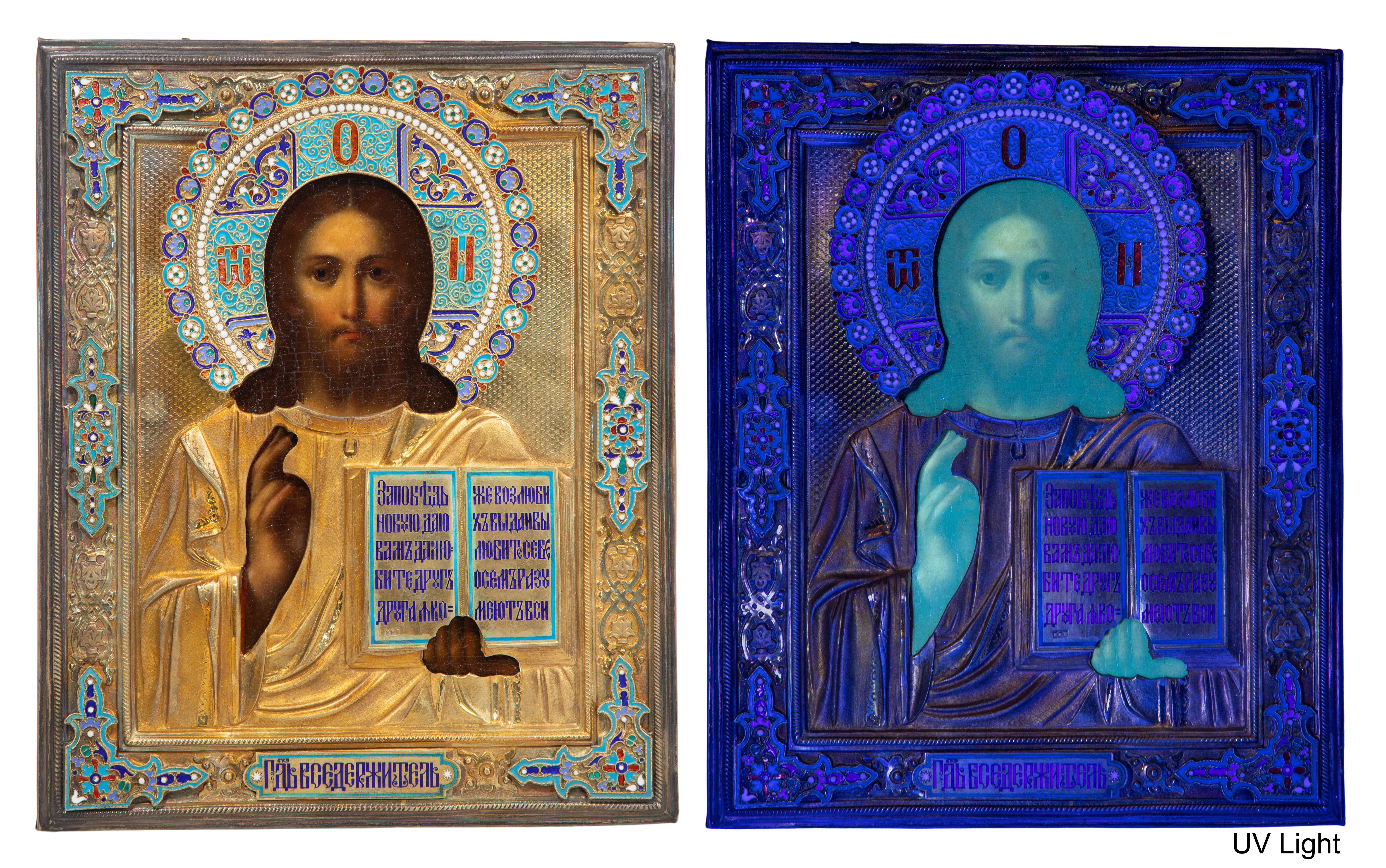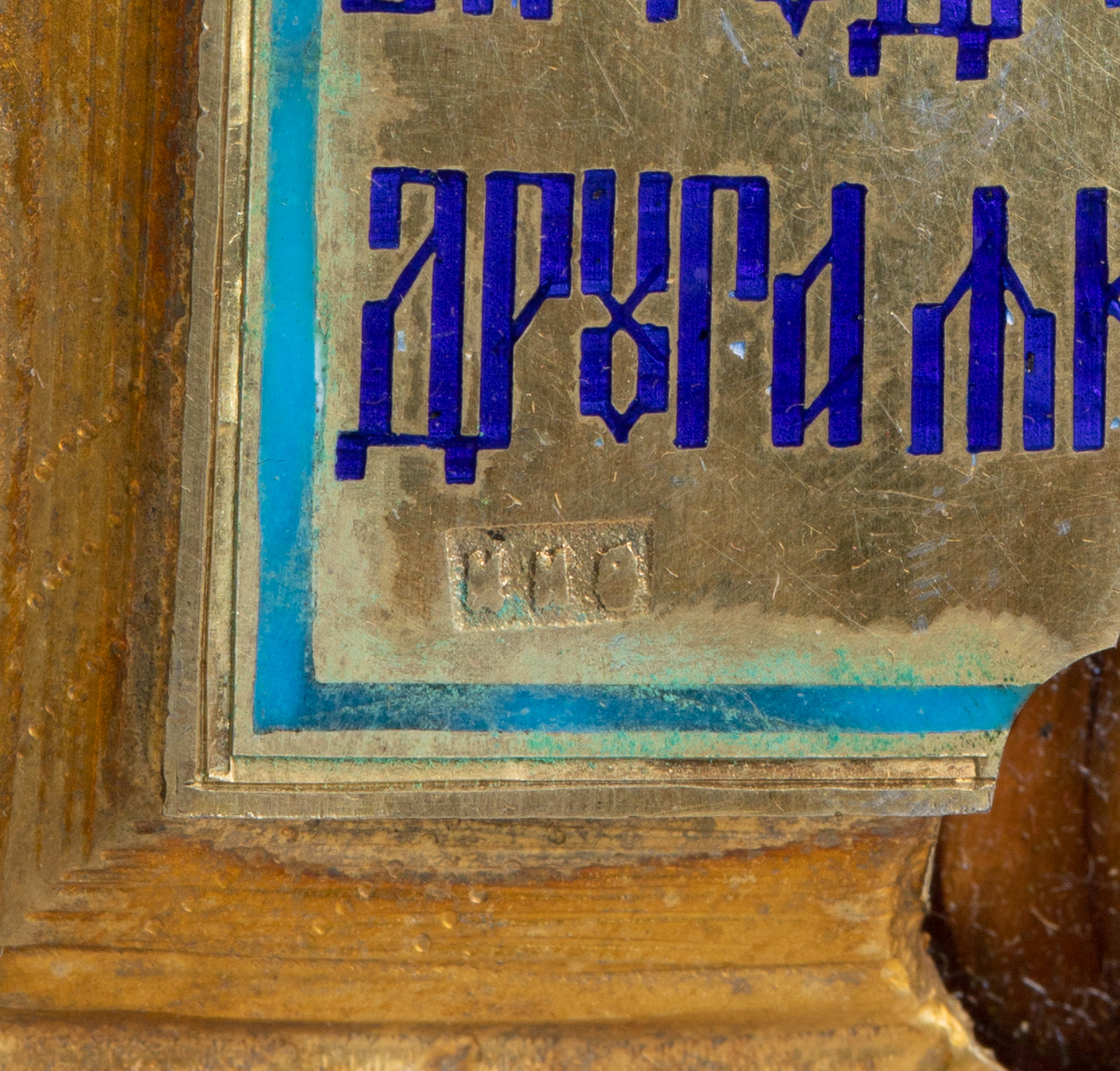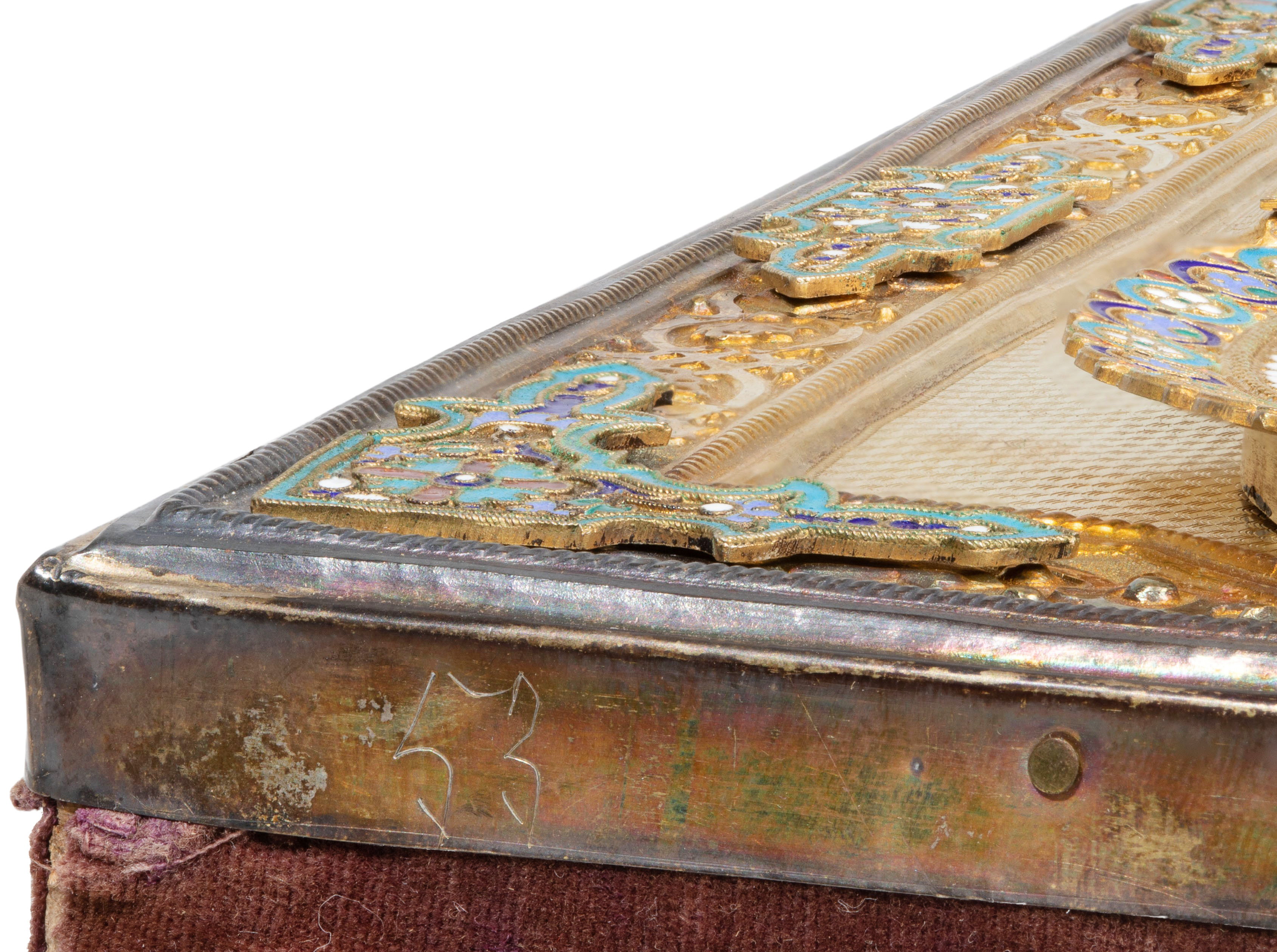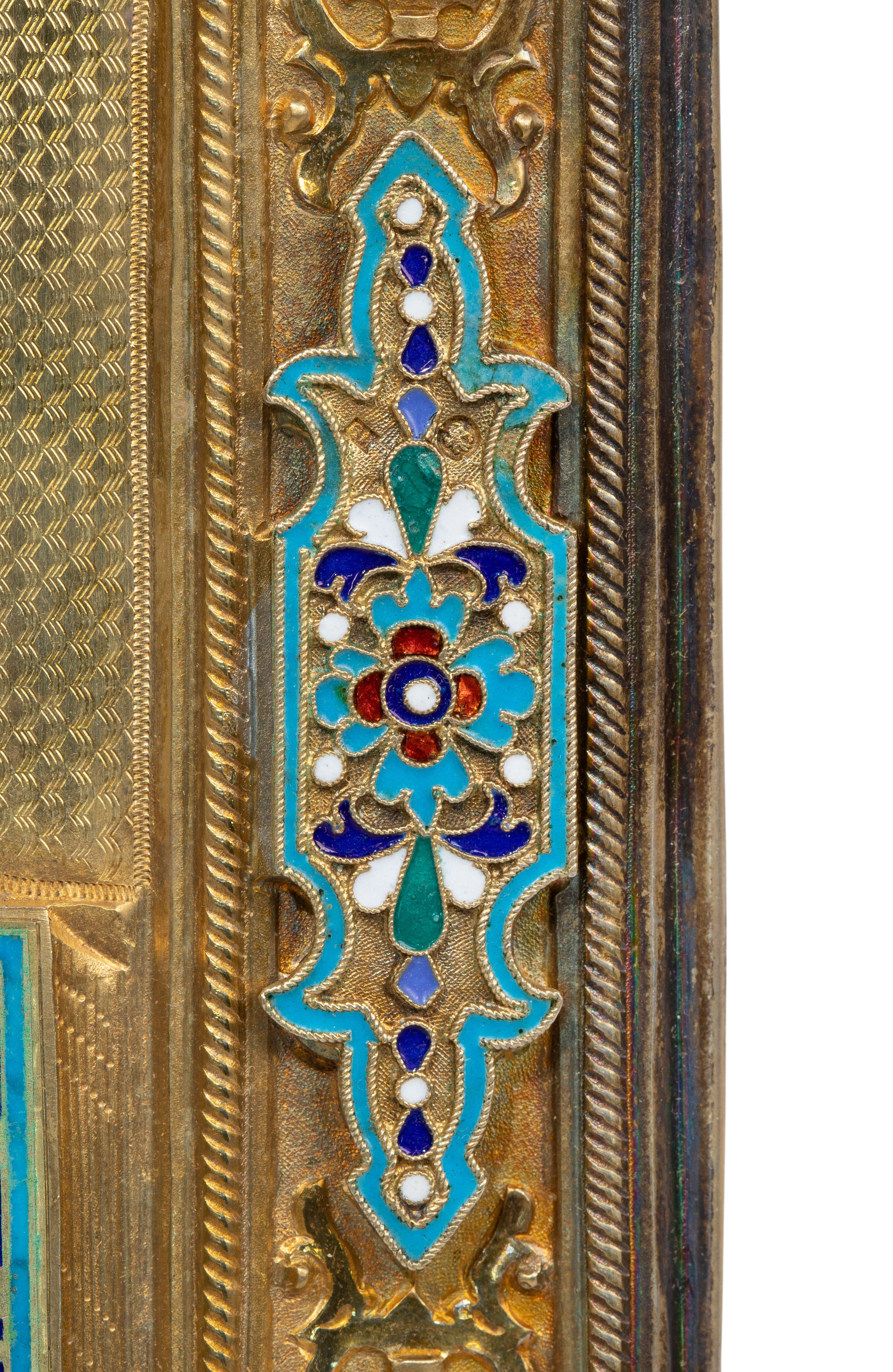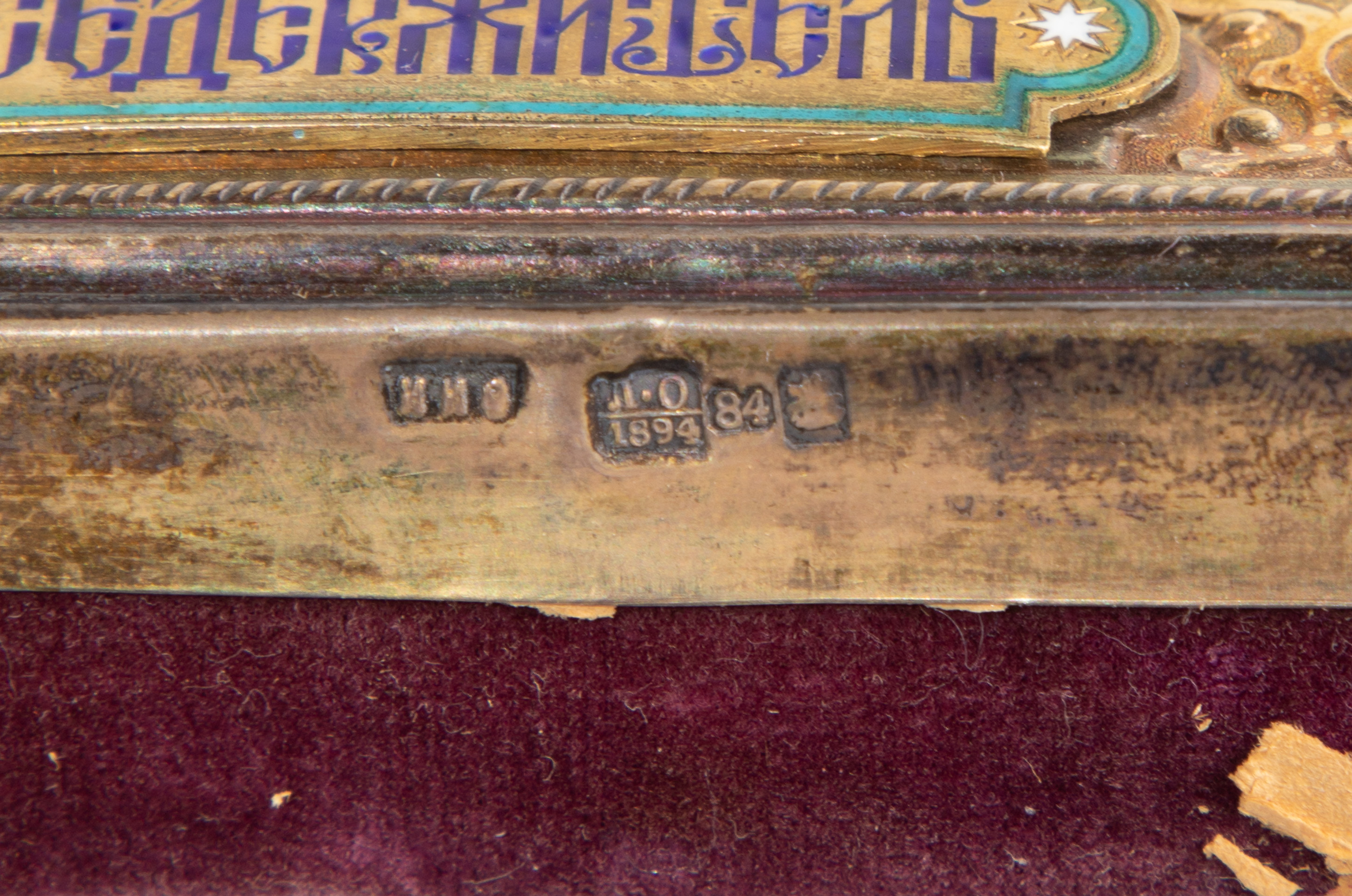 A hand painted icon of Christ the Pantocrator having cloisonne and champleve enamel and gilt silver, Lev Fridrikhovitch Oleks assay mark and unidentified maker in a fitted wood presentation box