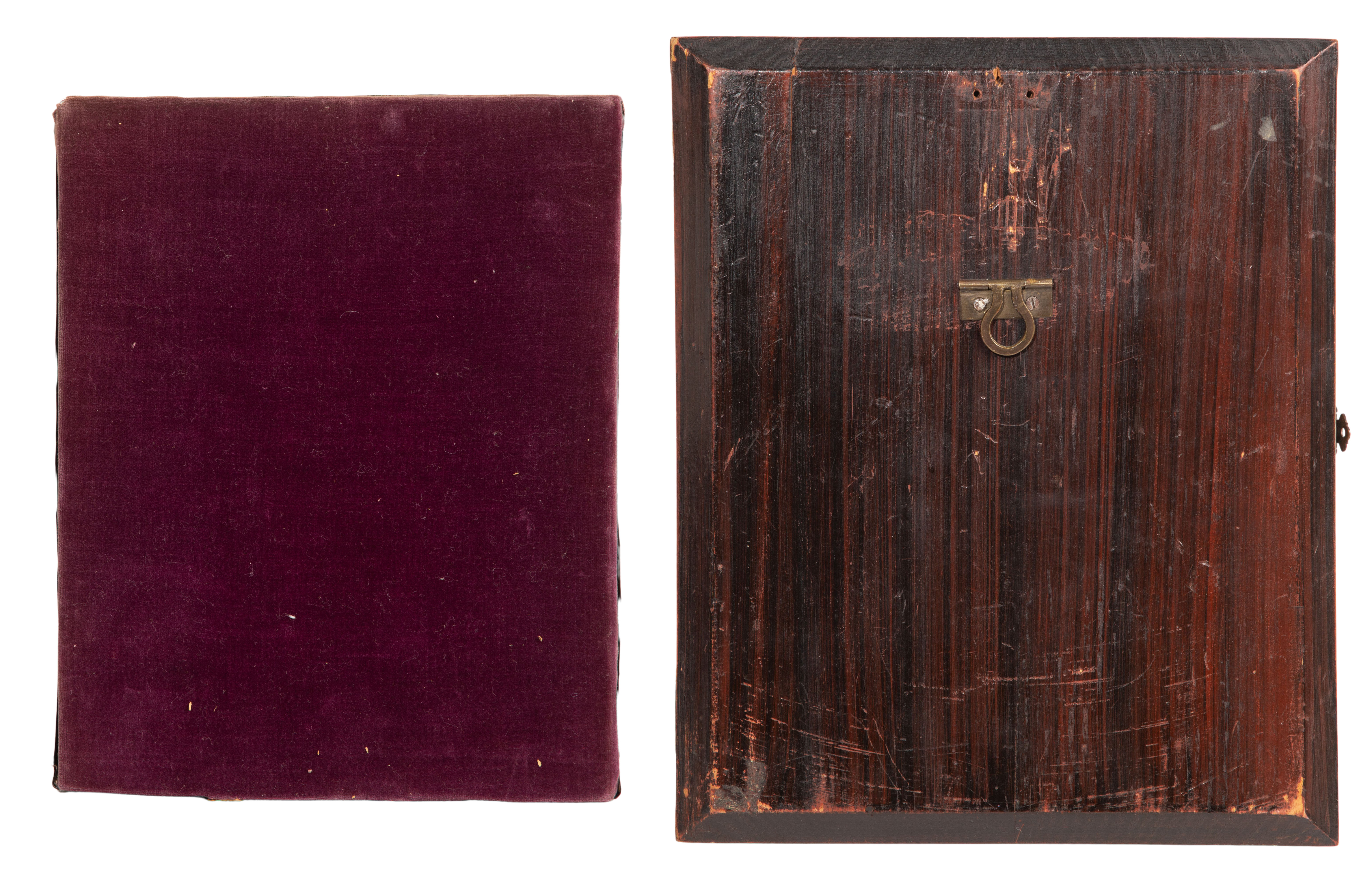 overall light wear consistent with normal use, painting having craquelure, box missing glass and having minor wear, nameplate at bottom center loose