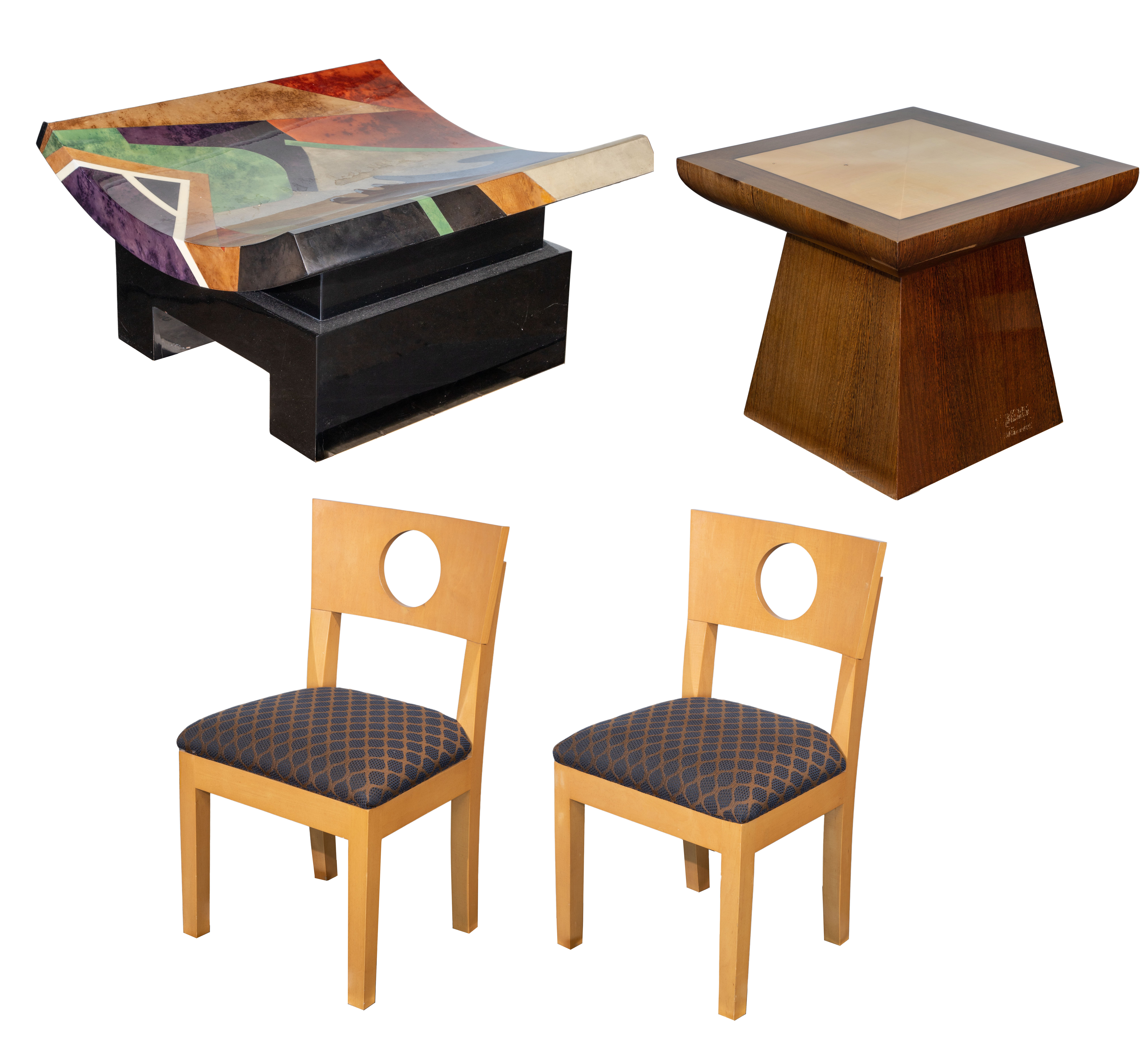 (4) items including a post-modernist curved bench having multi-colored wood inlay, a pyramid style two-tone side table and a pair of modernistic maple upholstered side chairs