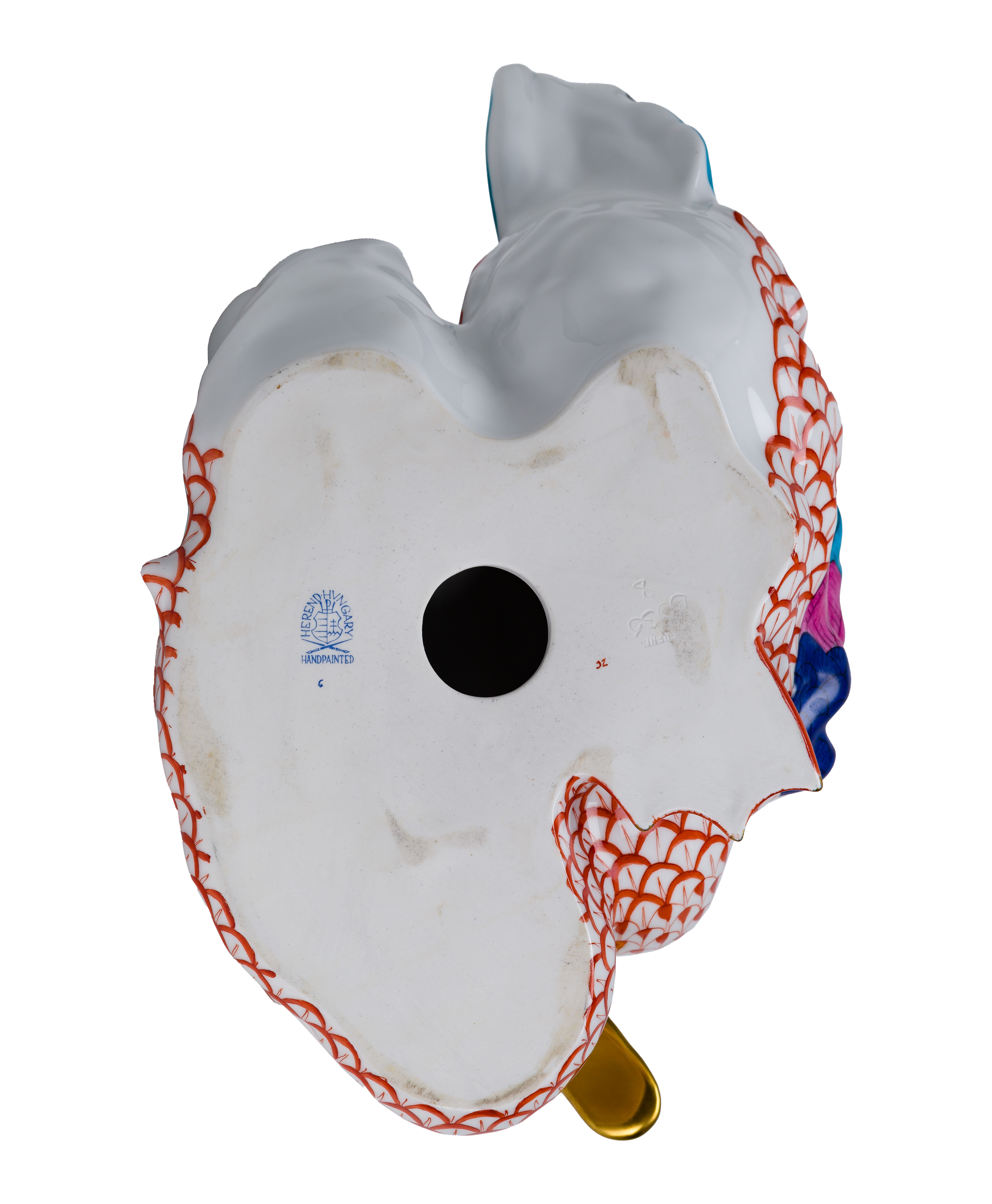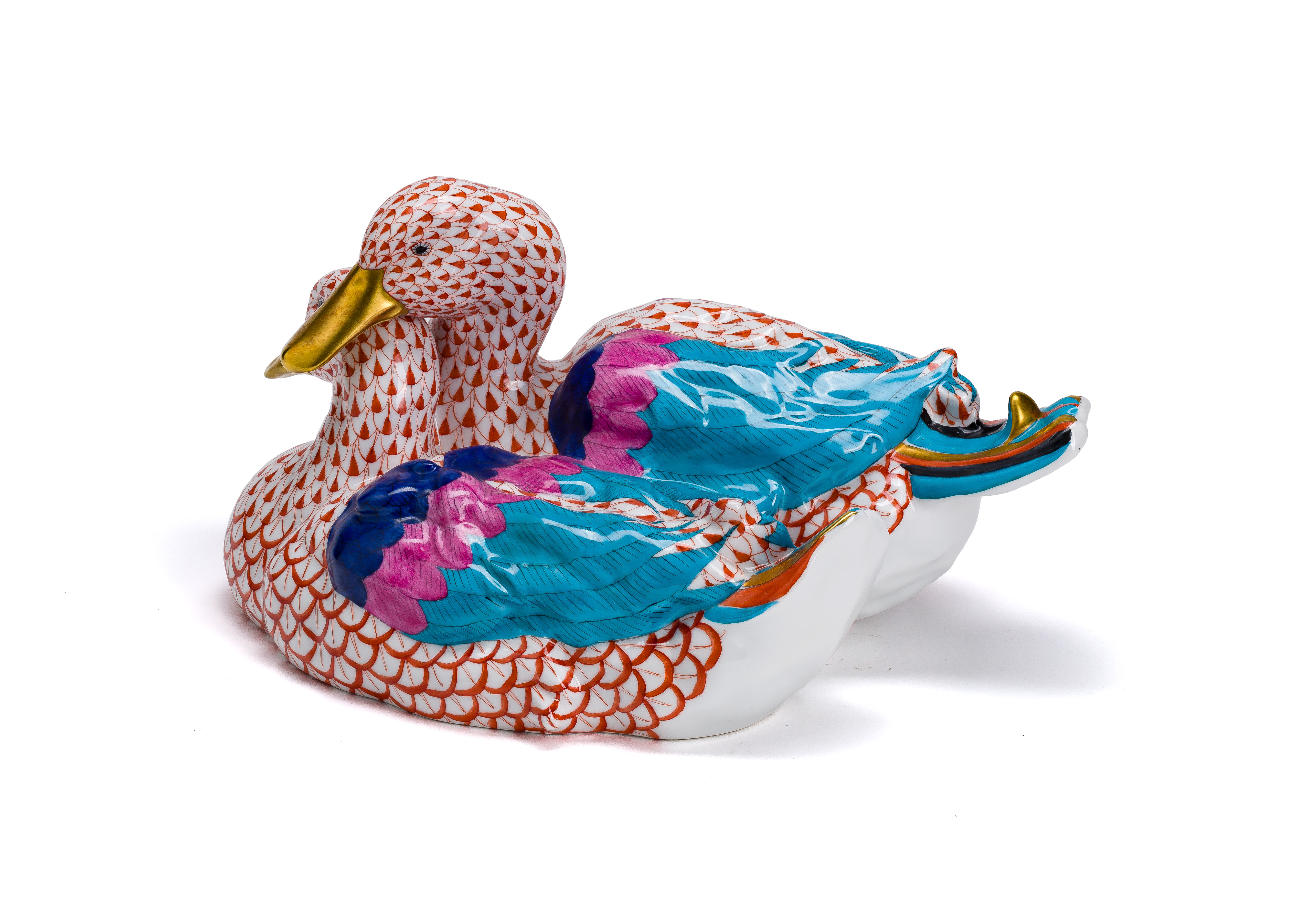 Two ducks having rust colored pattern, gold bills and multi-color wings, stamped mark underside