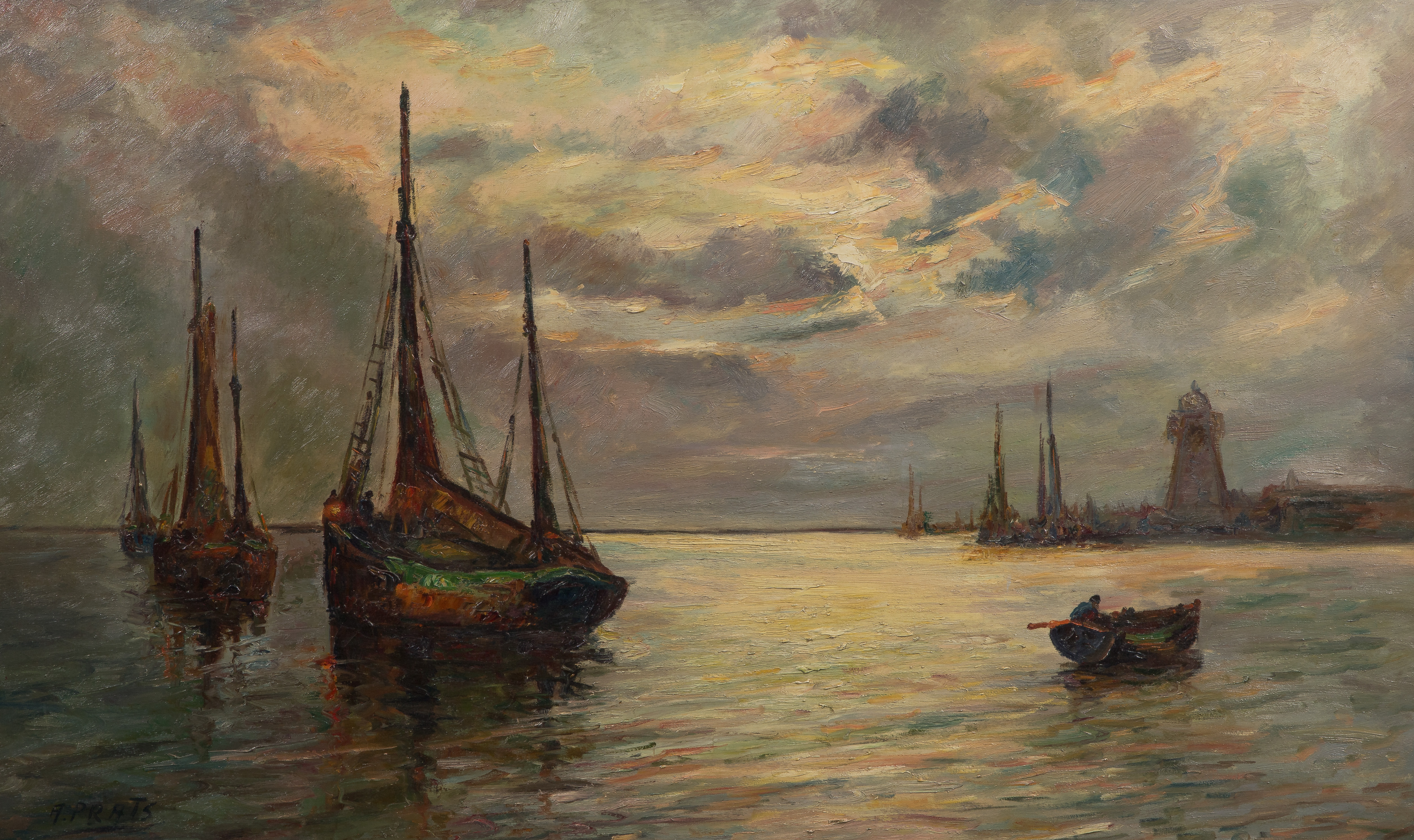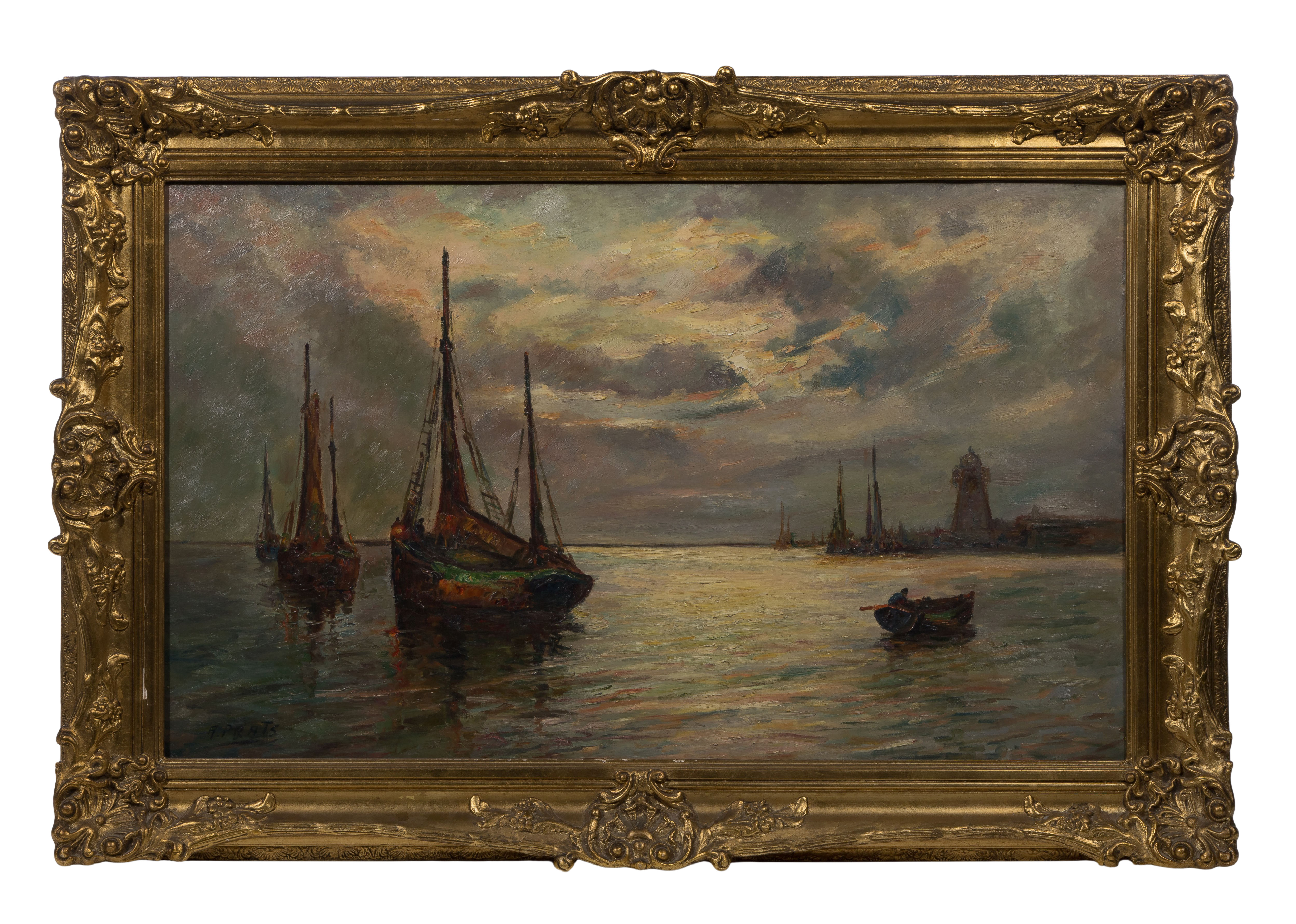 Undated, signed lower left, depicting sailboats at dusk, in a gold-tone composite on carved wood frame