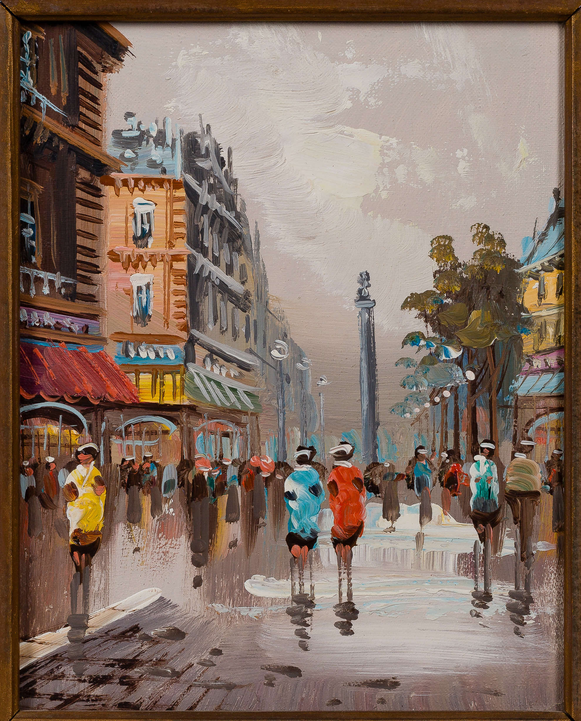(2) undated, unsigned items, depicting Parisian street scenes, in copper painted frames having artist name placards, biography on back