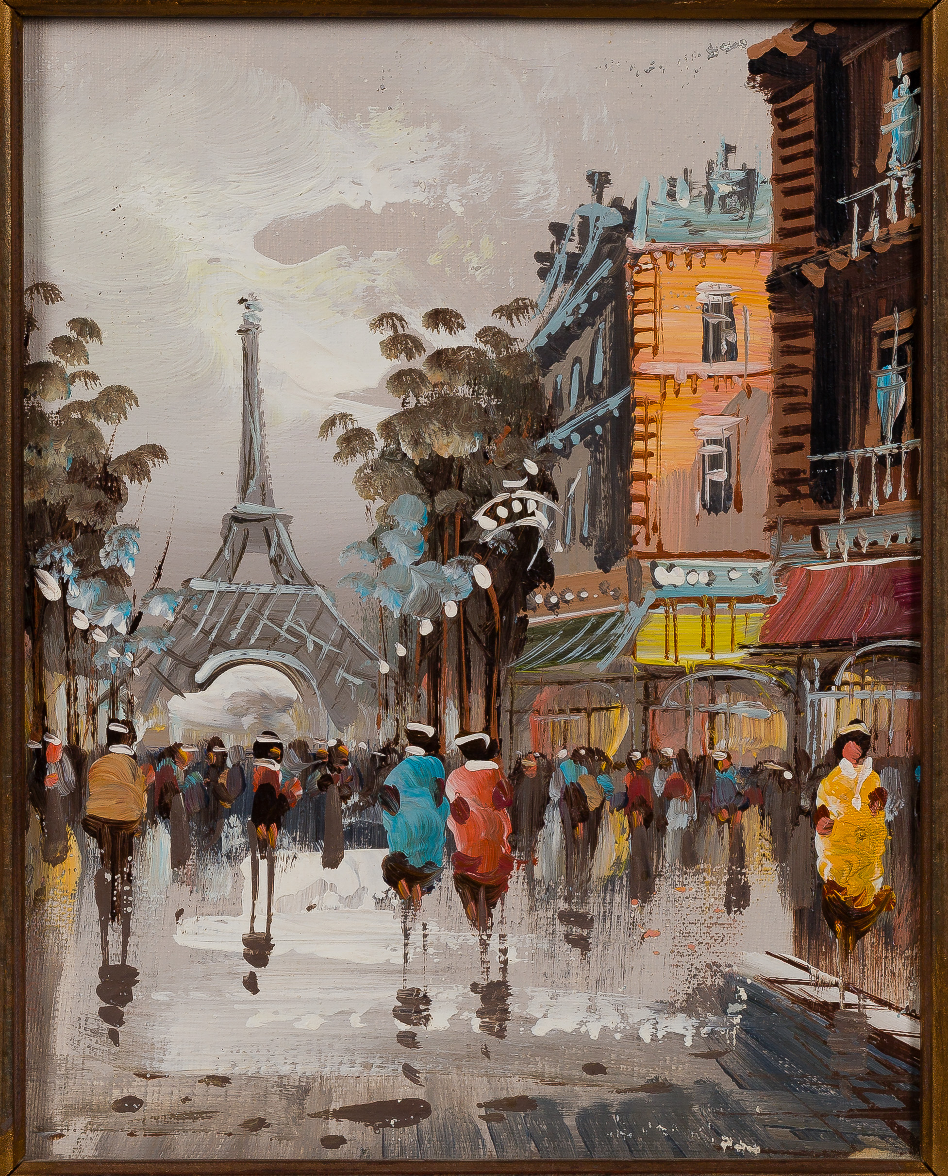 Condition: Eiffel Tower having a scuff near top, no other damage noted on either painting, frames having wear