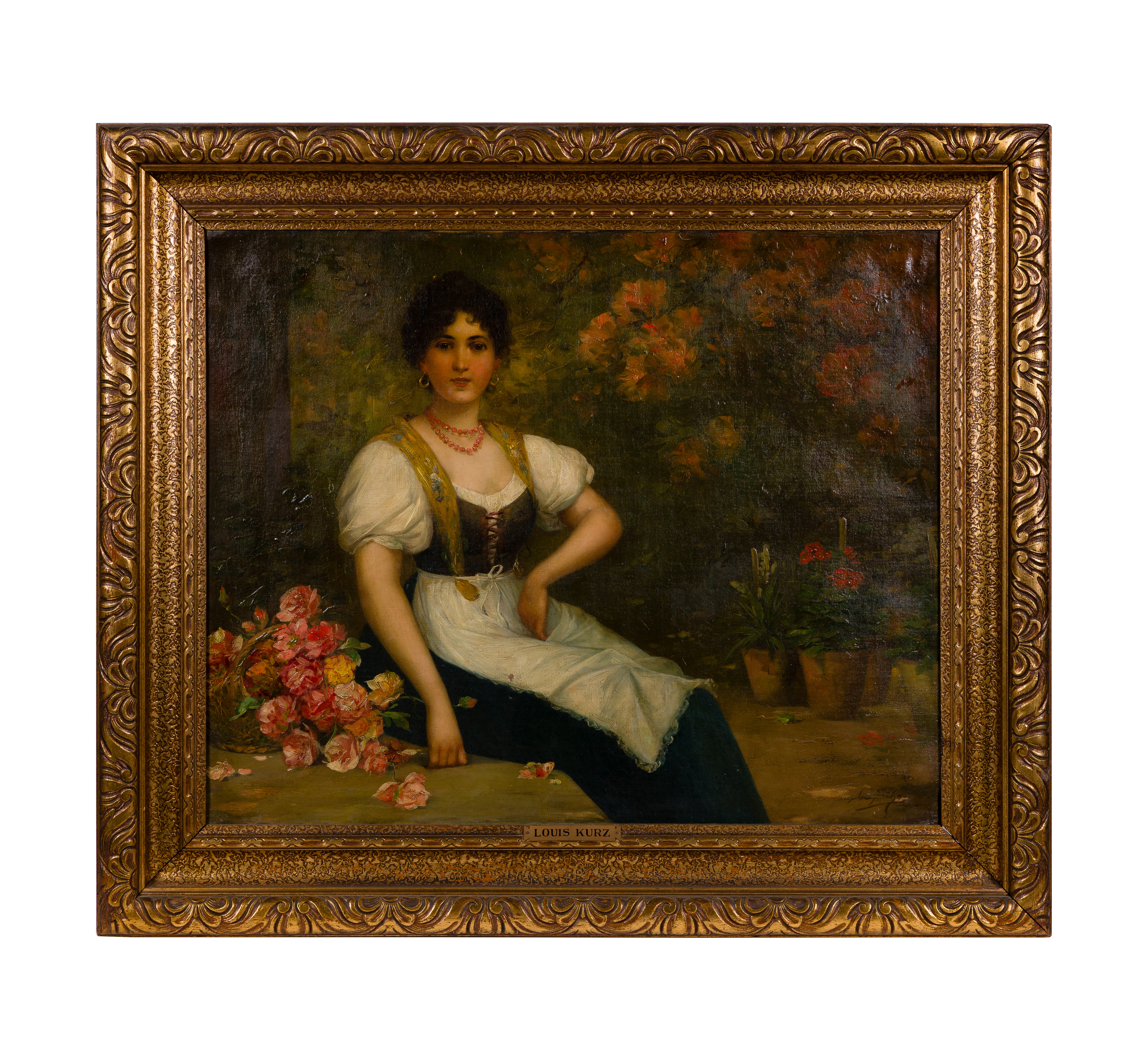 Undated, signed, portrait of a seated young woman in a garden, in a gold-tone painted frame