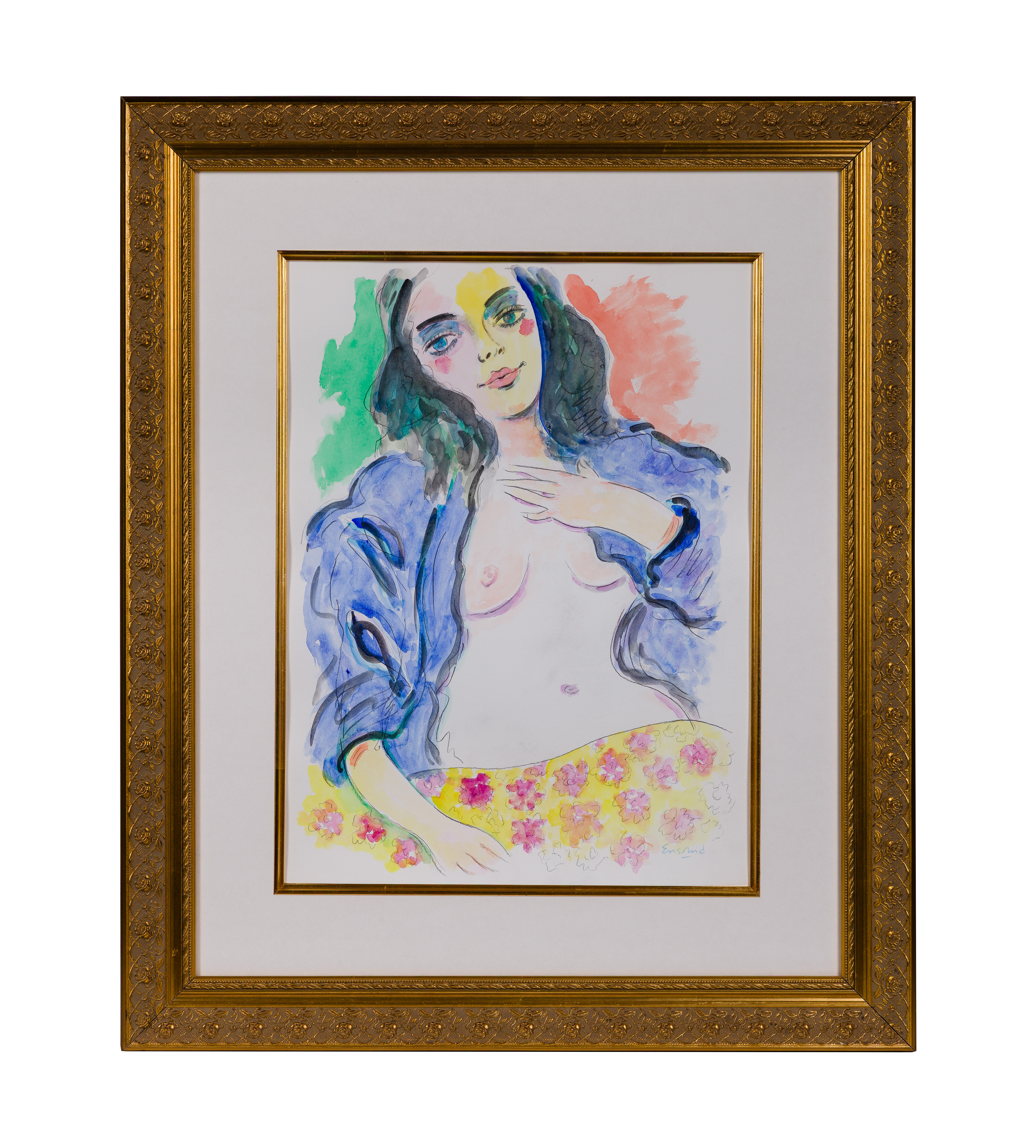 Undated, signed, depicting a young woman partially dressed in a blue shirt, matted under acrylic in a gold-tone frame, COA