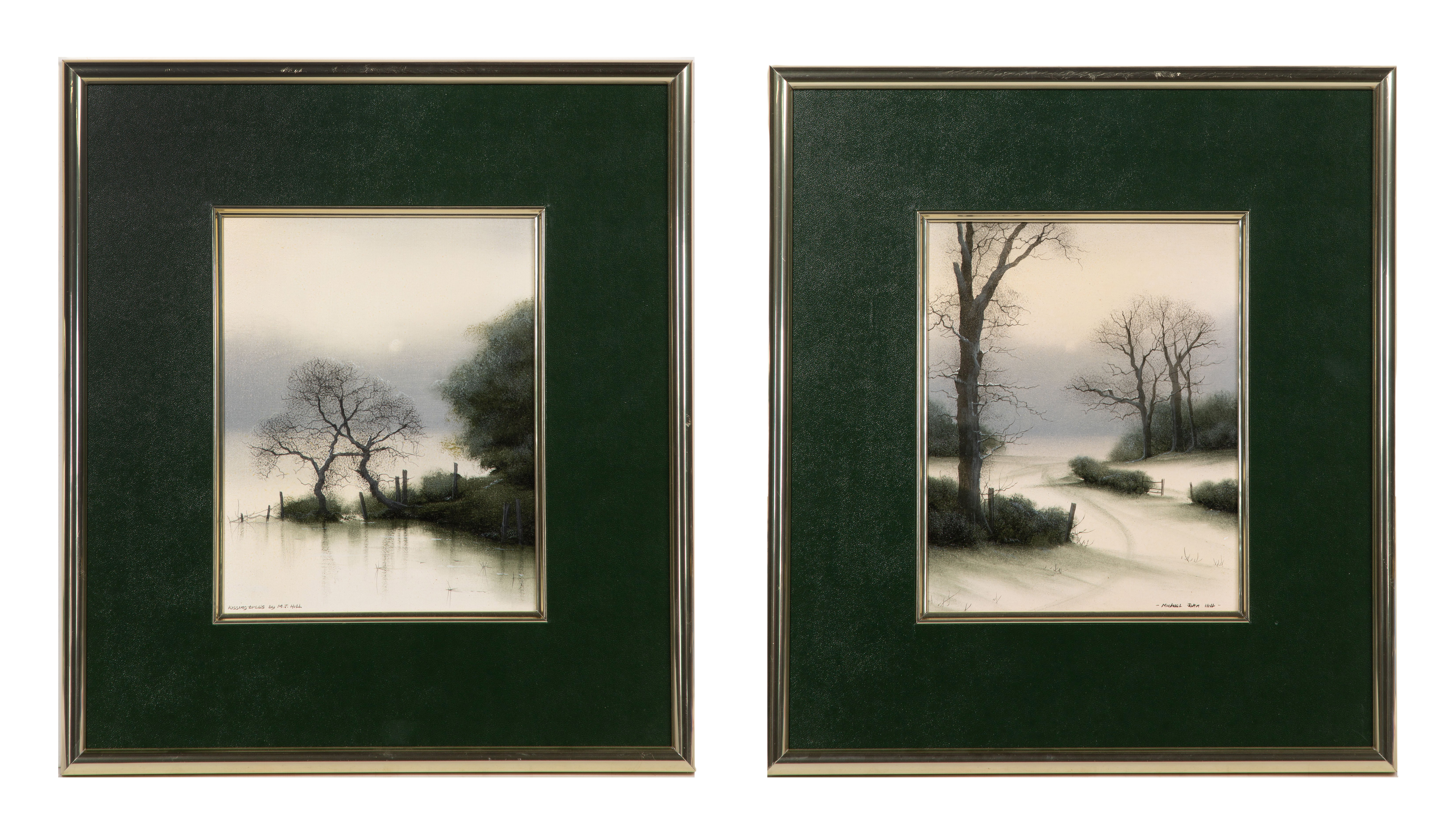 (2) items, including ‘Kissing Trees’ and ‘Winters Storm’, both signed, depicting winter landscapes and having a green mat with metal frame