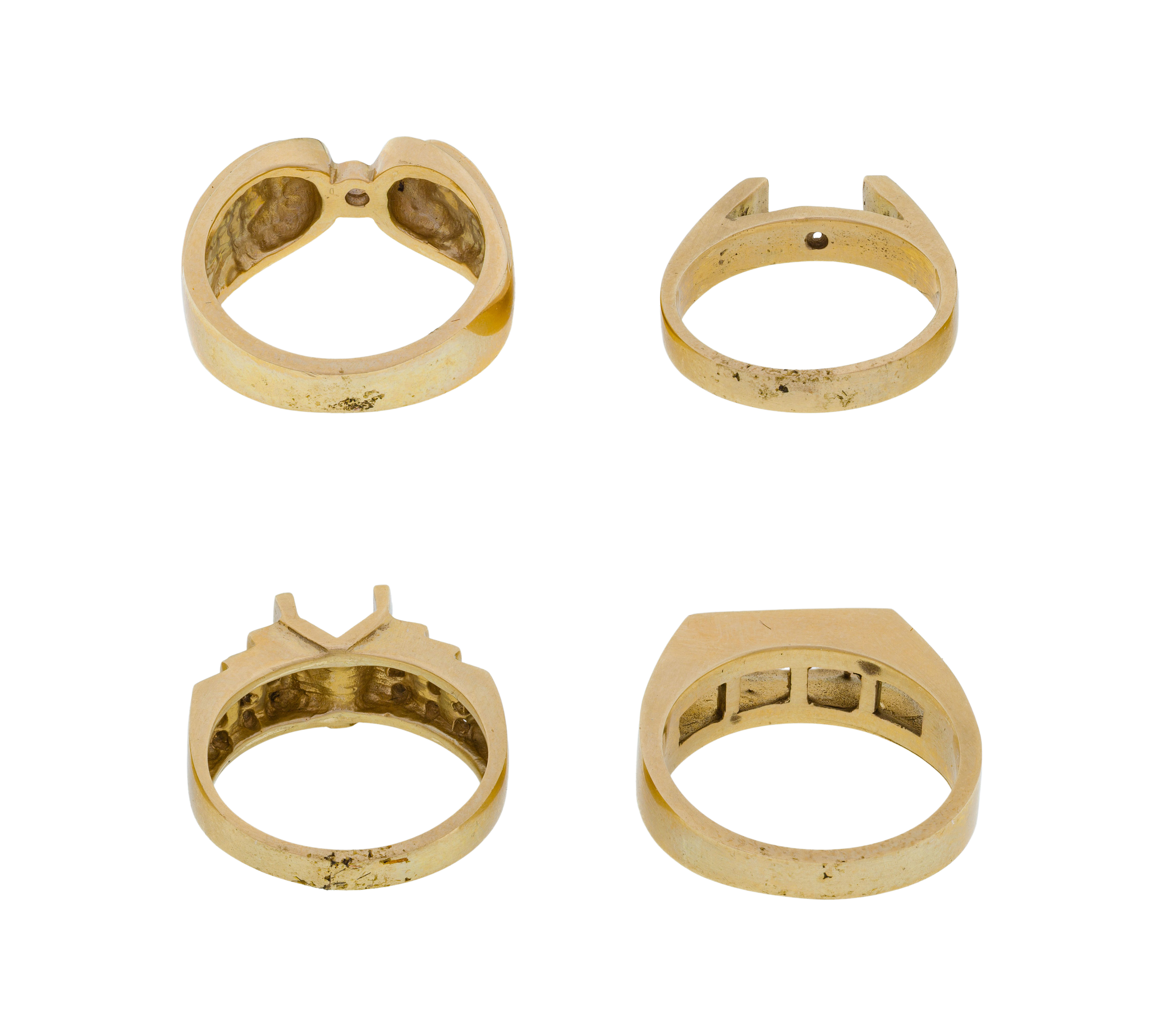 (4) items including (2) having space for a single gemstone and (1) having space for a single gemstone and stepped side for eighteen round cut gemstones (marked ’14k’ / ‘585’) as well as (1) having space for a bar gemstone (unmarked ’10k’)