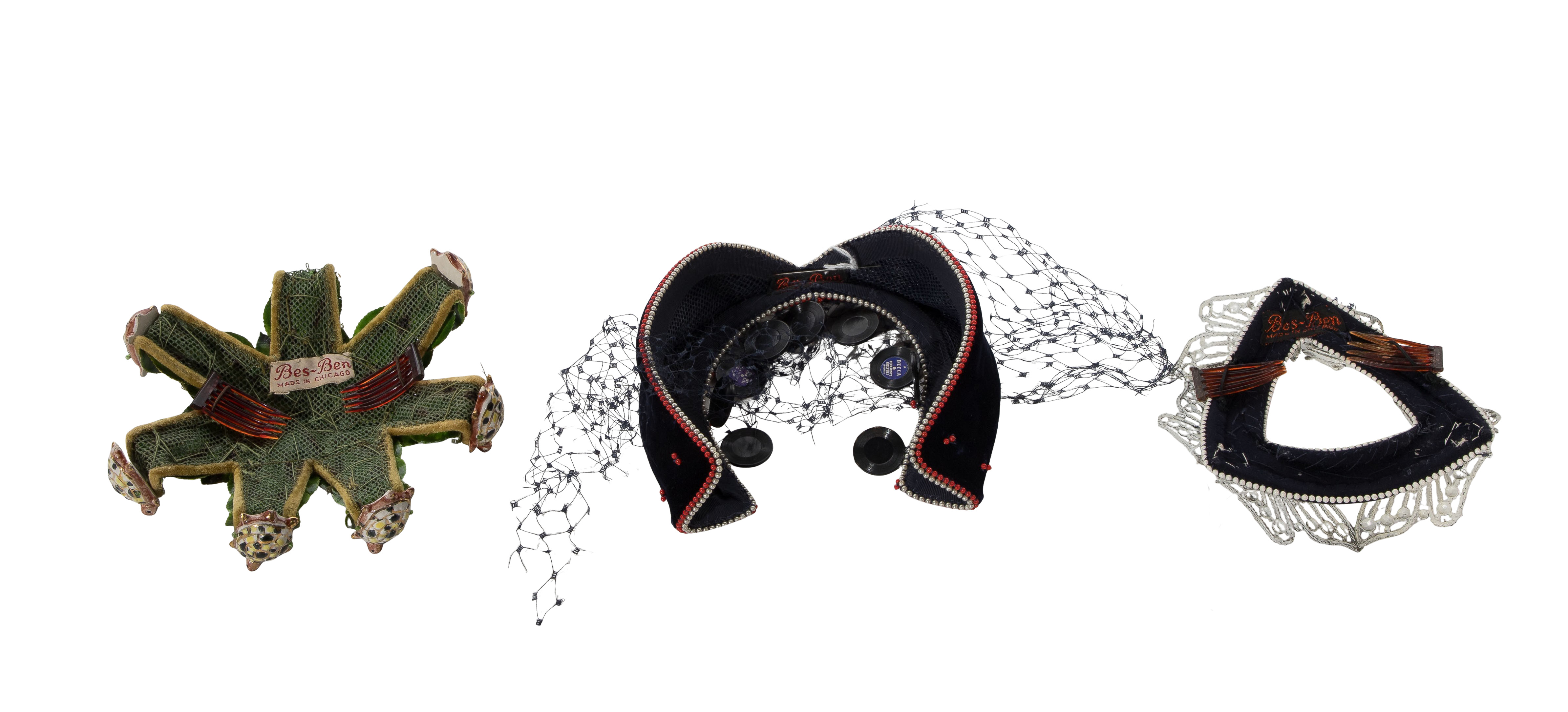(3) items including a triangle hat having three white beaded butterflies, a horseshoe form having white and red beads, netting and various miniature albums and a round leaf hat having enamel and ceramic turtles on ends, all retaining original cloth labels