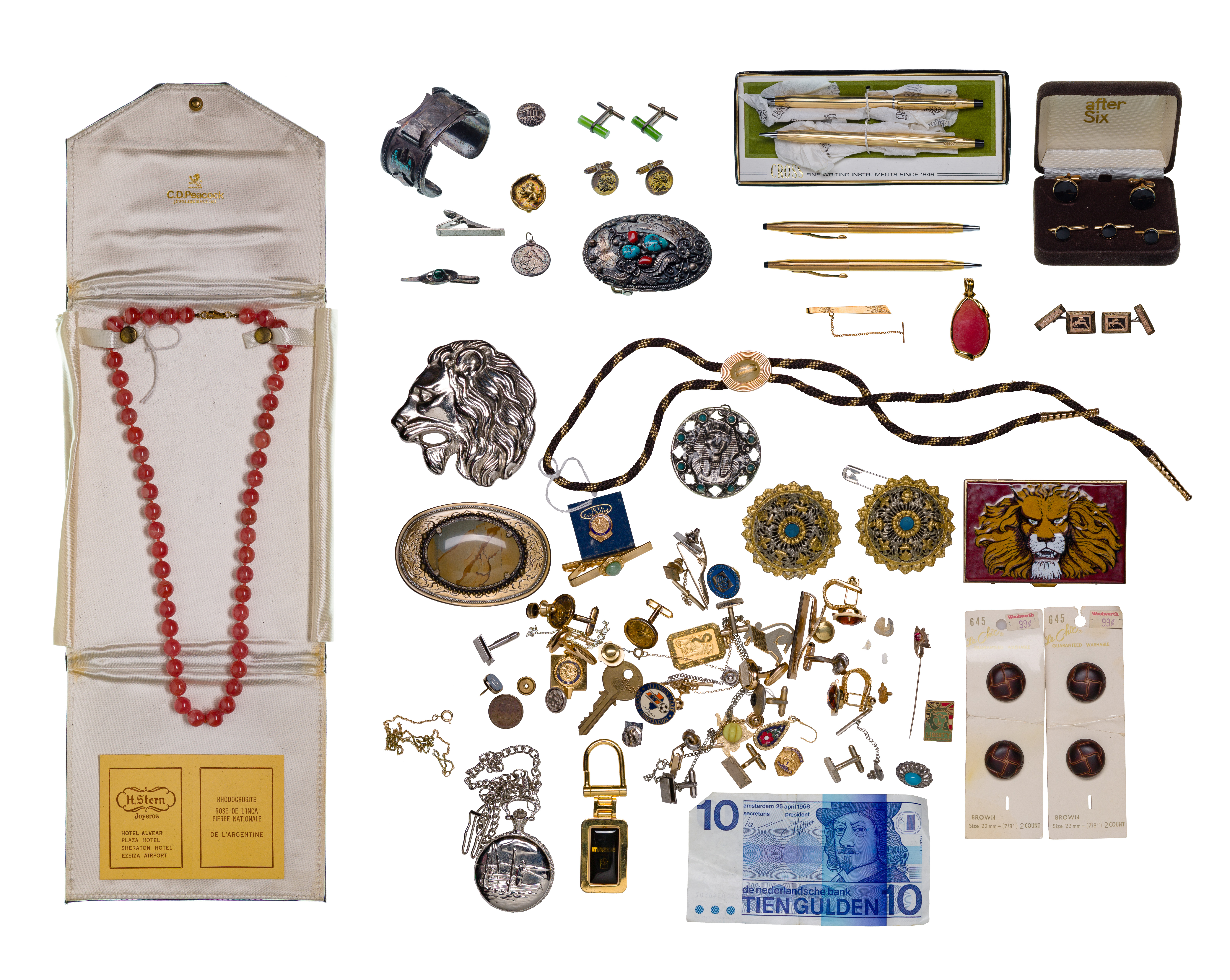 Including a tie clasp (marked ’18k’), a gemstone pendant (unmarked 14k) as well as a belt buckle, cufflinks, a bracelet (unmarked sterling, 0.850 and 0.800) and approximately (3) pounds of fashion jewelry including pins, cufflinks, pendants