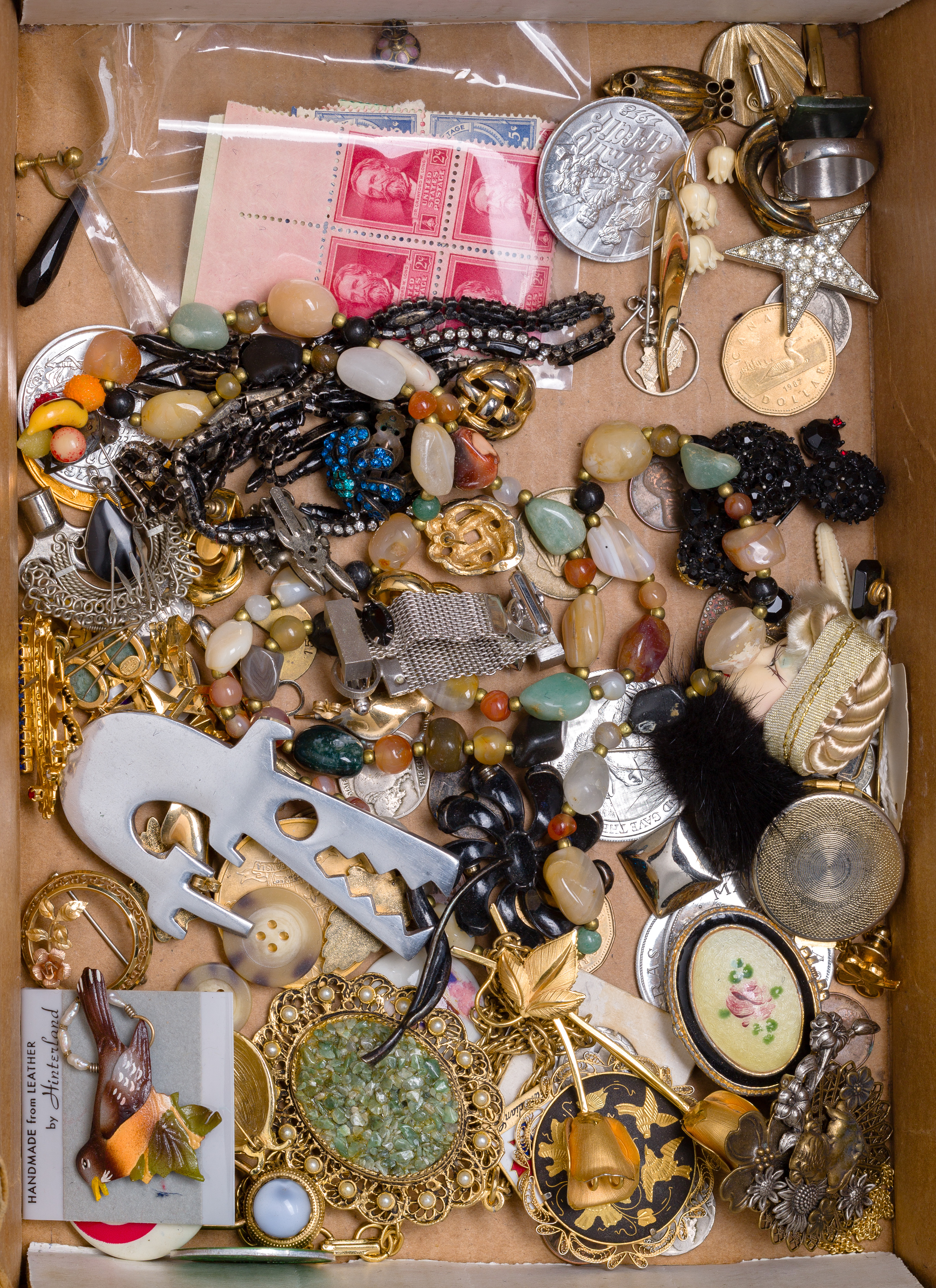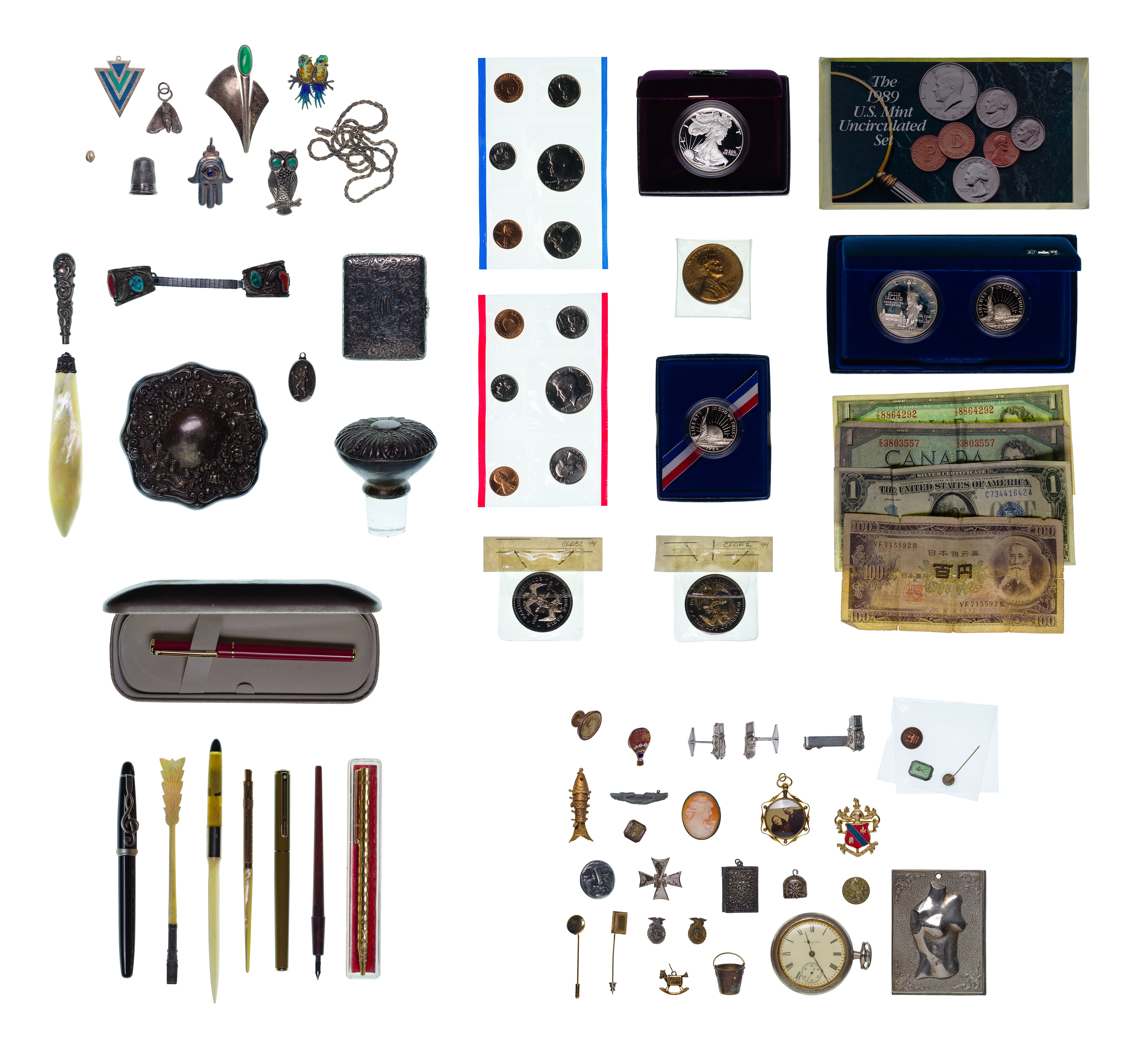 Including a dental inlay (unmarked 18k), a necklace, pins, bracelets, pendants and fragments (most marked ‘925’ / ‘sterling’) as well as paper currency, coins, pens, medallions and fashion jewelry