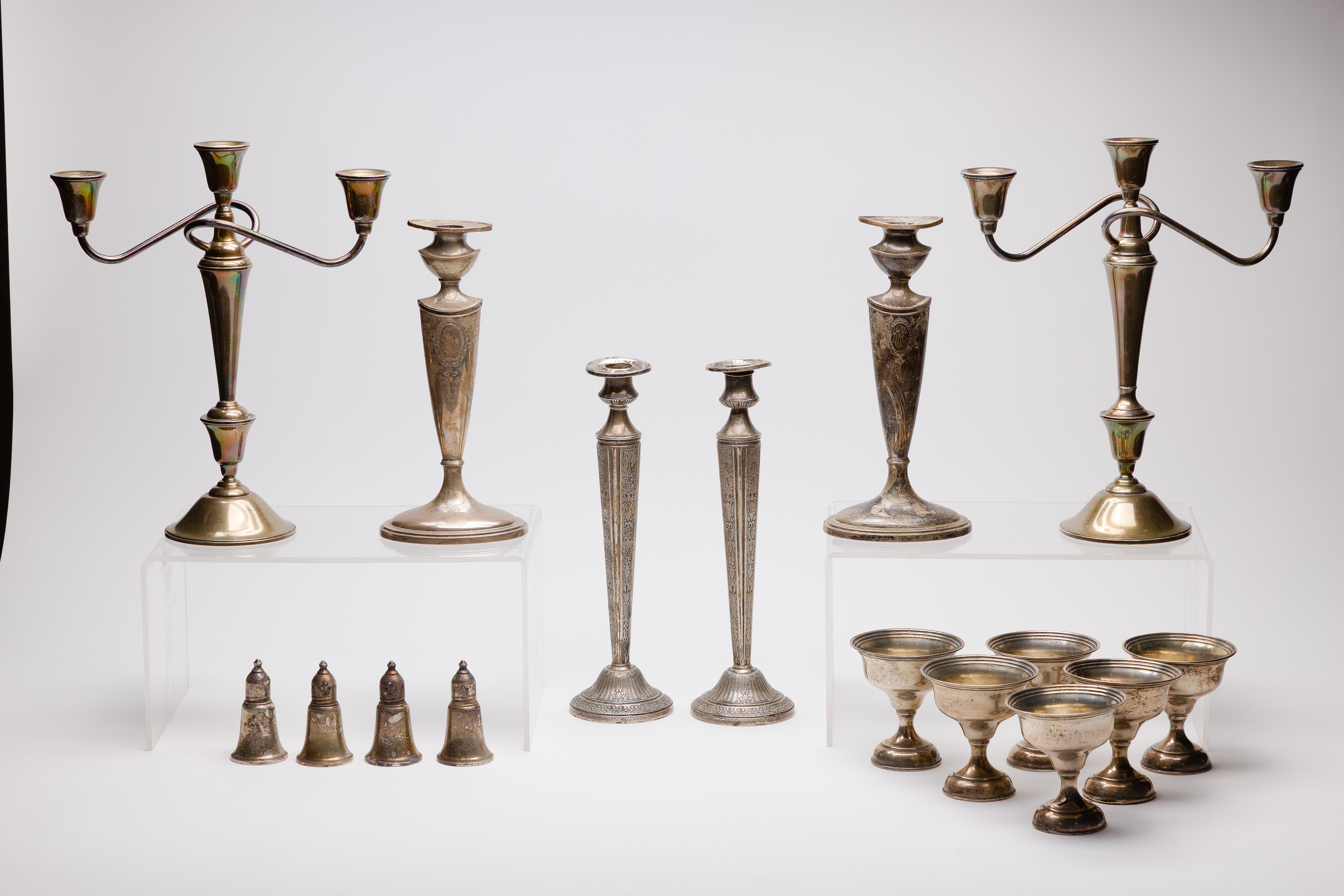 (14) items including a pair of candelabra, (2) pairs of candlesticks, a set of (6) champagne glasses and a set of (2) pairs of salt and pepper shakers (all marked ‘sterling’)