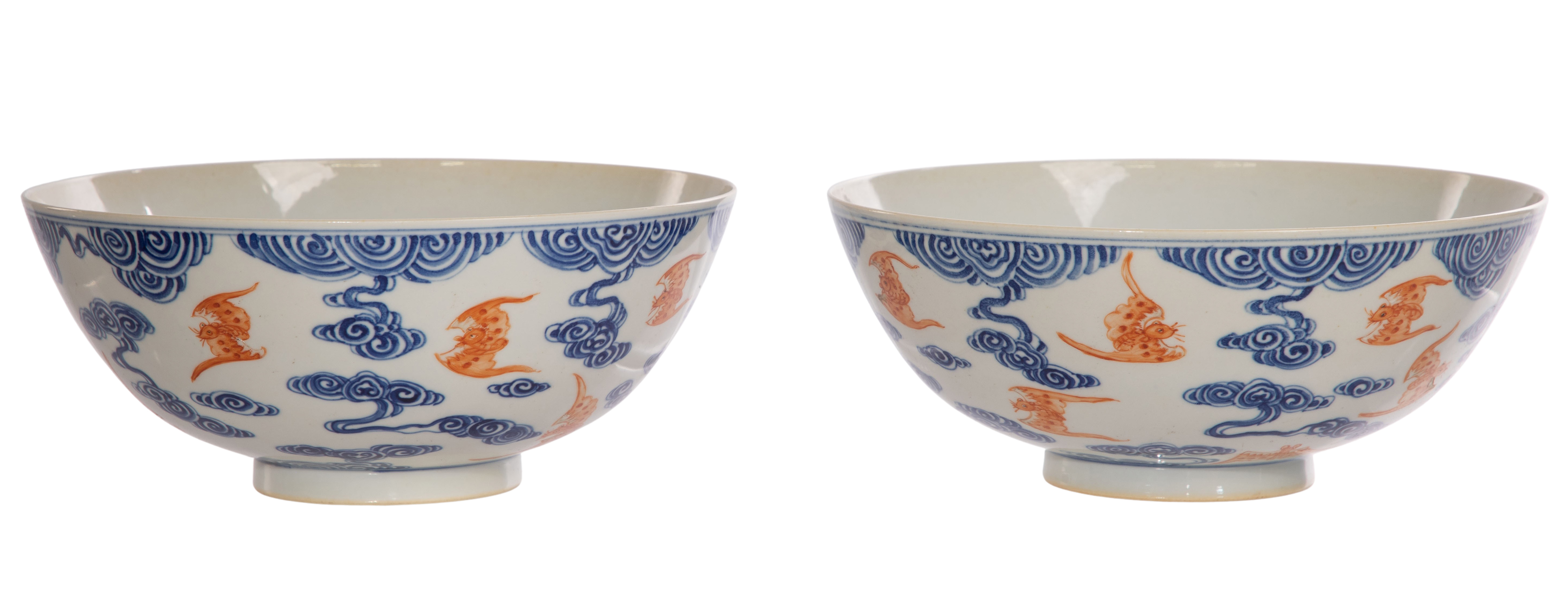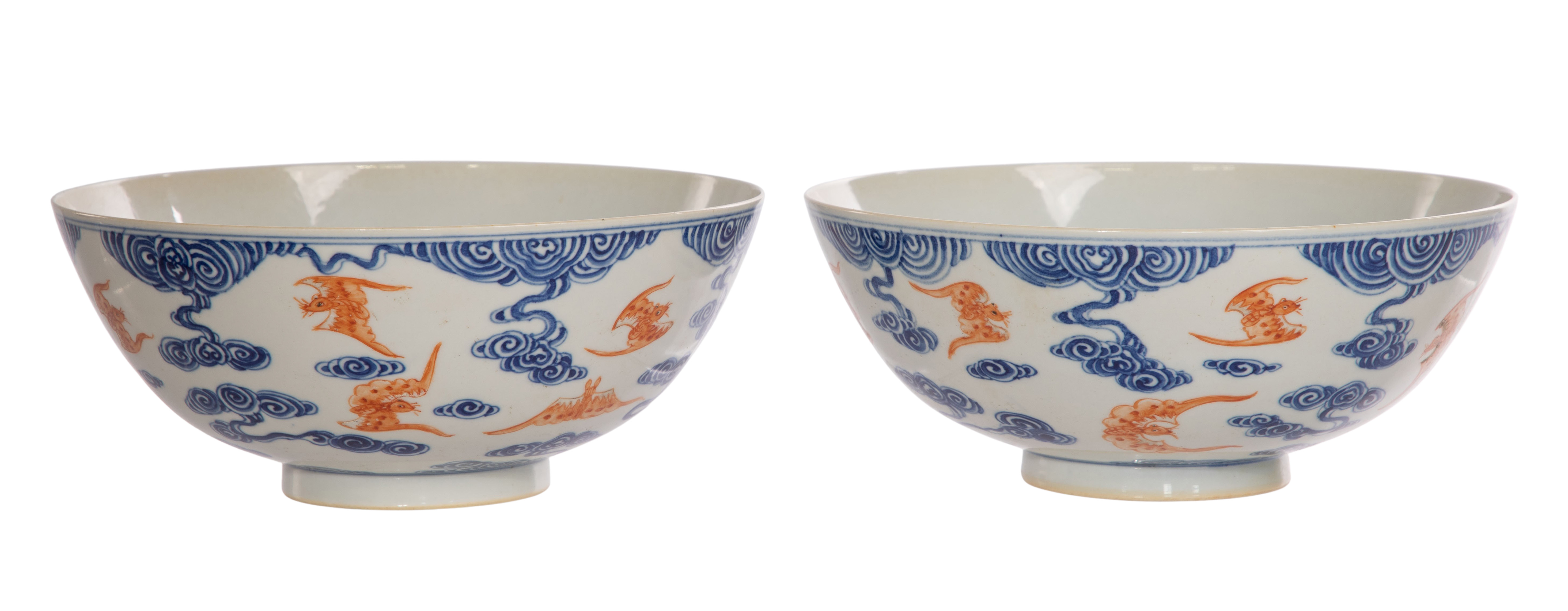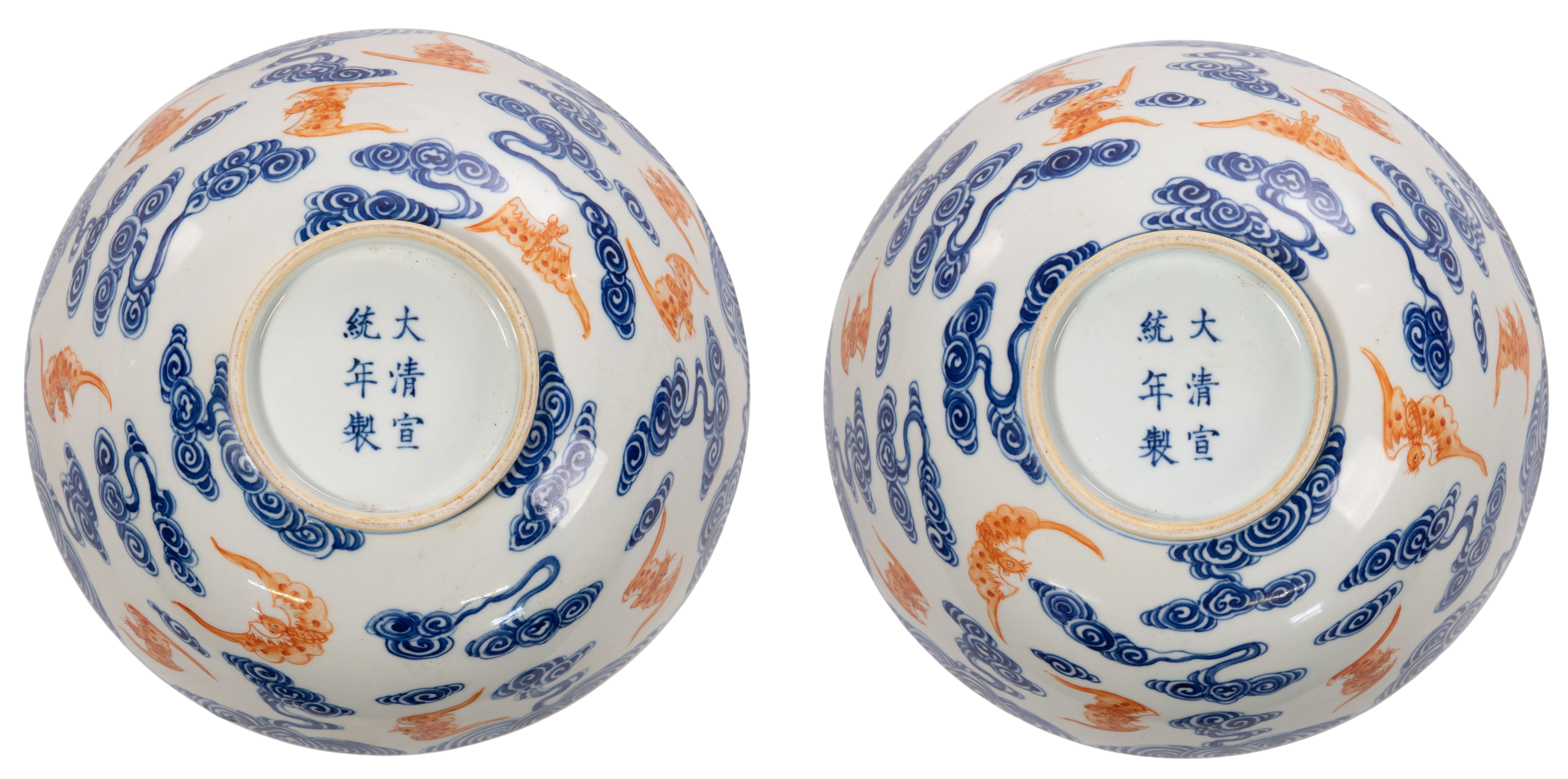 A pair having iron red enamel bats amid underglaze blue cloud decoration, both having underglaze blue 6-character Xuantong marks underside