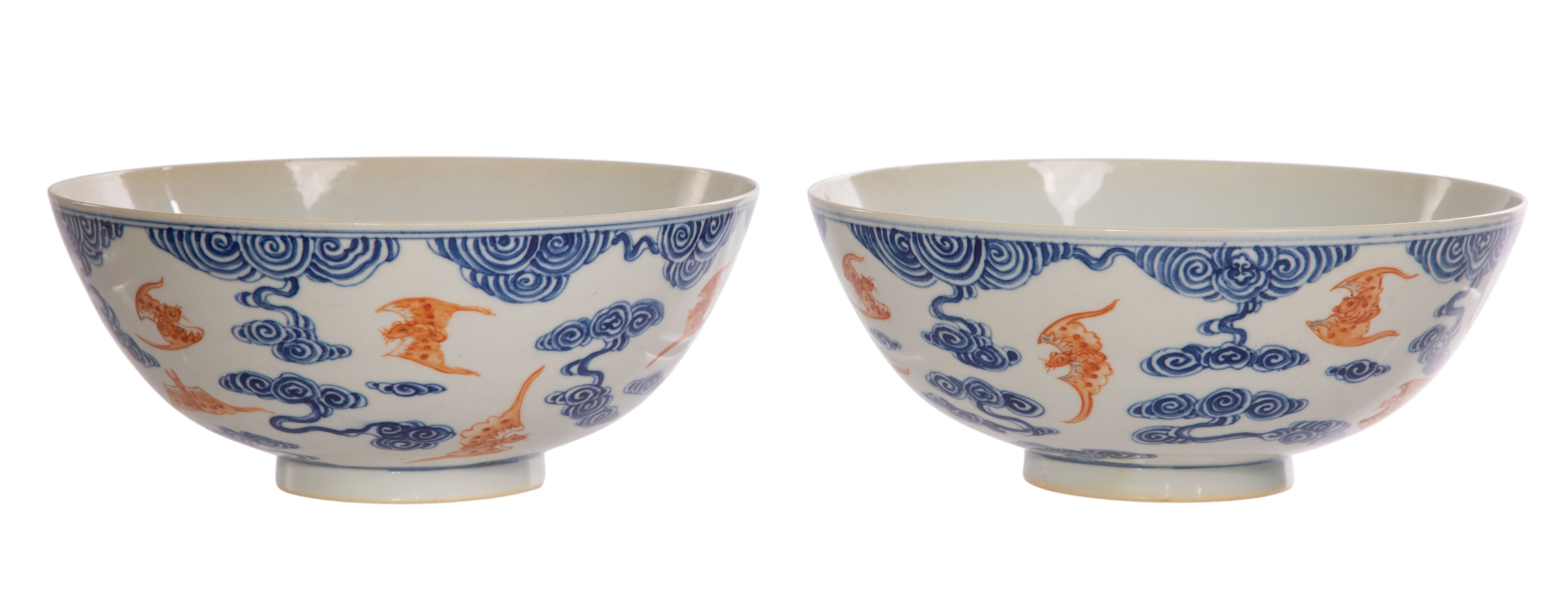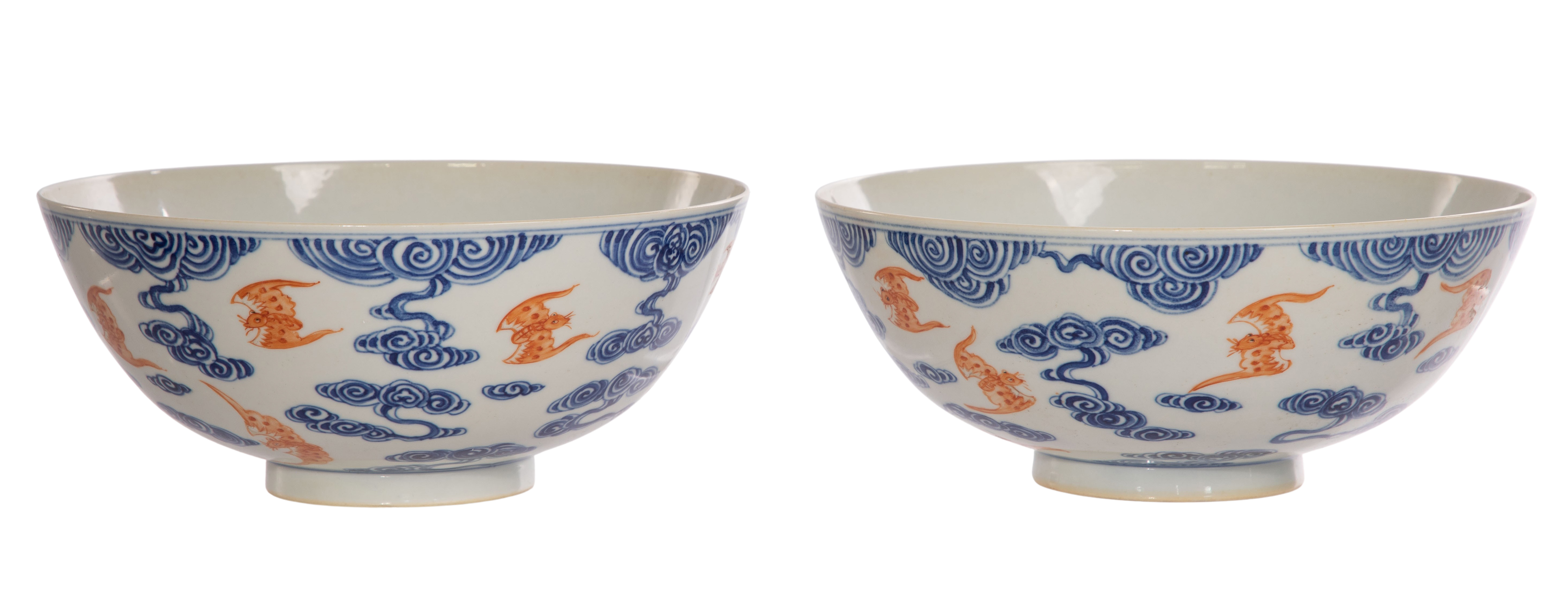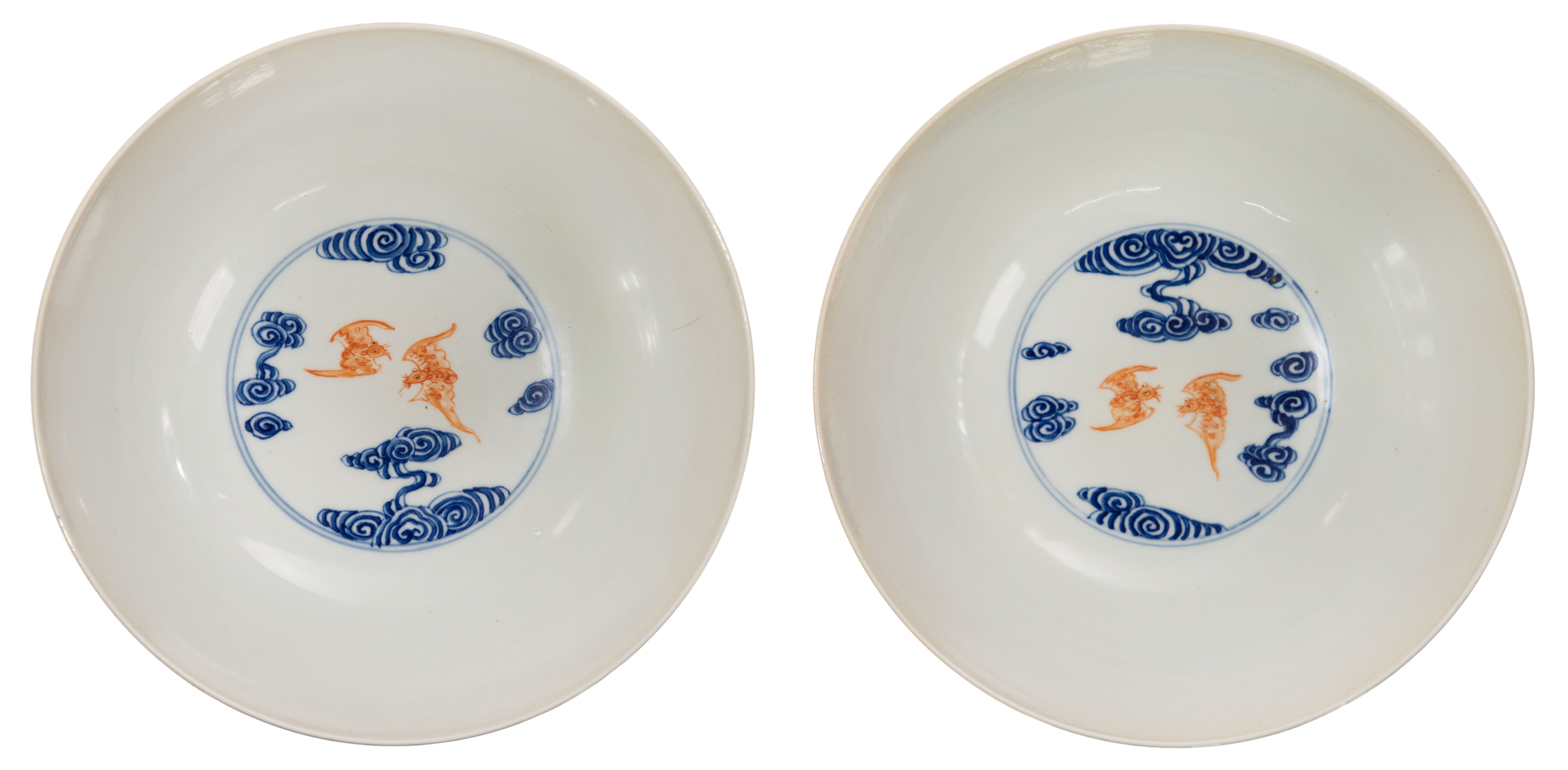 A pair having iron red enamel bats amid underglaze blue cloud decoration, both having underglaze blue 6-character Xuantong marks underside