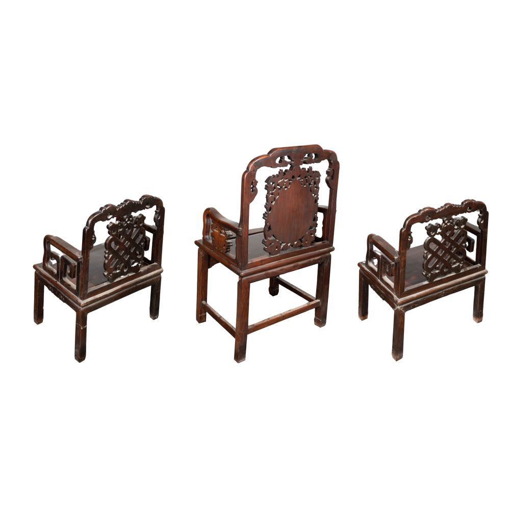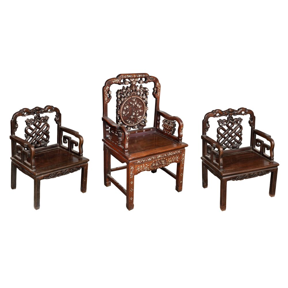 (3) items including a mother-of-pearl inlaid armchair and a pair of armchairs having the longevity motif carved into the splat, all having Asian style cushions