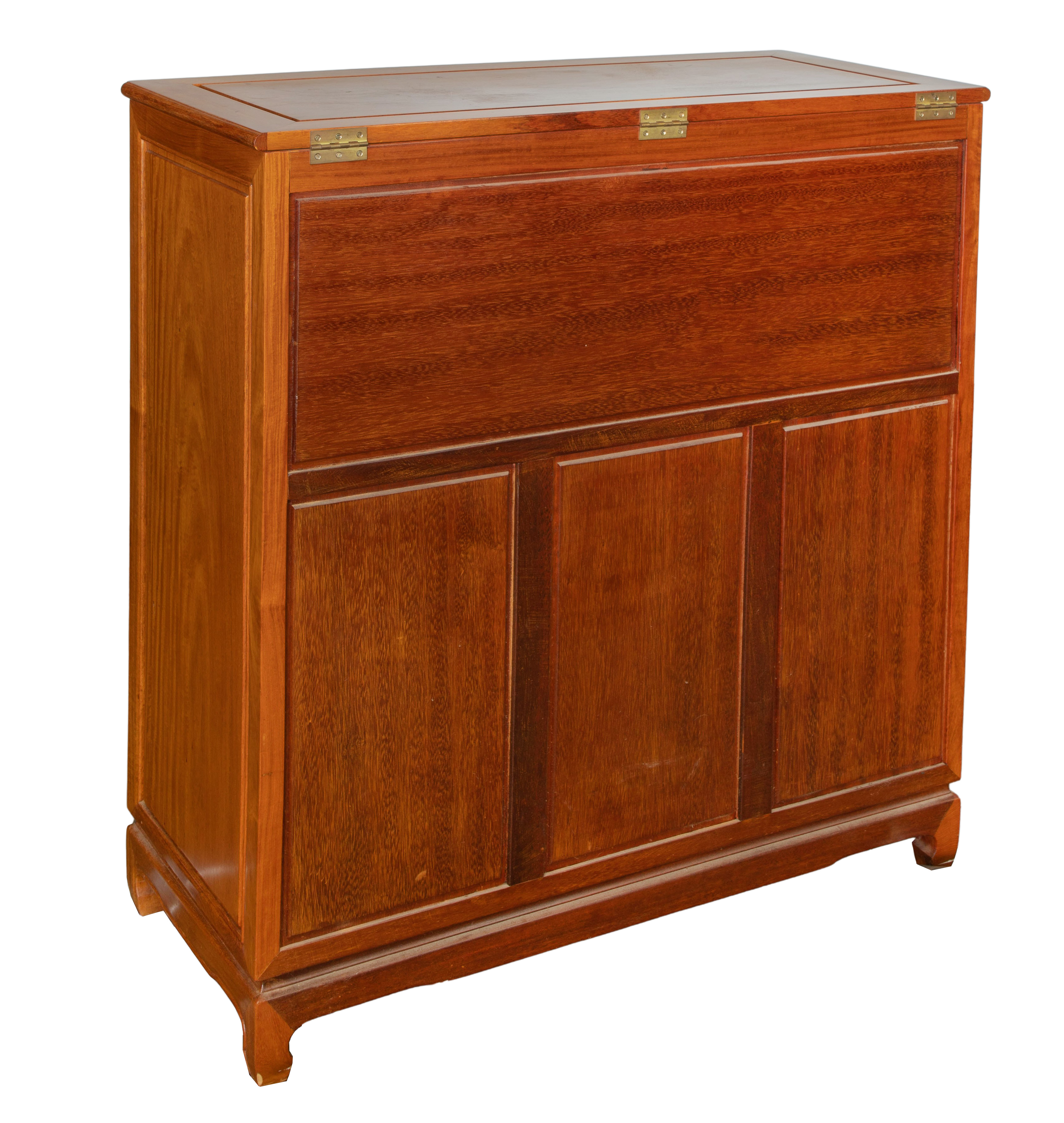 Lift top simultaneously drops the front, revealing a mirror-lined interior having a bottle rack / shelf, the lower two-door cabinet having two short dovetailed drawers above two shelves on the left and on the right a pull-out 12-bottle rack / drawer, auspicious characters carved to door fronts