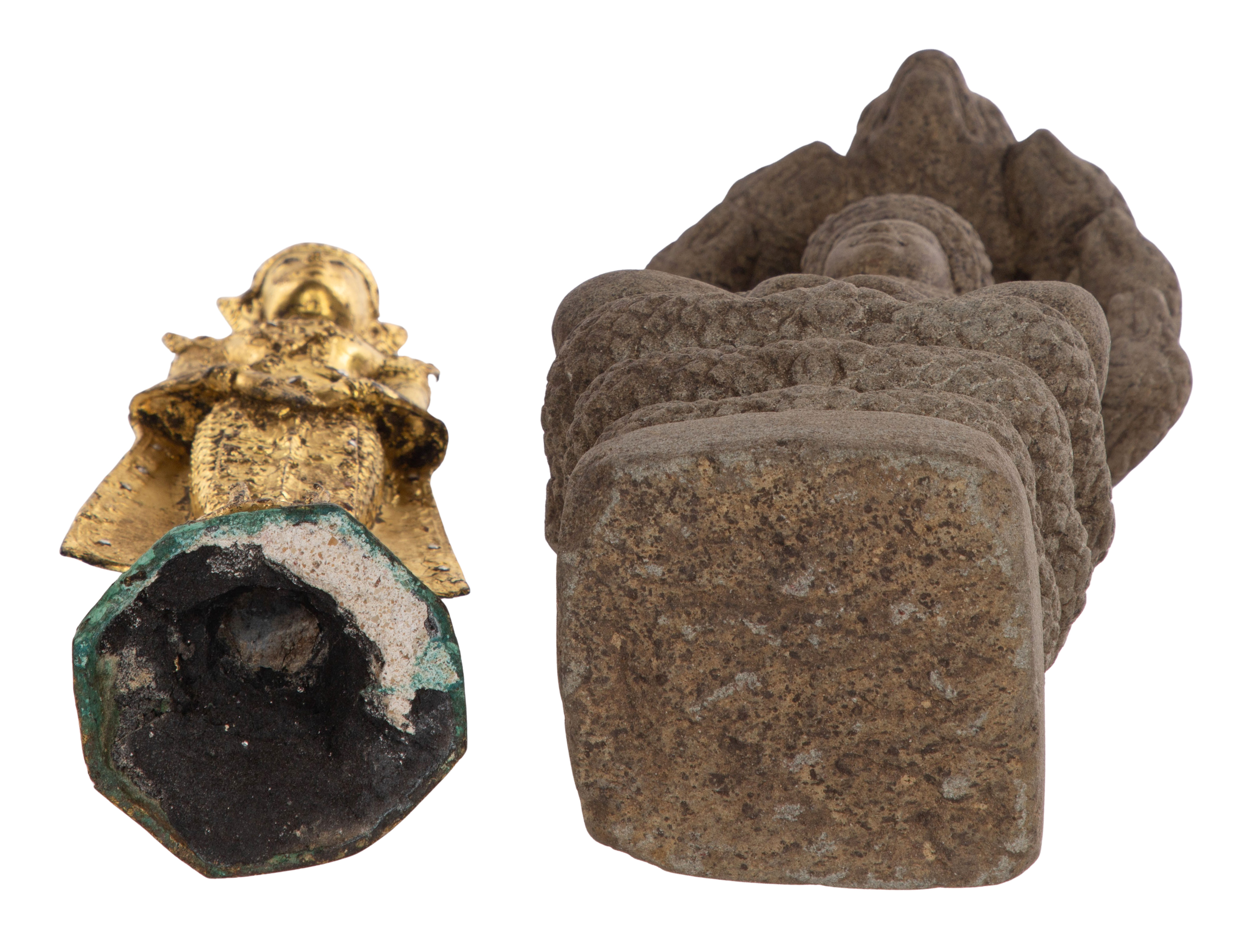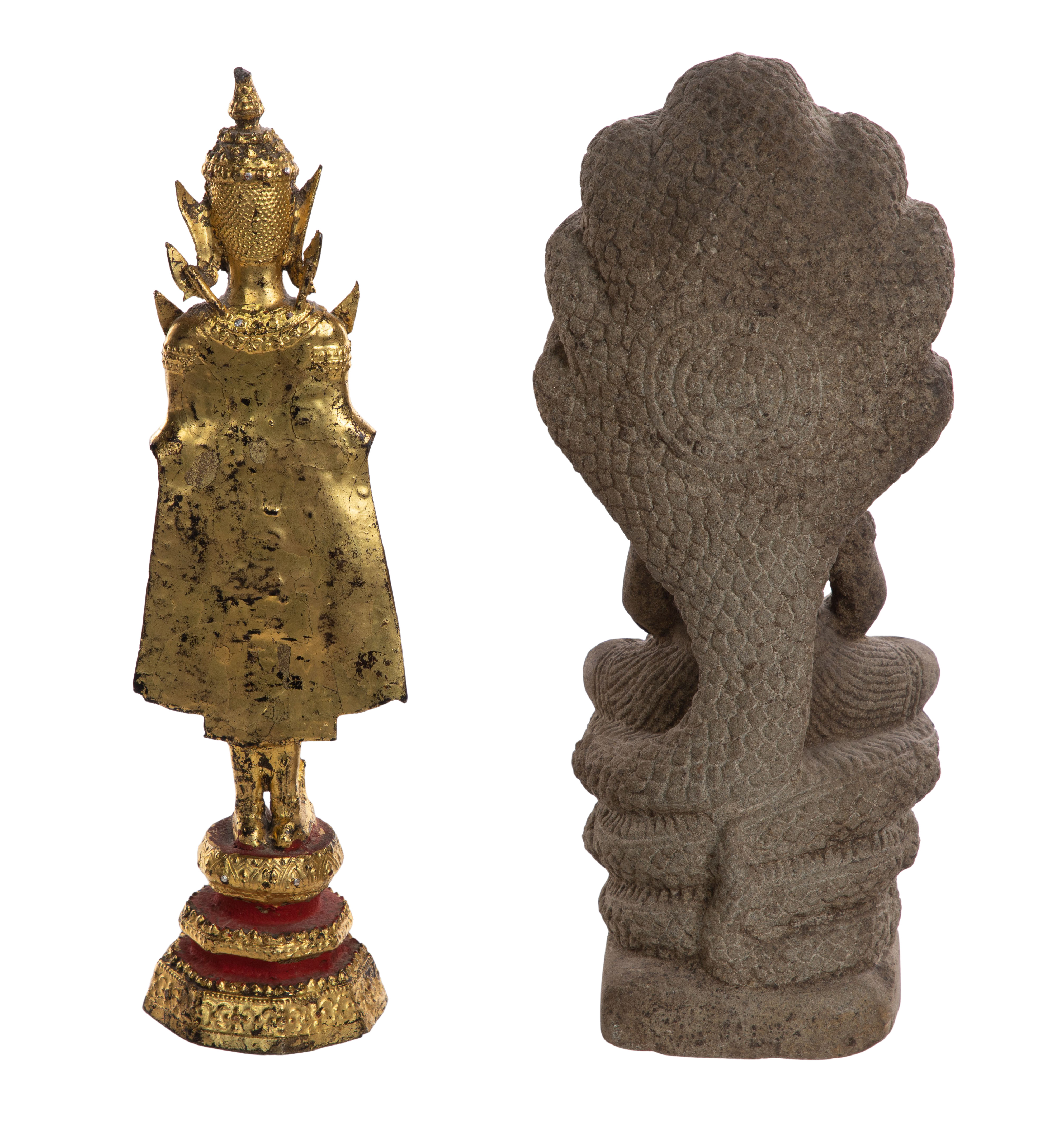 (2) total items including a stone figure of the Buddha Muchalinda, depicting the Buddha seated in meditation on the coiled body of a seven-headed serpent king, who forms a protective canopy overhead; together with a gilded standing Buddha