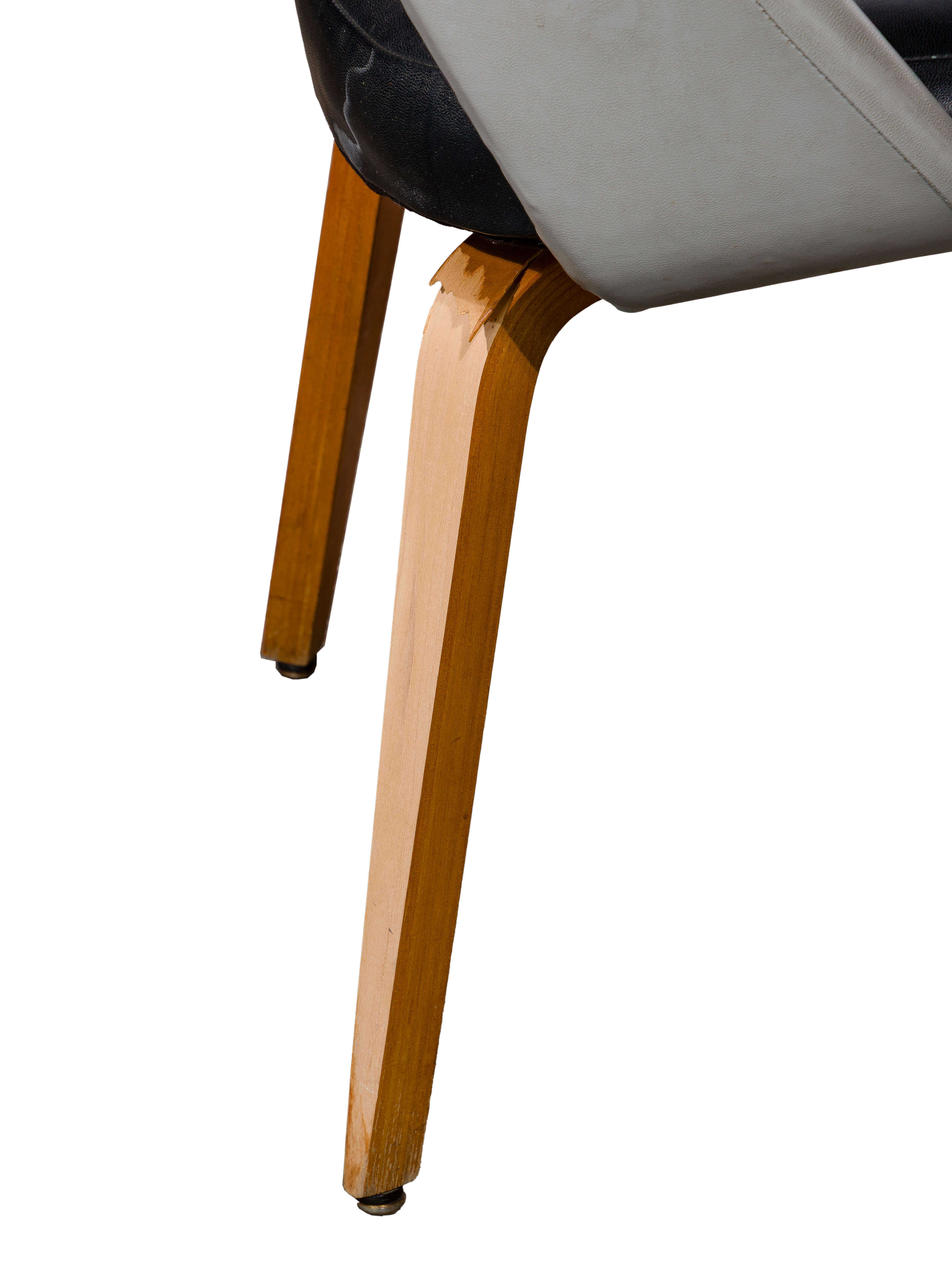 overall light wear consistent with normal use, dirt accumulation, some legs having nicks, leather having scratches, a seat having repair to leather on side, one having missing veneer on back of leg, lacking labels