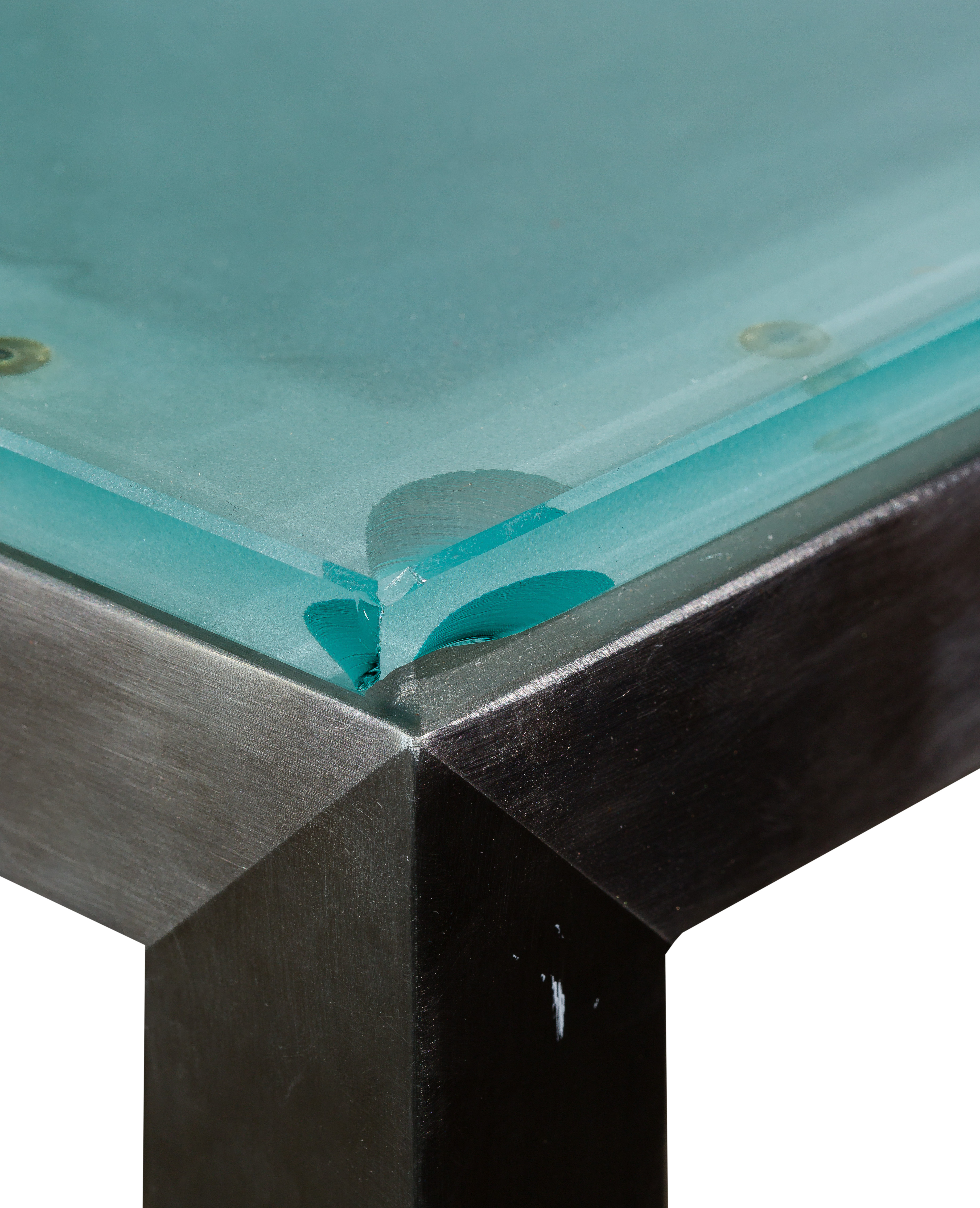 Glass top having a frosted underside, supported on brushed stainless steel square tube frame and legs