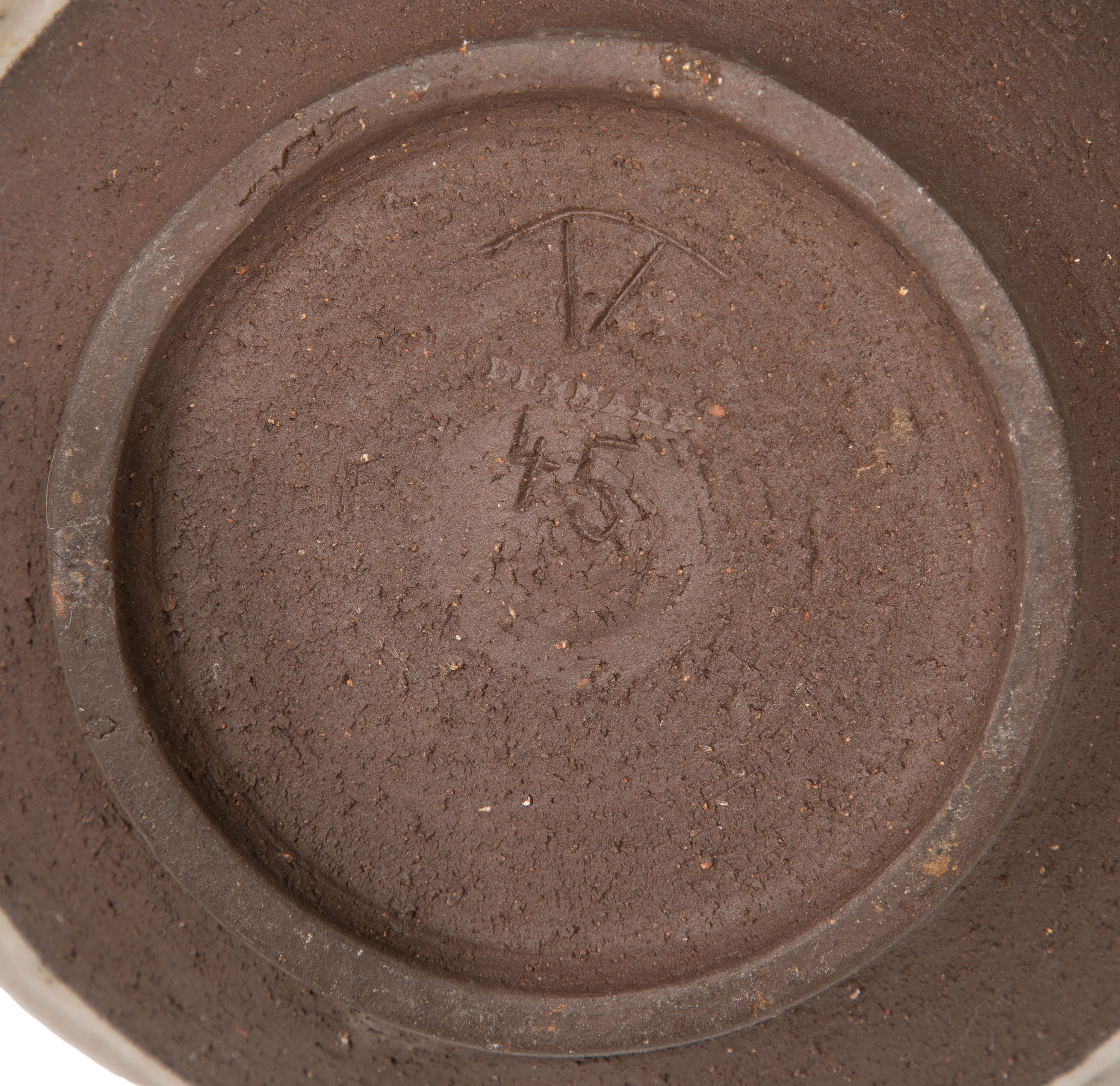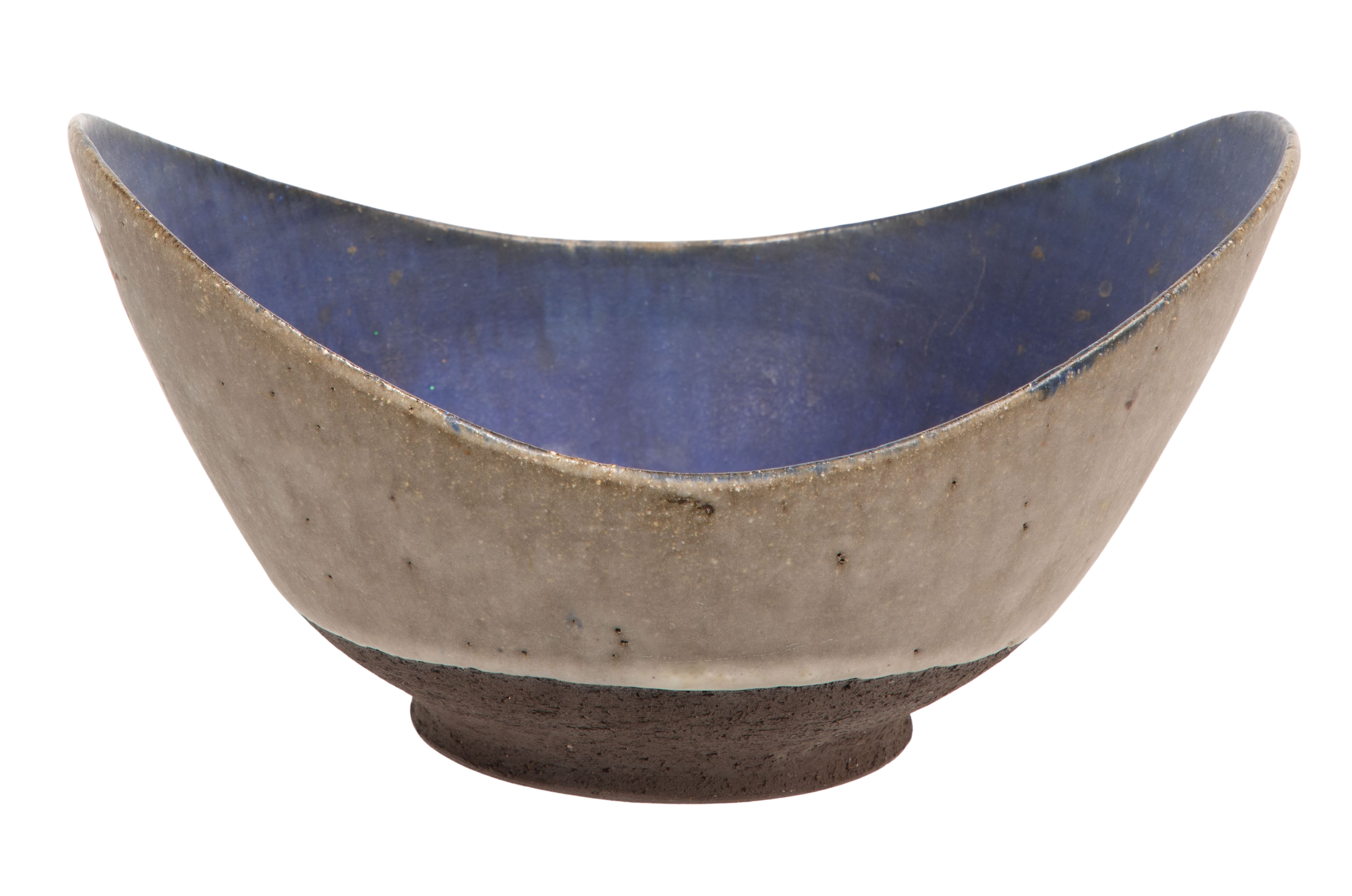 Boat-form bowl having a round unglazed brown ware foot transitioning to an elliptical form having raised ends, a tan glaze to exterior and dark blue interior, incised initials, number ’45’ and impressed ‘Denmark’ underside