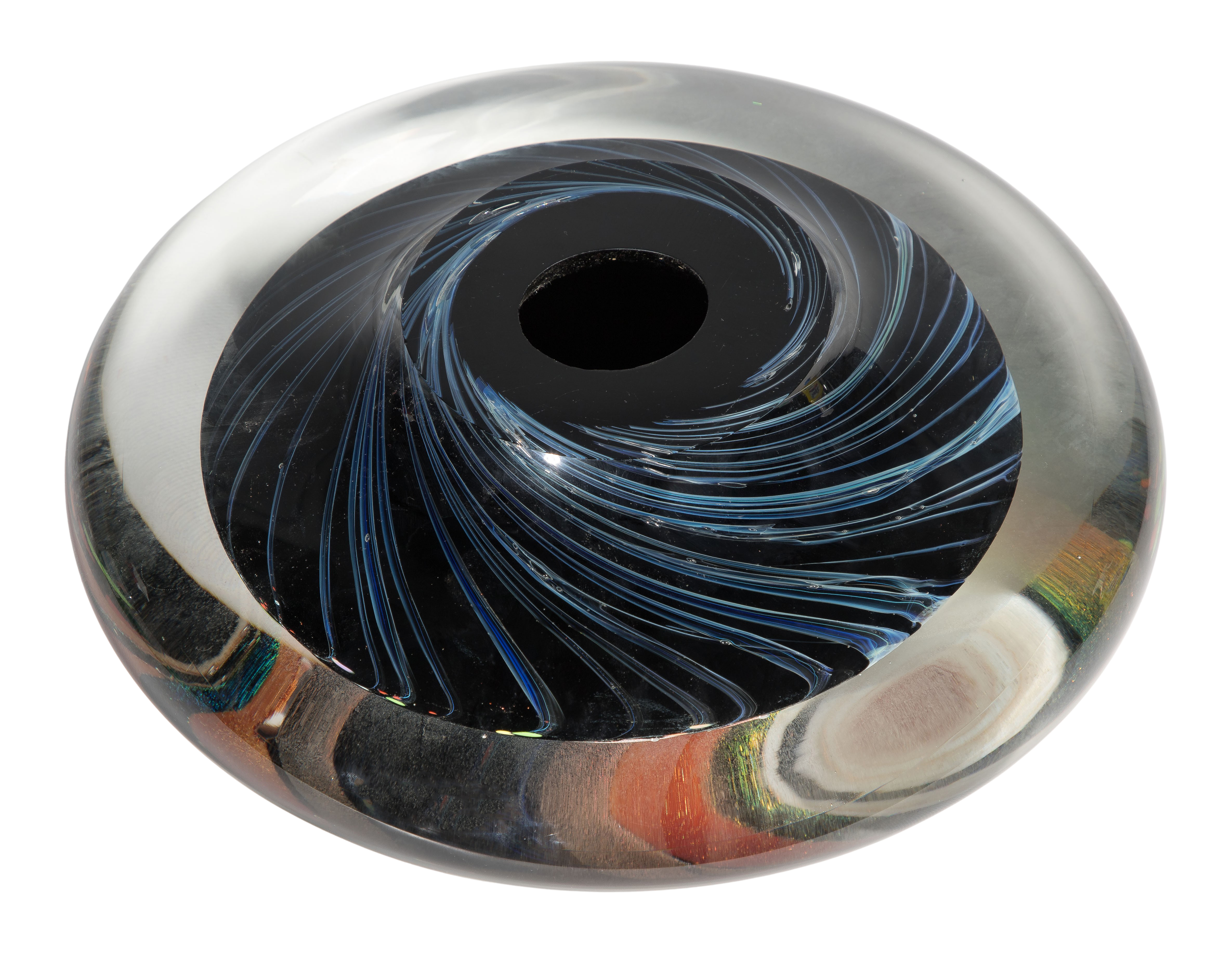 Undated, unsigned, blown glass having multi-color dichroic and cane elements cased in clear glass, ground and polished underside having opening at center