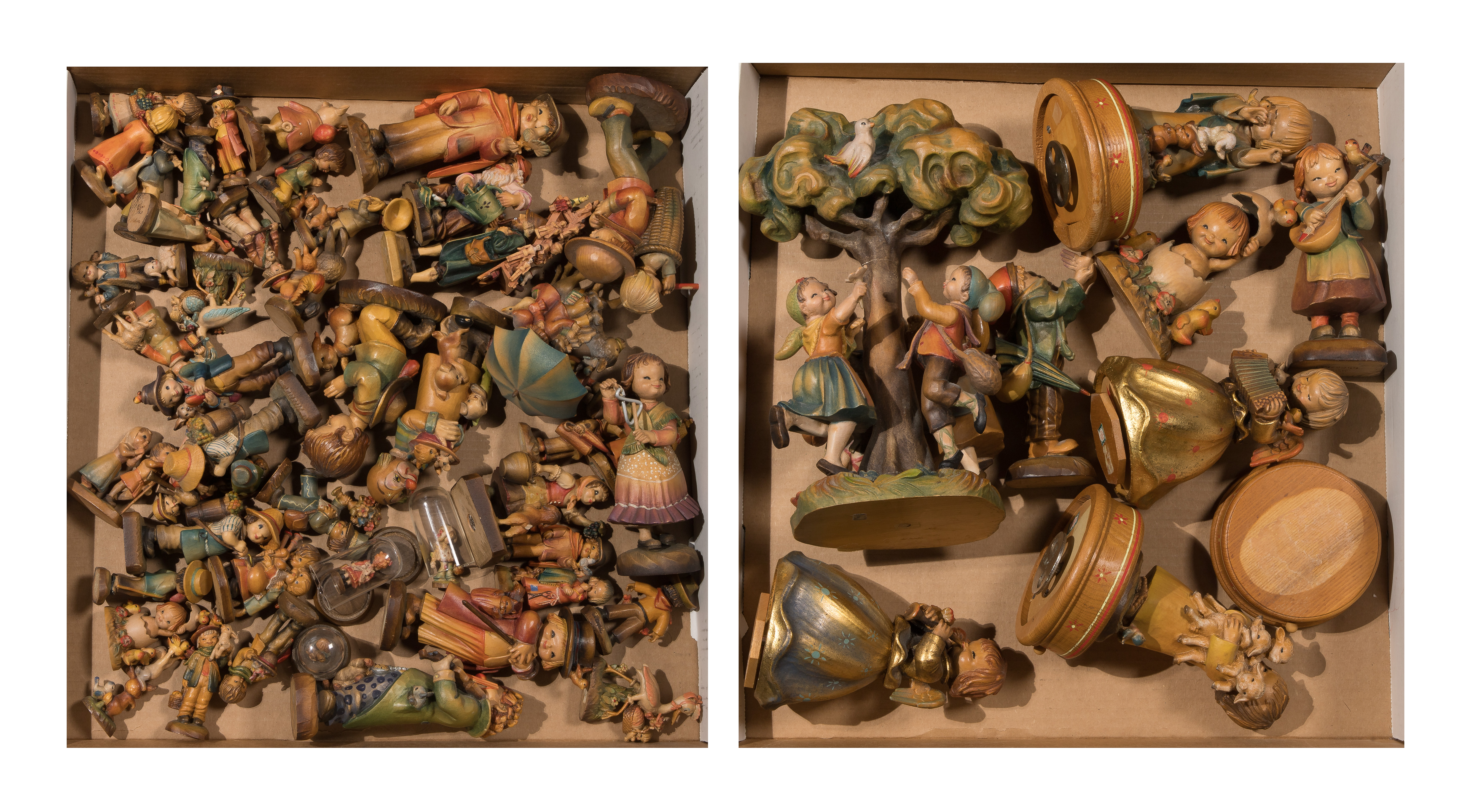 Approximately (50) hand carved and painted figures in various shapes, sizes and styles, some having music boxes, all marked
