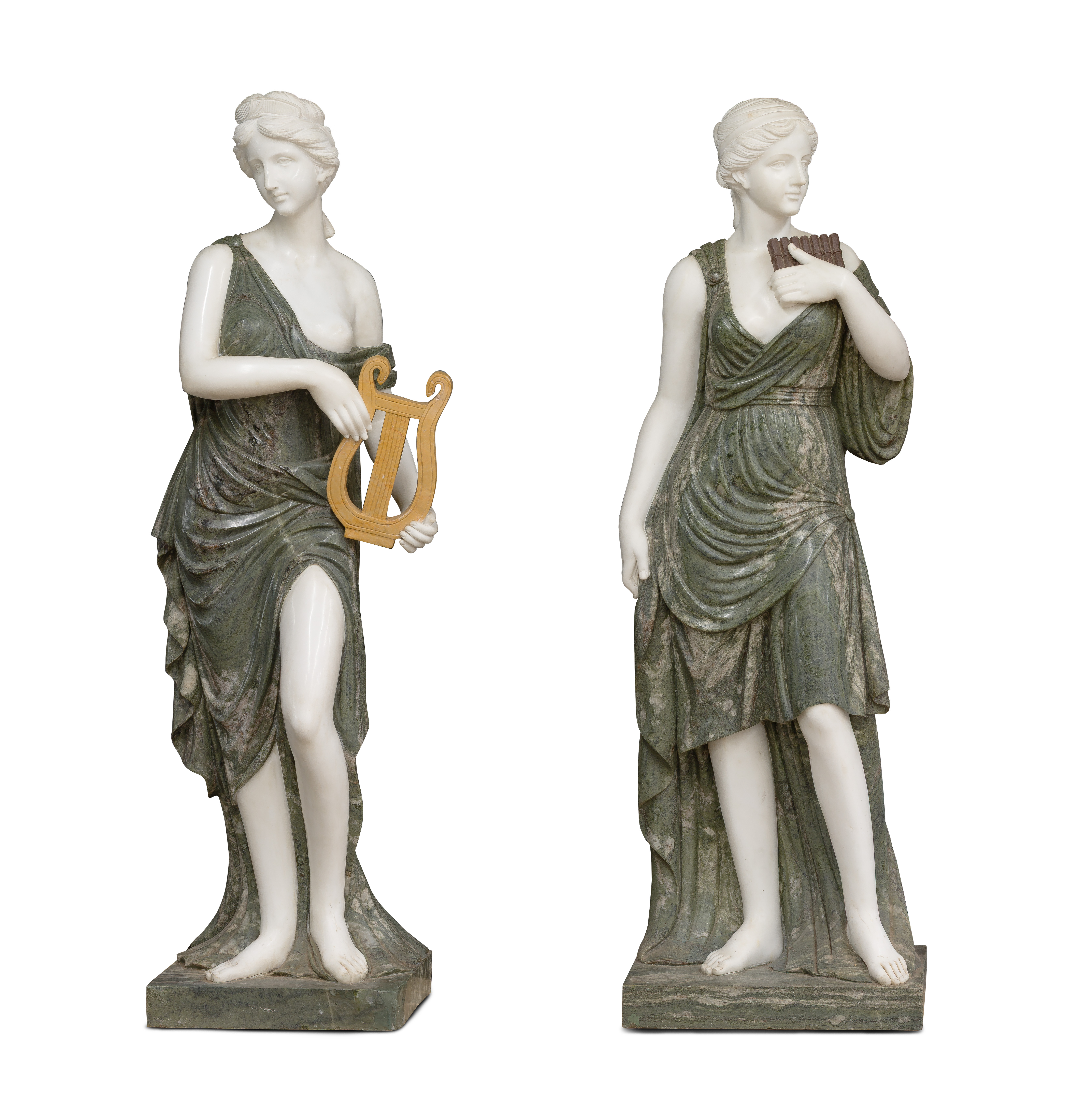 (2) life size items made from two types of marble, one holding a pan flute and the other holding a lyre, on square marble bases