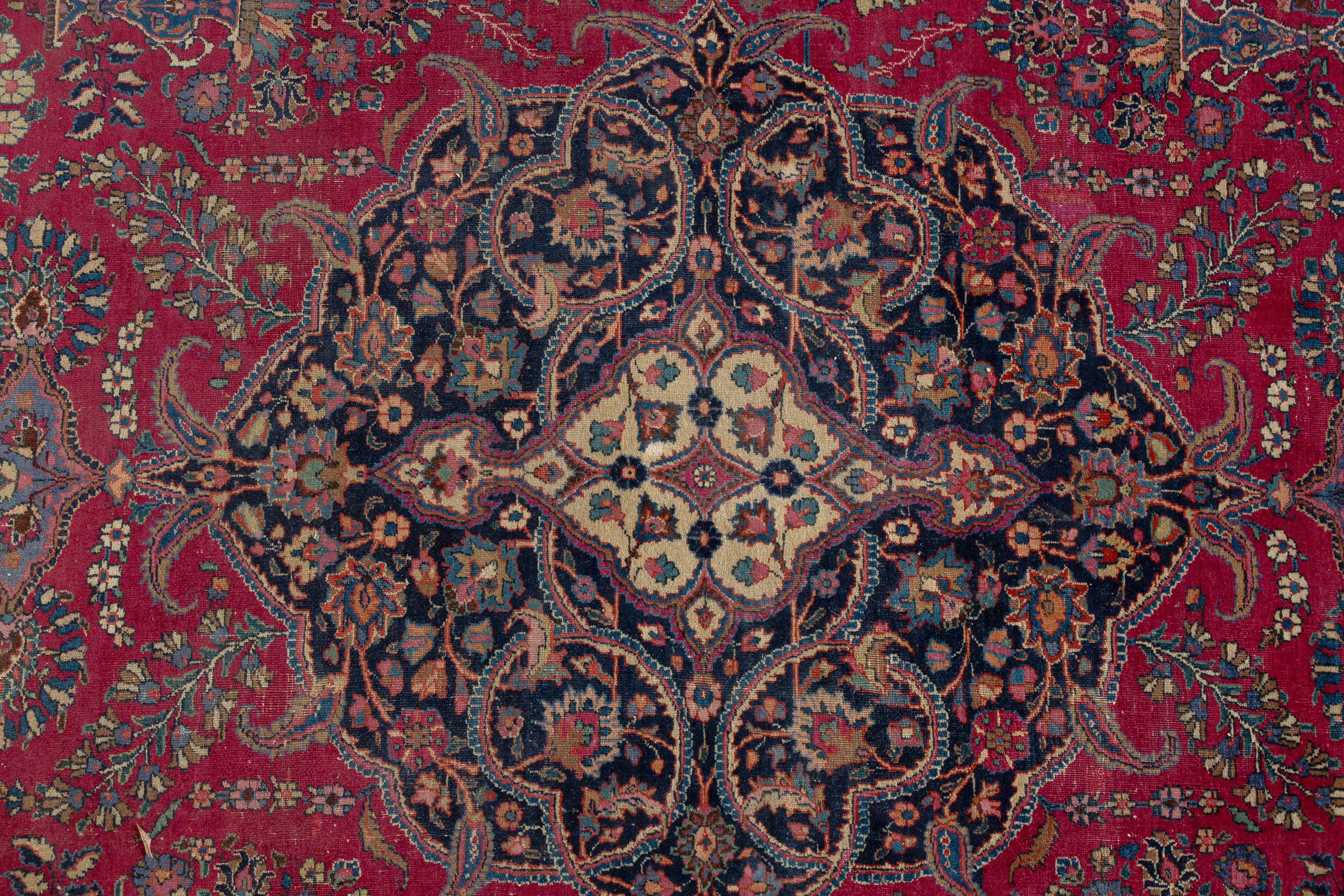 Hand woven in a floral design having center medallion in hues of cream, tan and blue on a red field