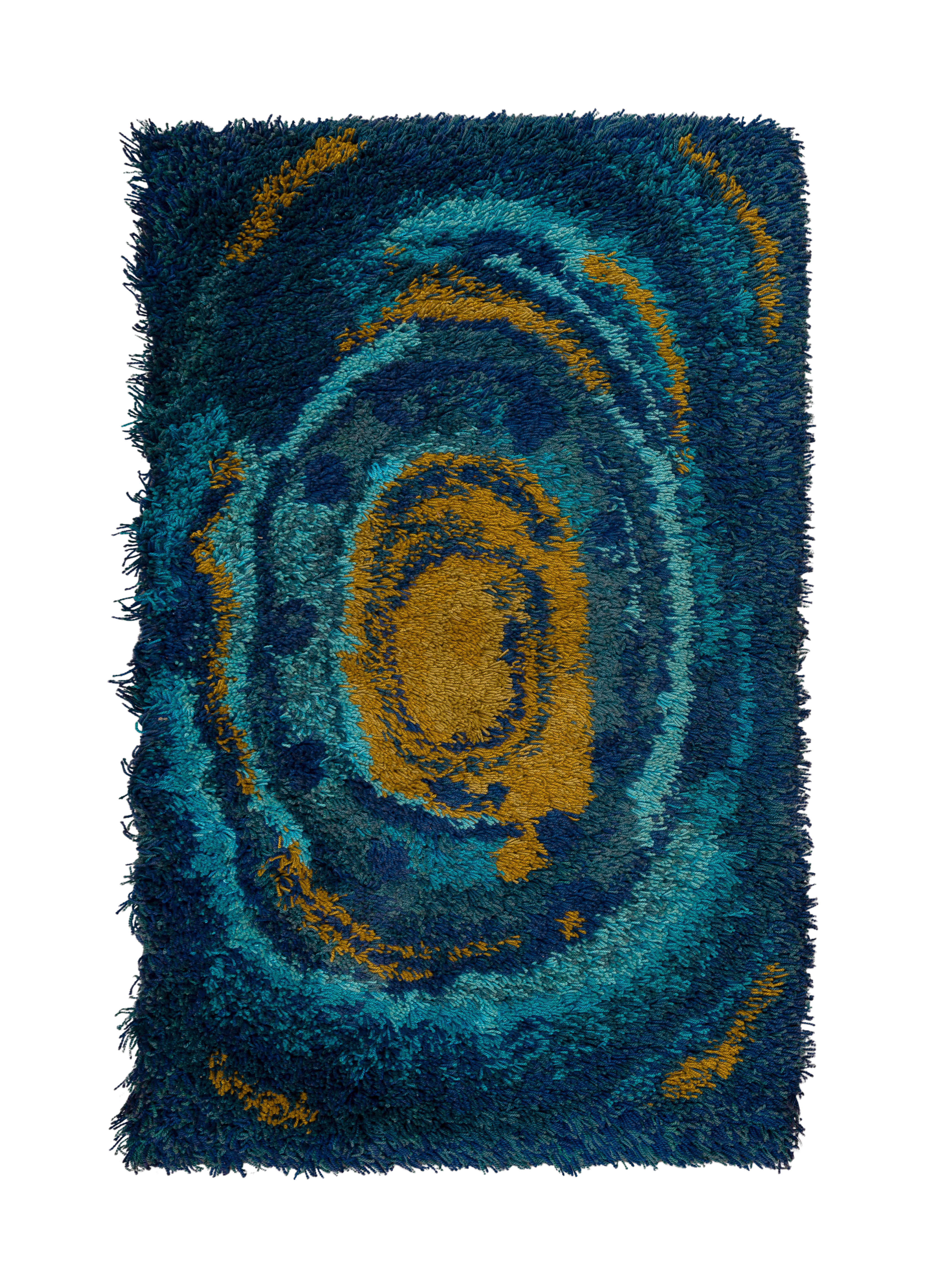An abstract Scandinavian wool rug having a long pile in hues of blues, greens and golds