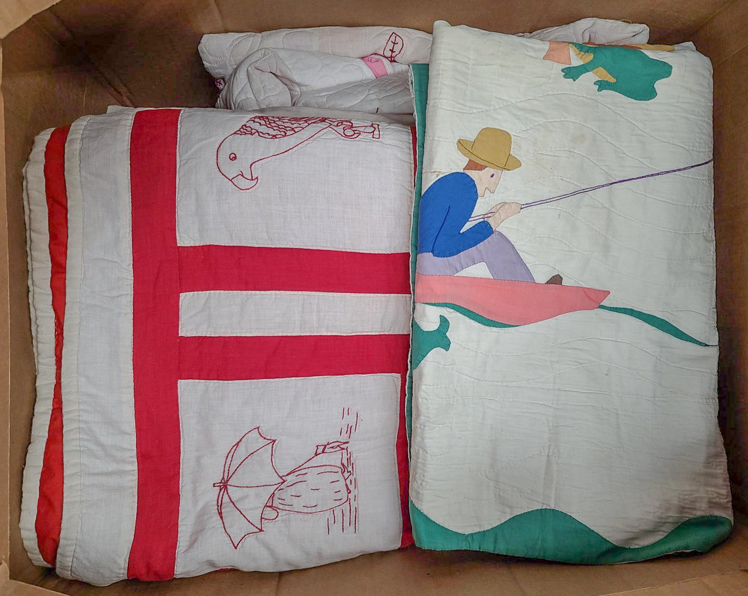(17) items of various colors, patterns and decorative techniques, mostly linear stitched embroidery storybook and animal motifs, some pictorial pieced applique imagery
