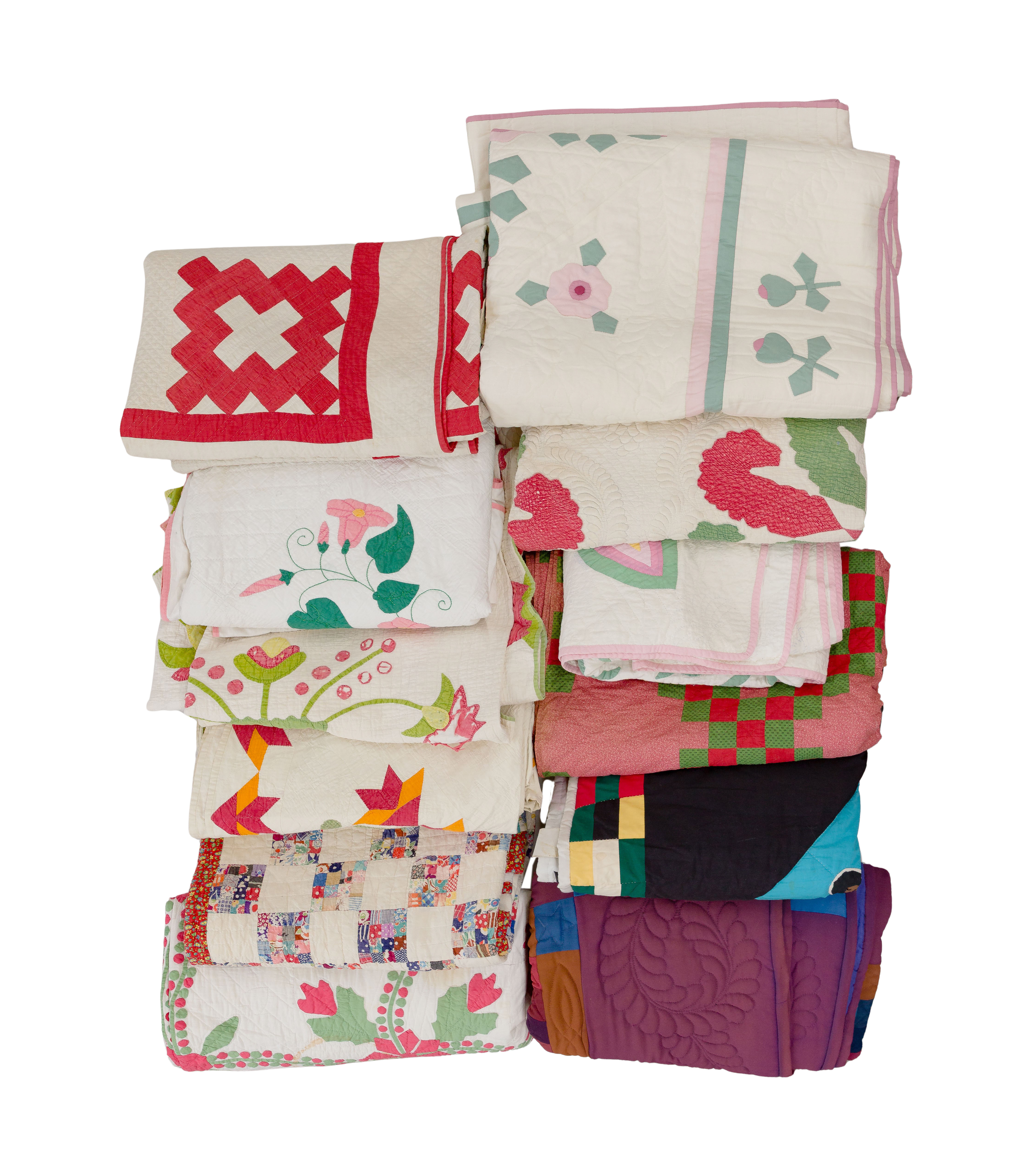 (12) items of various shapes, sizes, eras, colors, patterns and materials, most hand stitched