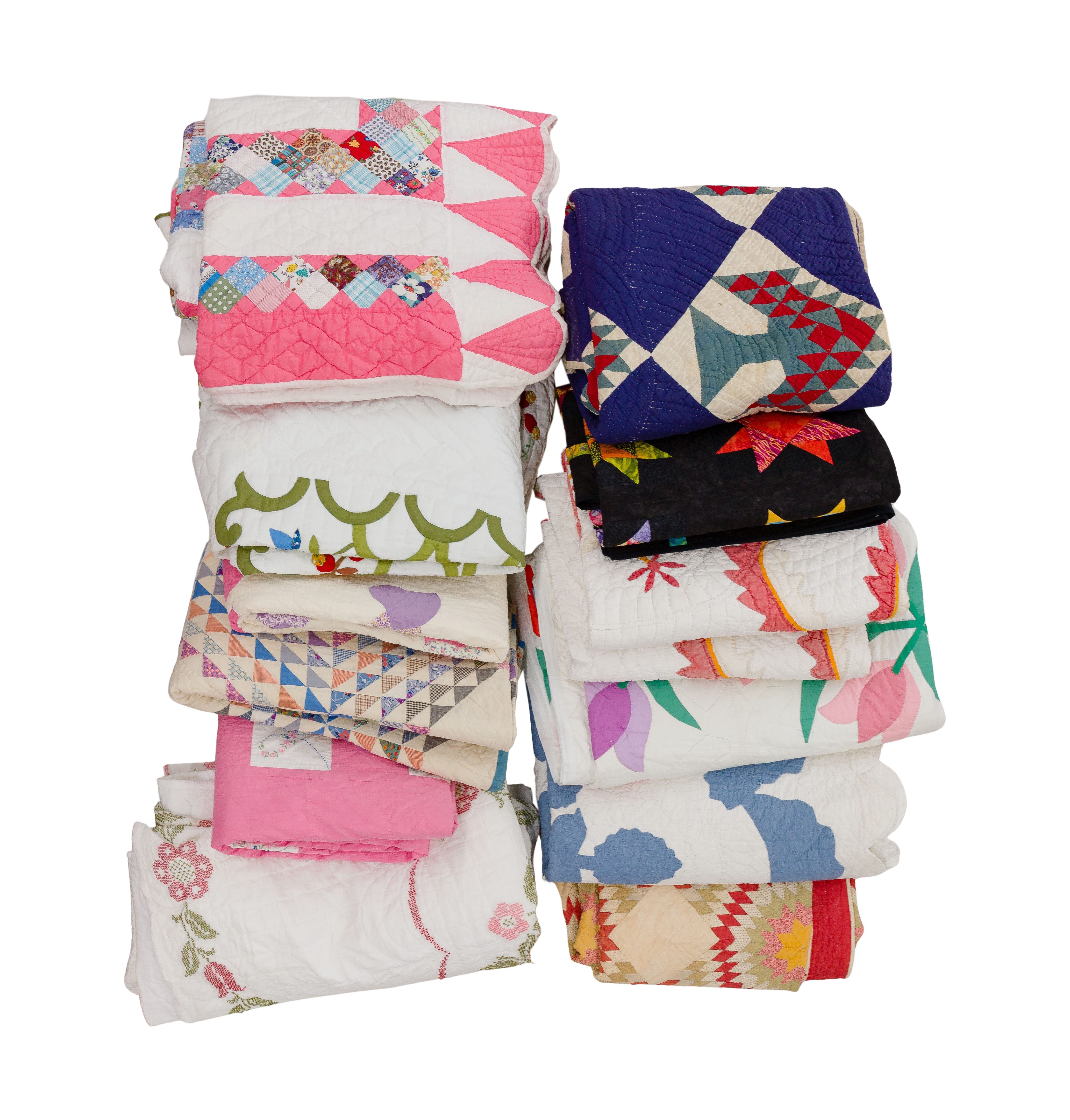 (12) items of various shapes, sizes, eras, colors, patterns and materials, most hand stitched