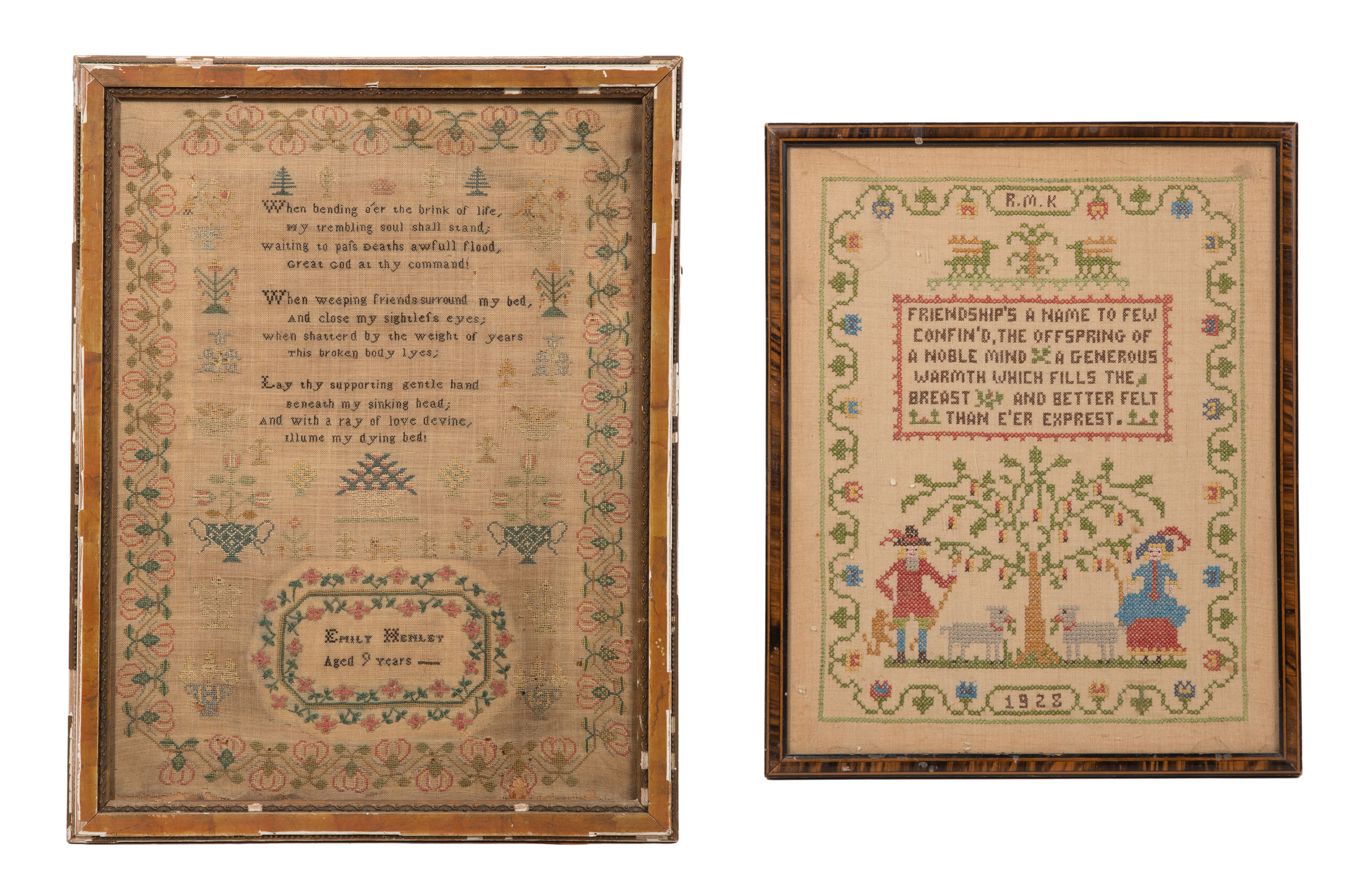(2) items including an undated by ‘Emily Henley / Aged 9 Years’ having a devotional poem within a floral border in a wood frame (lacking glass) and a cross-stitch having devotional poem above a tree flanked by a shepherd and a shepherdess, initialed ‘R.M.K.’ at top and dated ‘1928’ at bottom of floral border, behind glass in a wood frame retaining a Marshall Field’s label verso