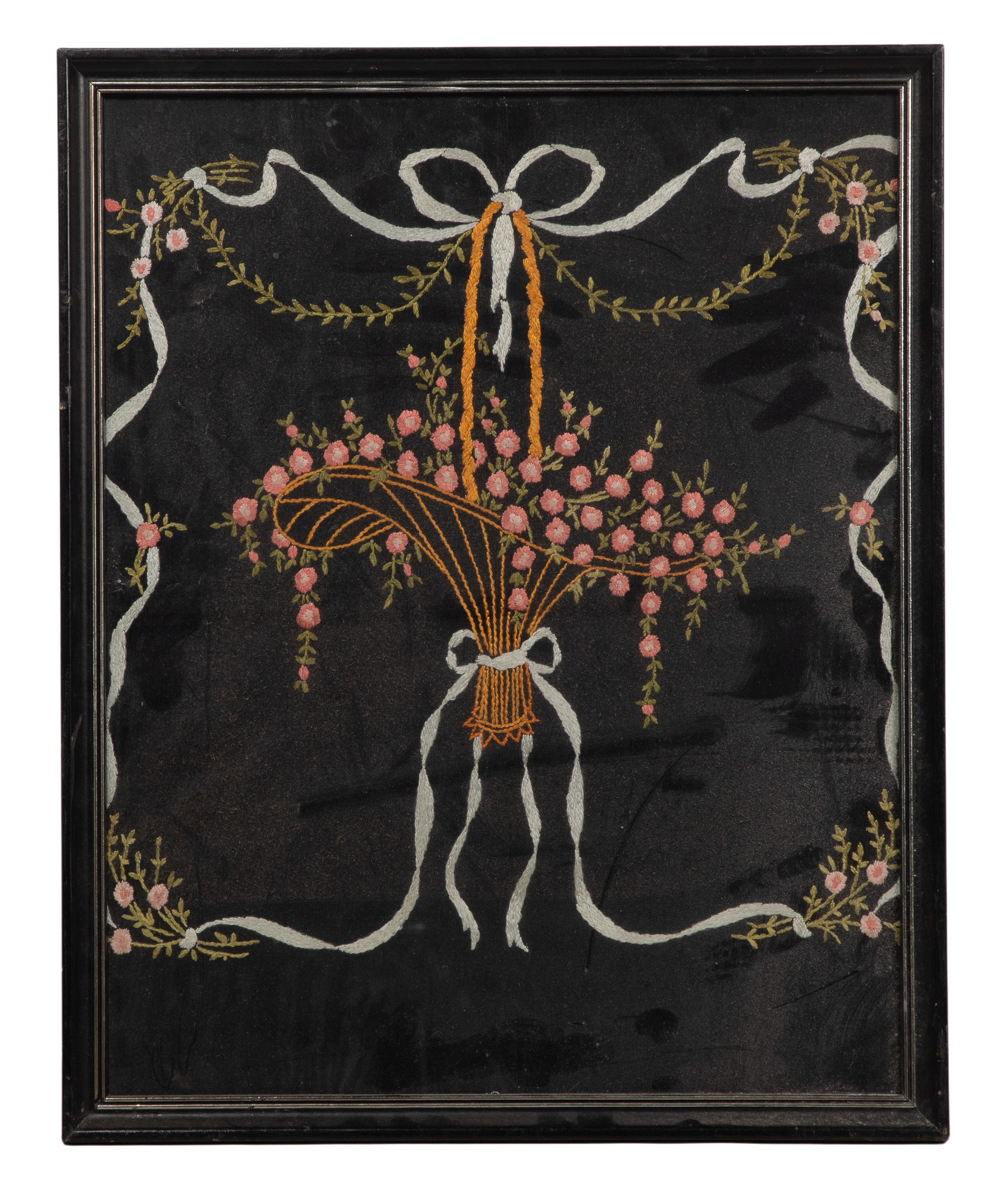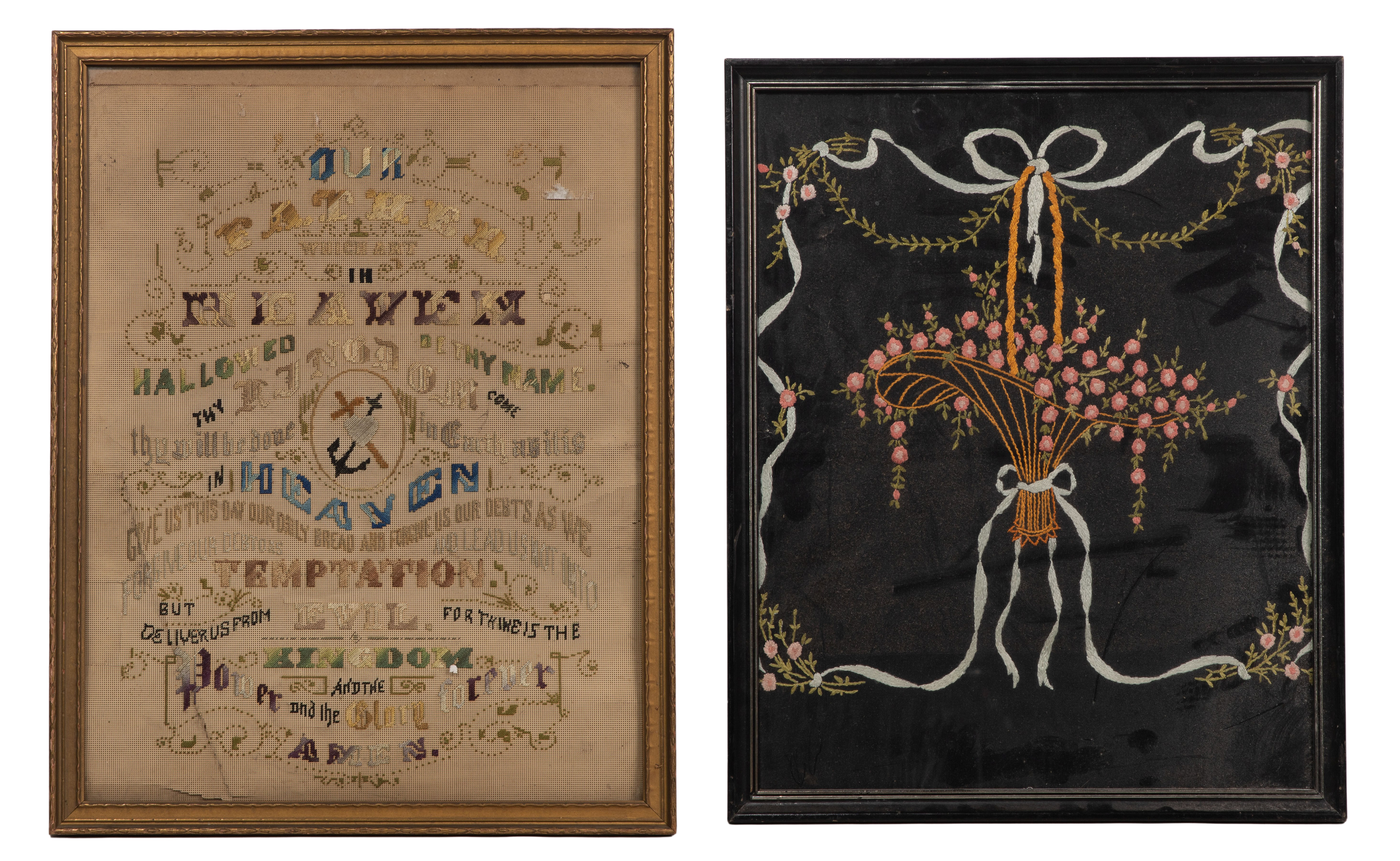 (2) items including a silk embroidered flowers and bows as well as a counted cross-stitch of The Lords Prayer, both under glass in wood frames