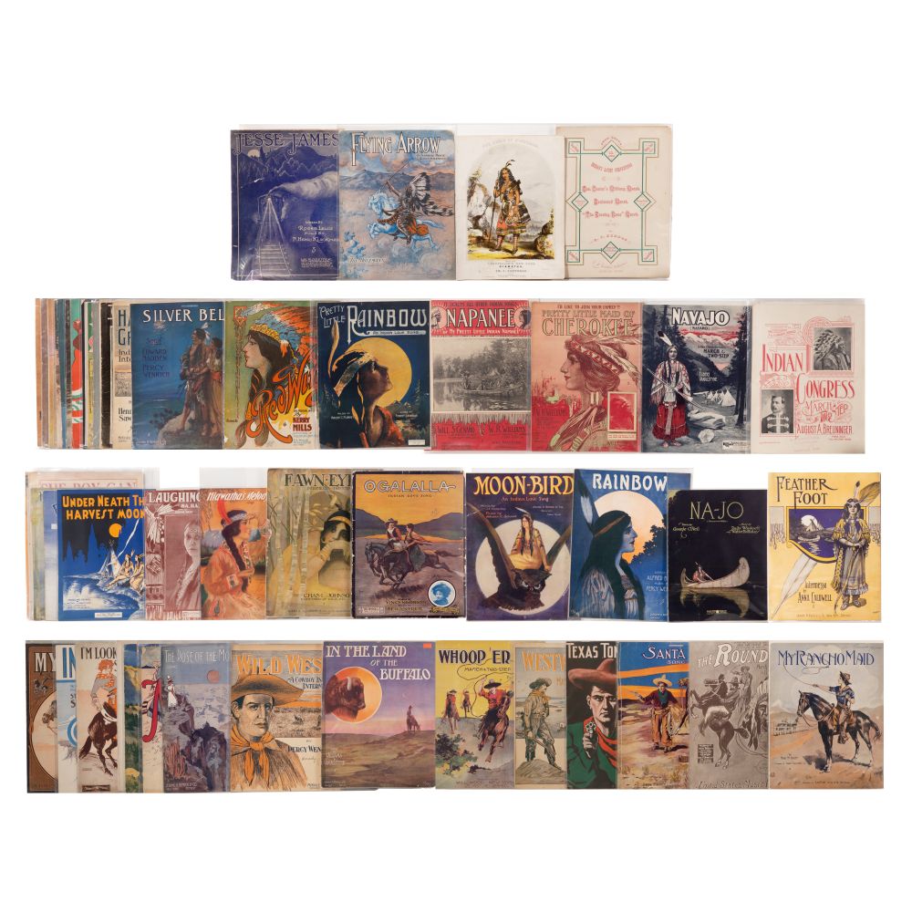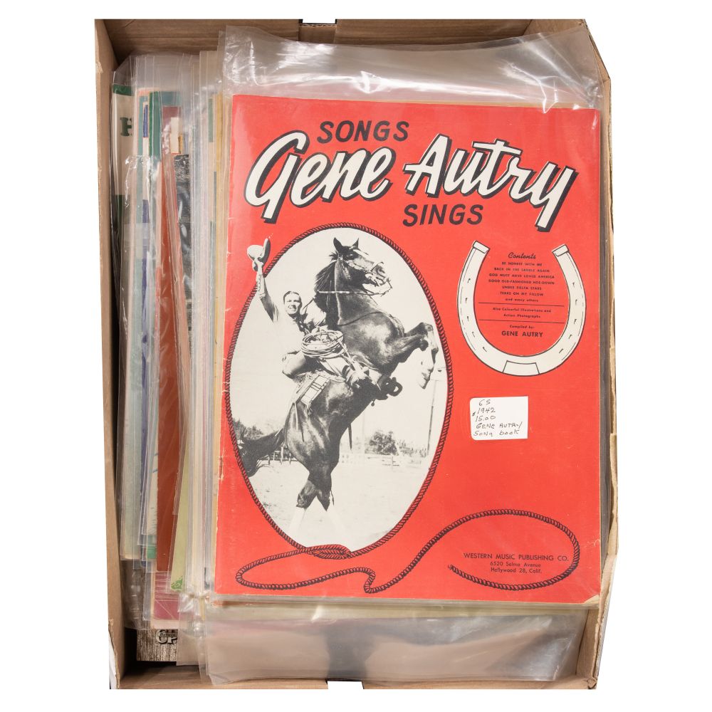 Approximately (175) items of sheet music, including Gene Autry, Jenny Lou Carson, Kings of Country, some covers having vibrant lithographic art illustrations, most stored in plastic sleeves