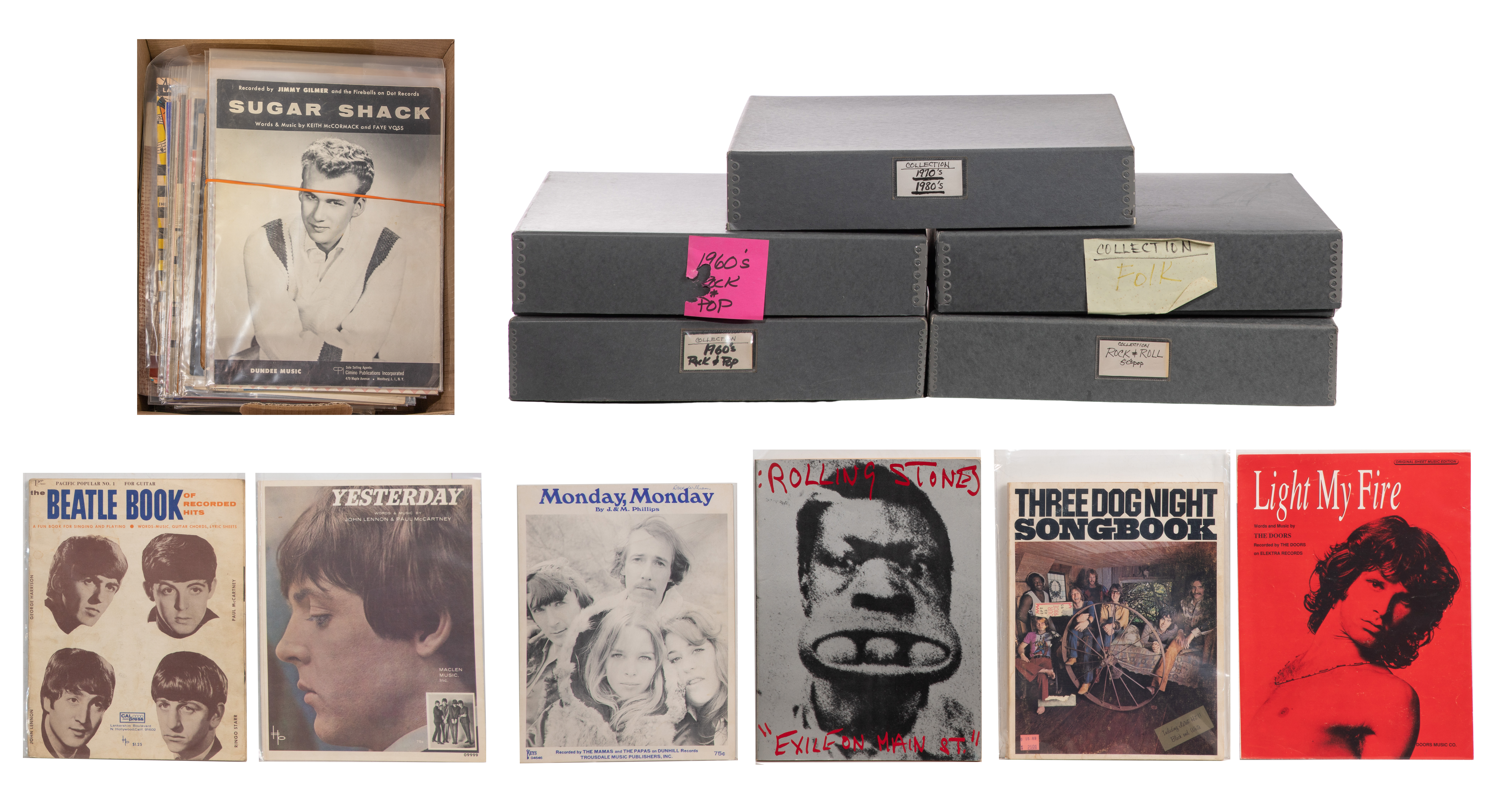 Approximately (400) items of sheet music, spanning 1950 to 2000, including folk, pop, Motown and rock and roll from artists such as The Beatles, The Rolling Stones, Three Dog Night, Joan Baez, Bob Dylan, The Supremes, most stored in plastic sleeves