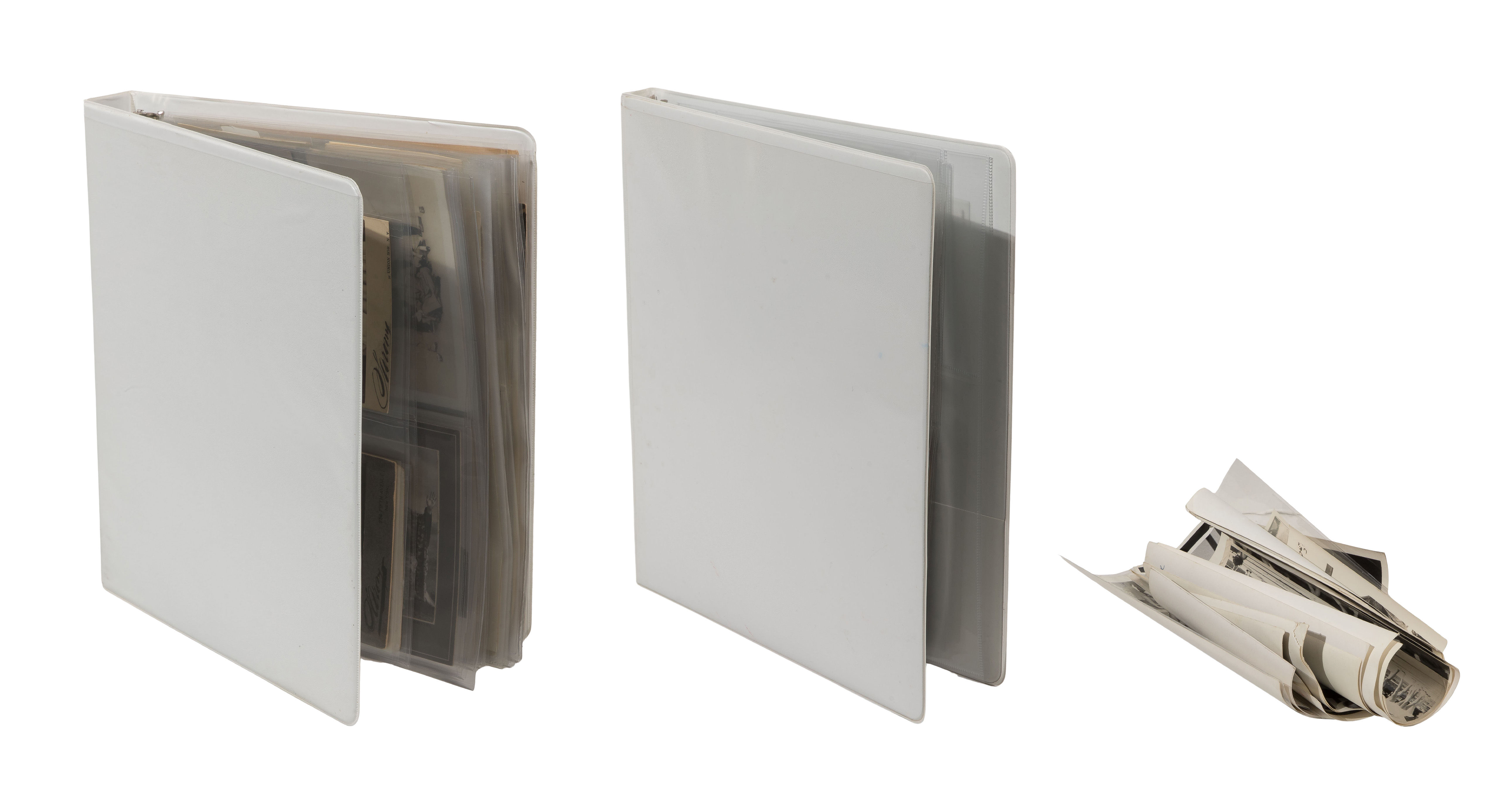 Condition: overall light wear consistent with normal use, loose photographs warped from being stored rolled