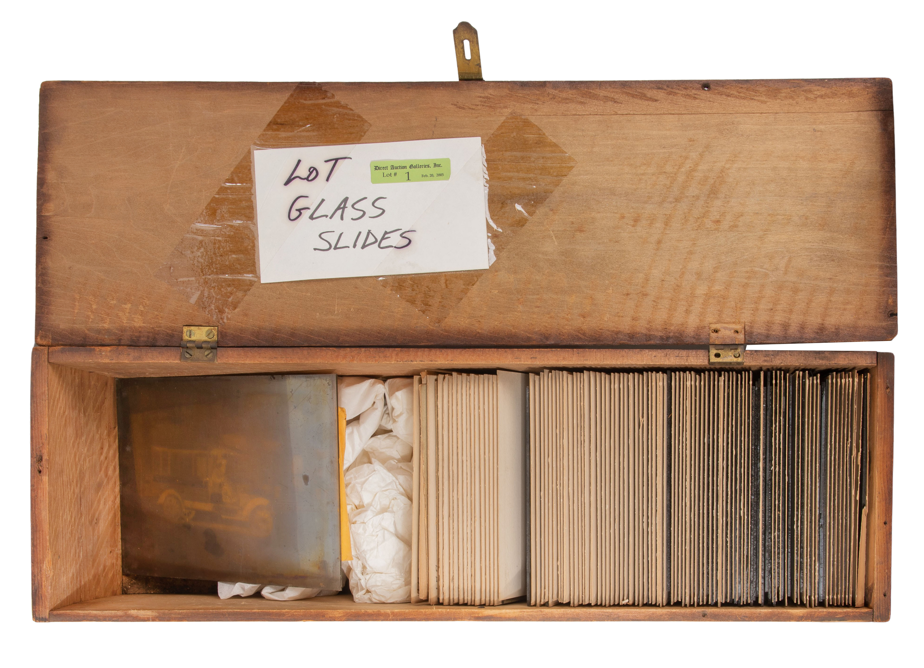Approximately (95) items depicting a variety of subjects including transportation, scenic wonders, architecture and people, separated by paper dividers in a wood storage box retaining a Direct Auctions, Chicago label