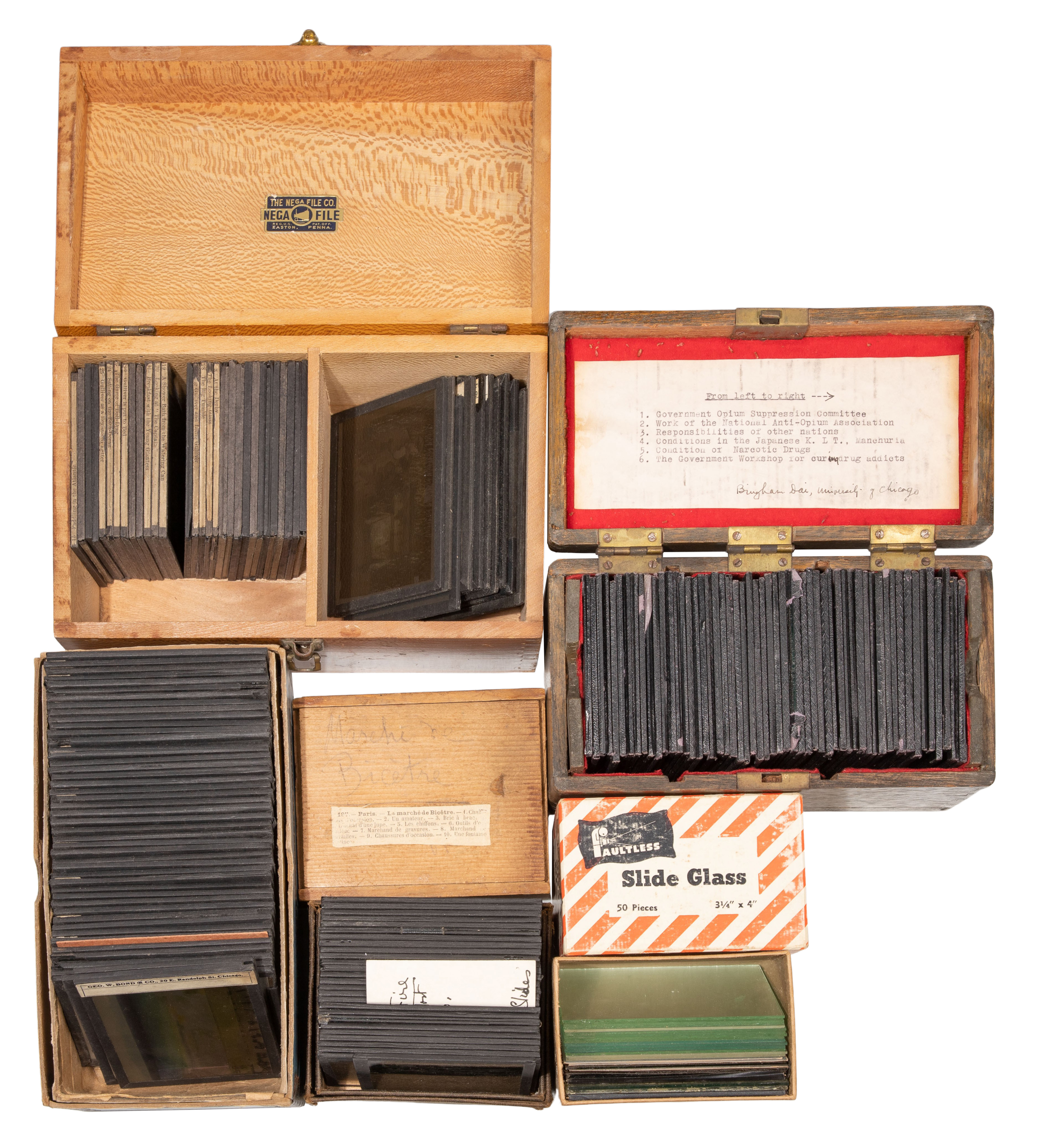 Approximately (200) items of various sizes and subjects including scenic, opium dens, New York factory fire, most in boxes